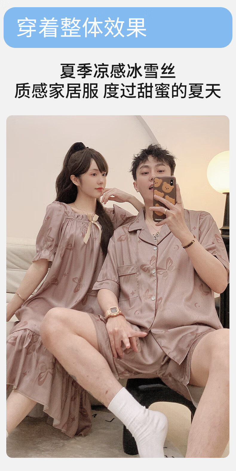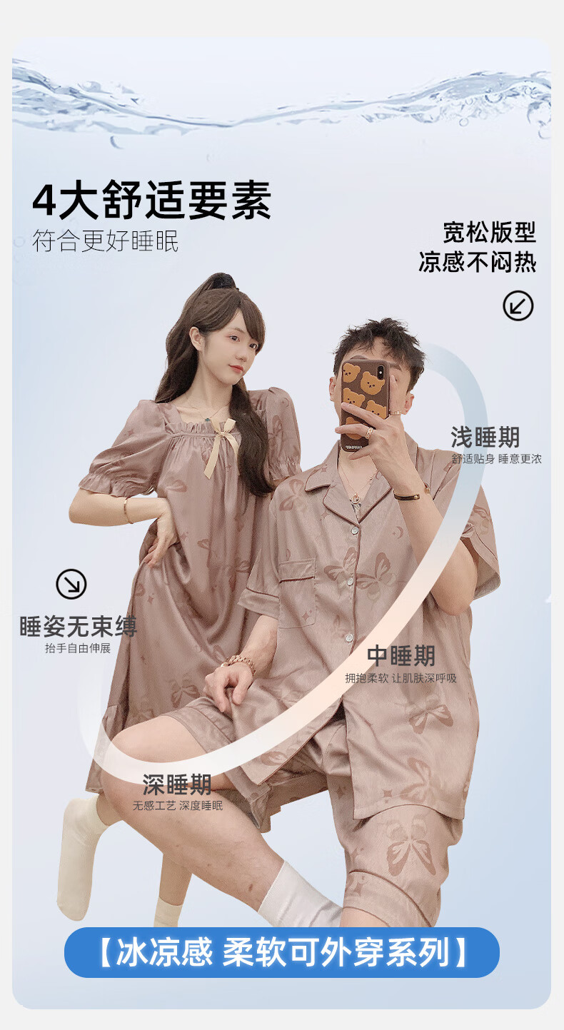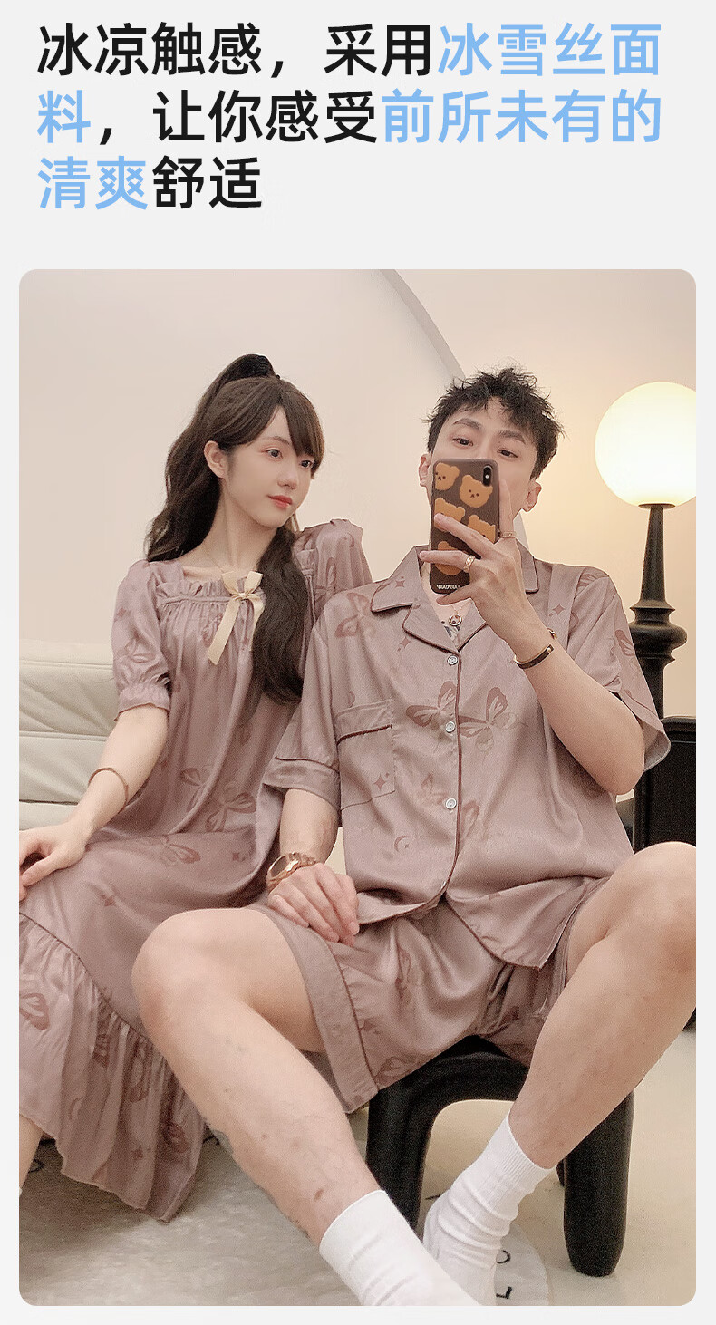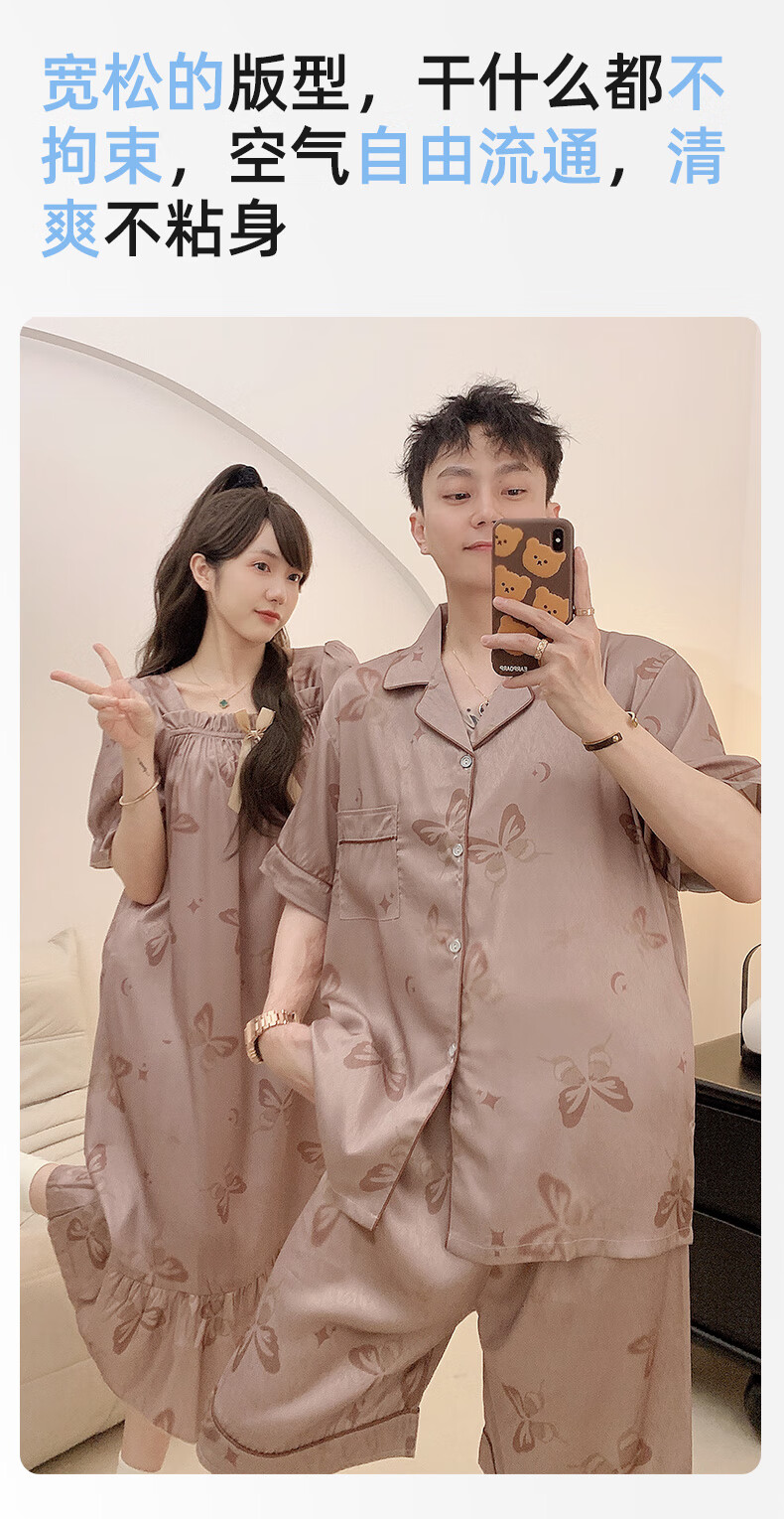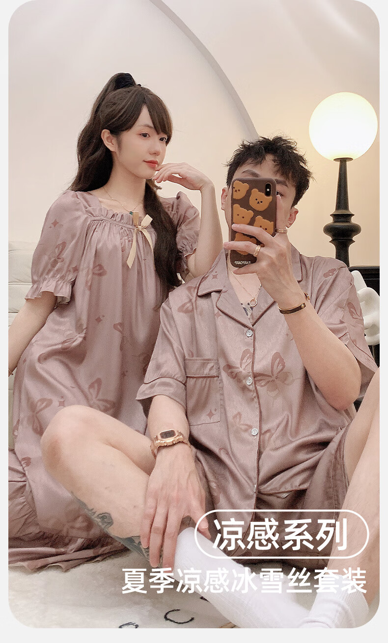 雅鹿冰丝情侣睡衣夏季短袖睡裙女士薄款凉爽男士轻奢可外穿家居服套装 13076-13077 M 女送男L