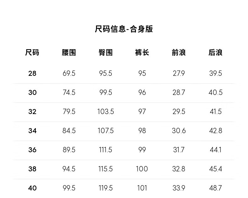 Outseam (cm) 99 cm 101.5 cm 104 cm 106.5 cm 109 cm