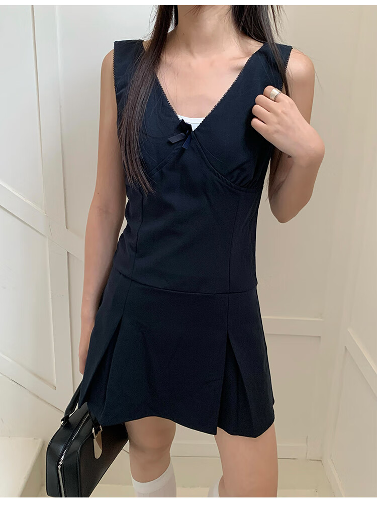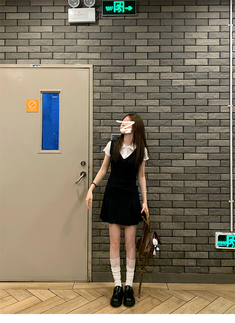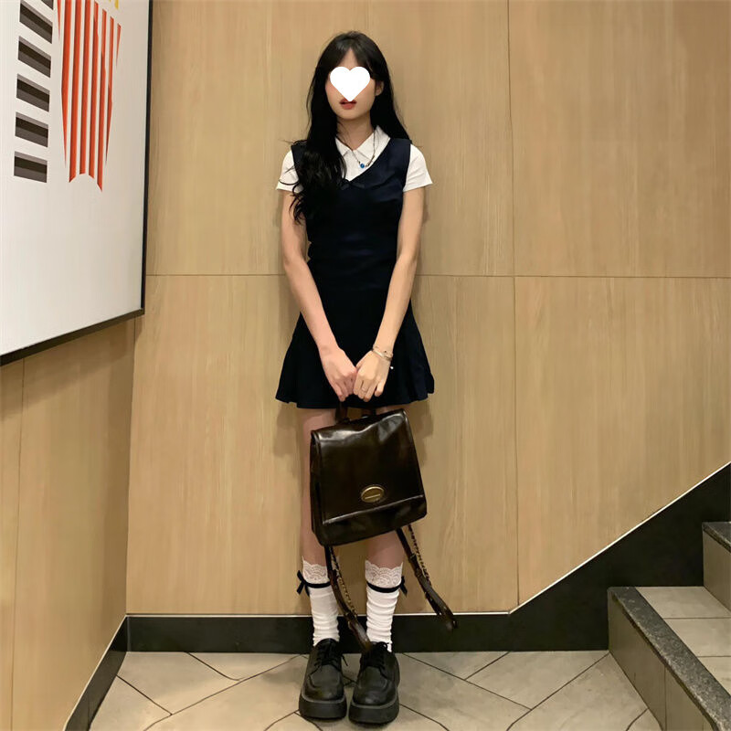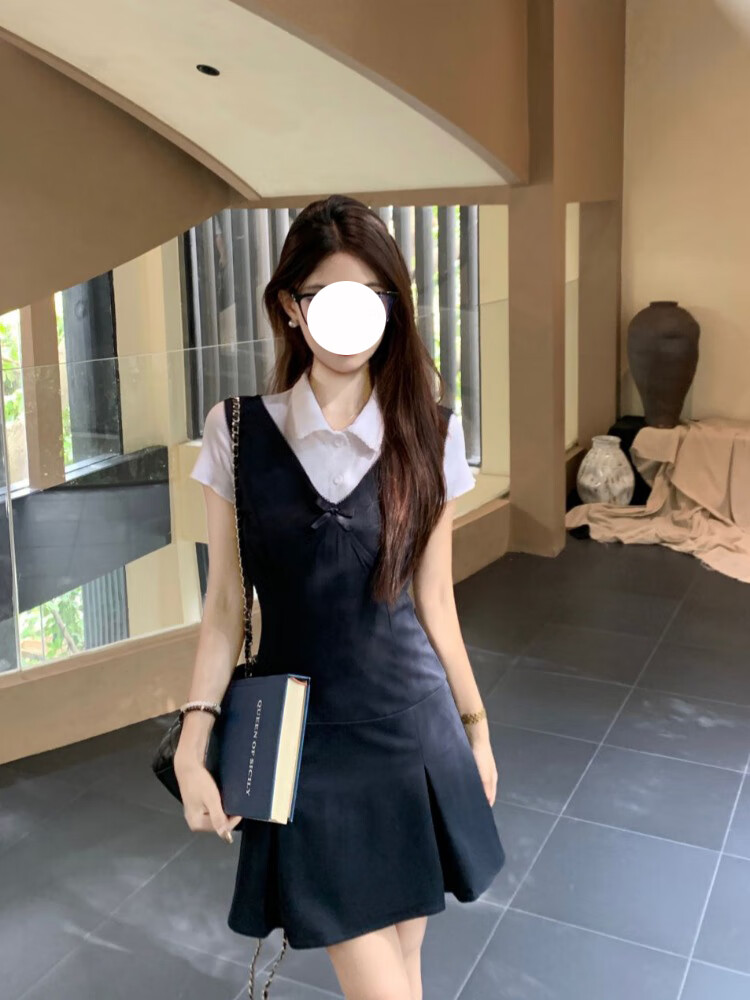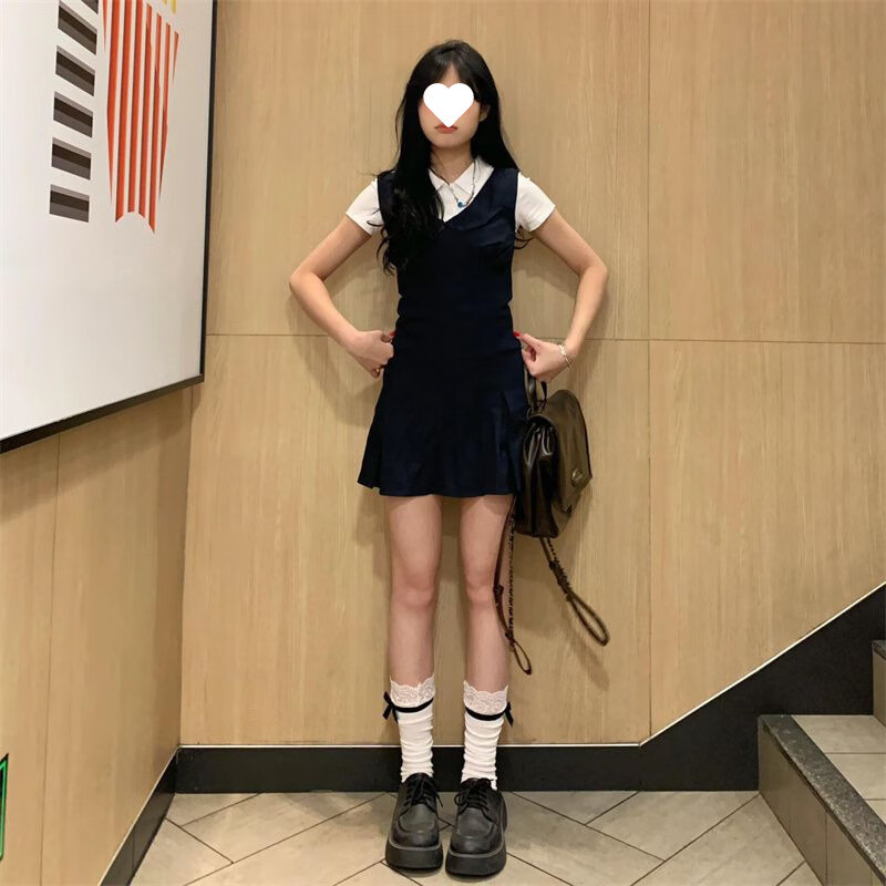 乐卡利学院风套装韩系无袖背心连衣裙吊带夏内搭白短袖T恤上衣A字短裙子 学院风套装【白上衣+背心裙】 L (115斤内)