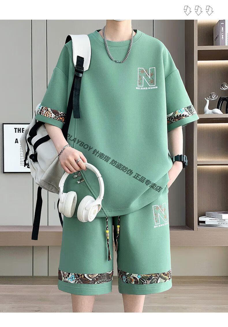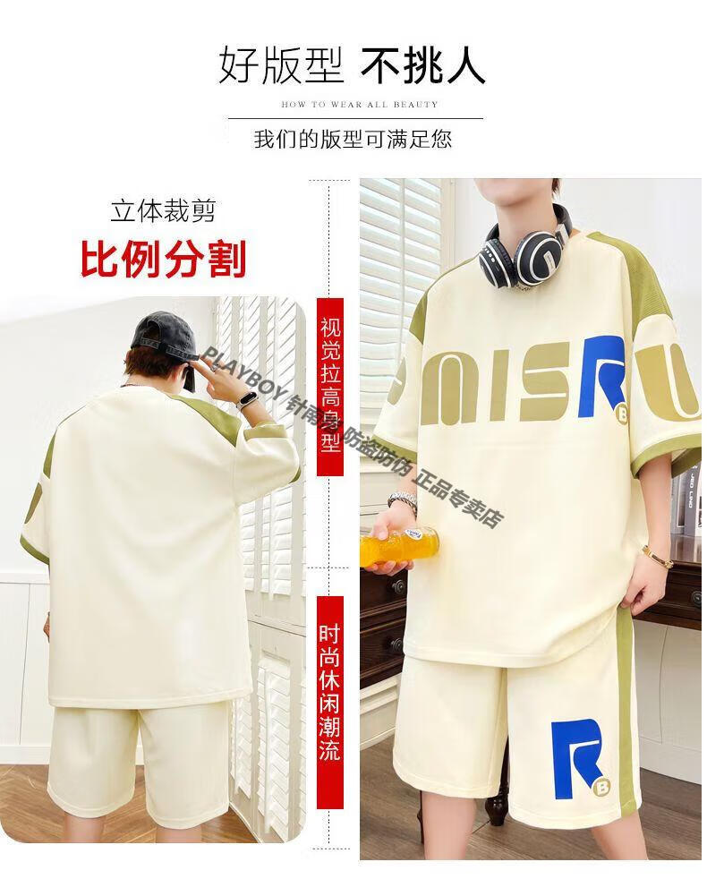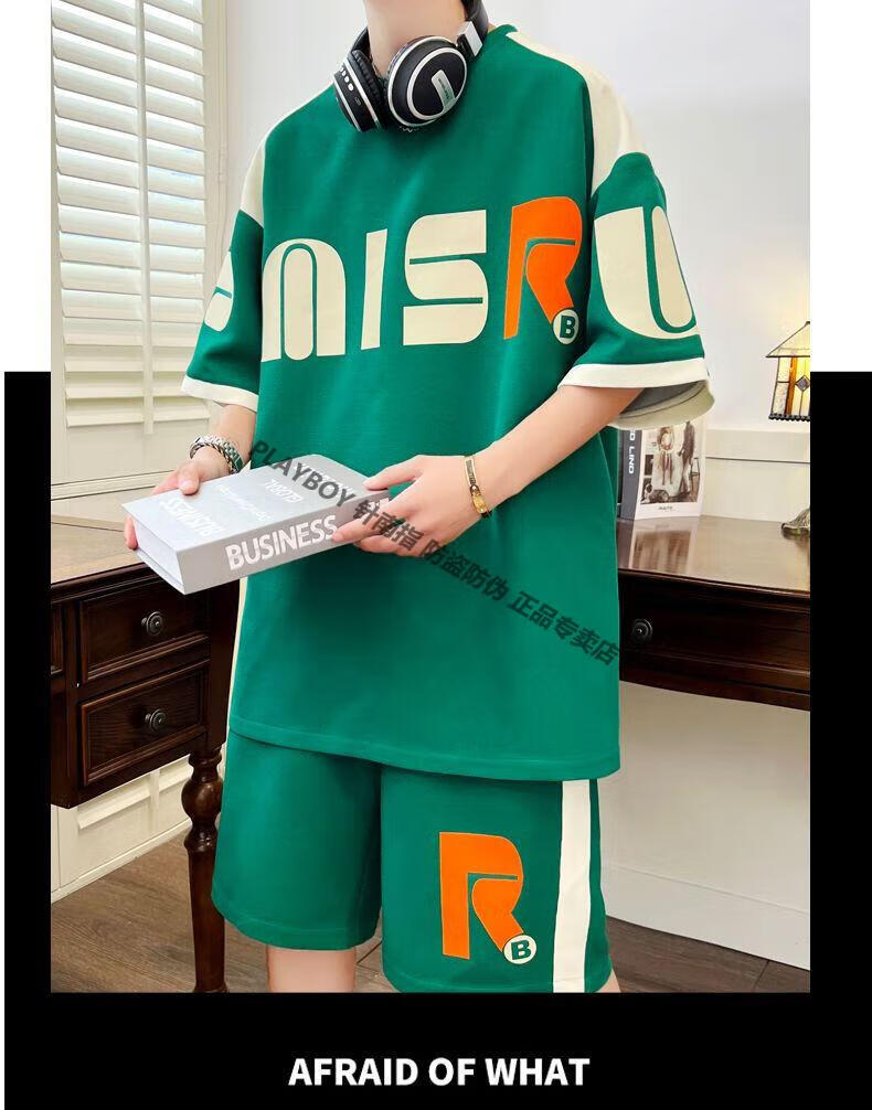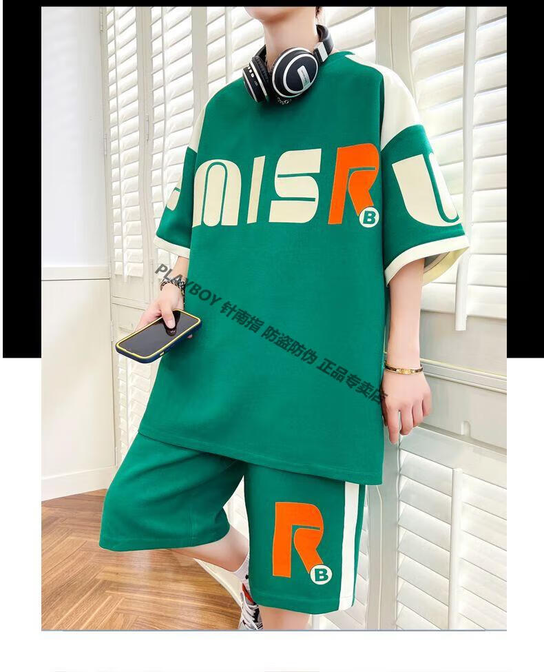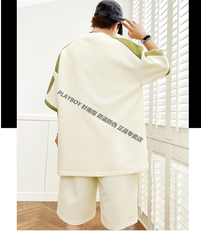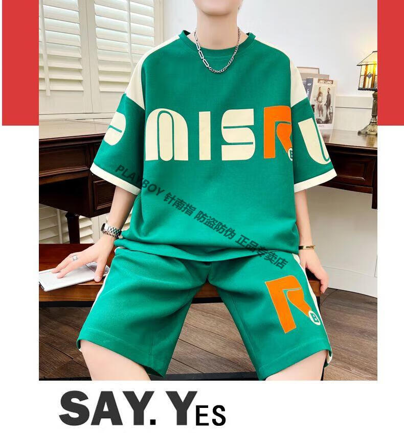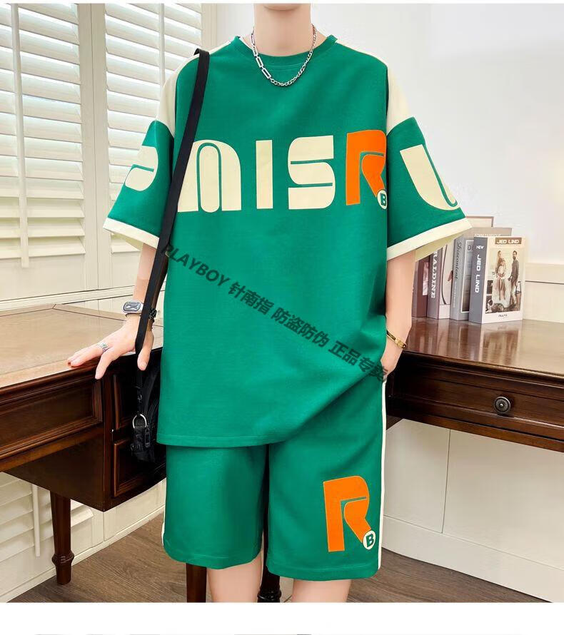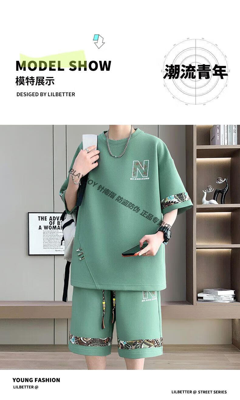 花花公子(PLAYBOY)短袖短裤套装男夏季潮流男款一套男士休闲运动男装一整套夏装 YYW6195绿色套装 品质保证 4XL 建议180-200斤