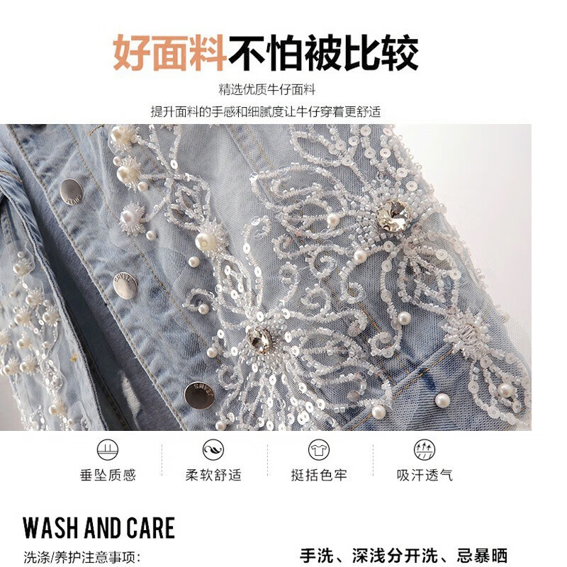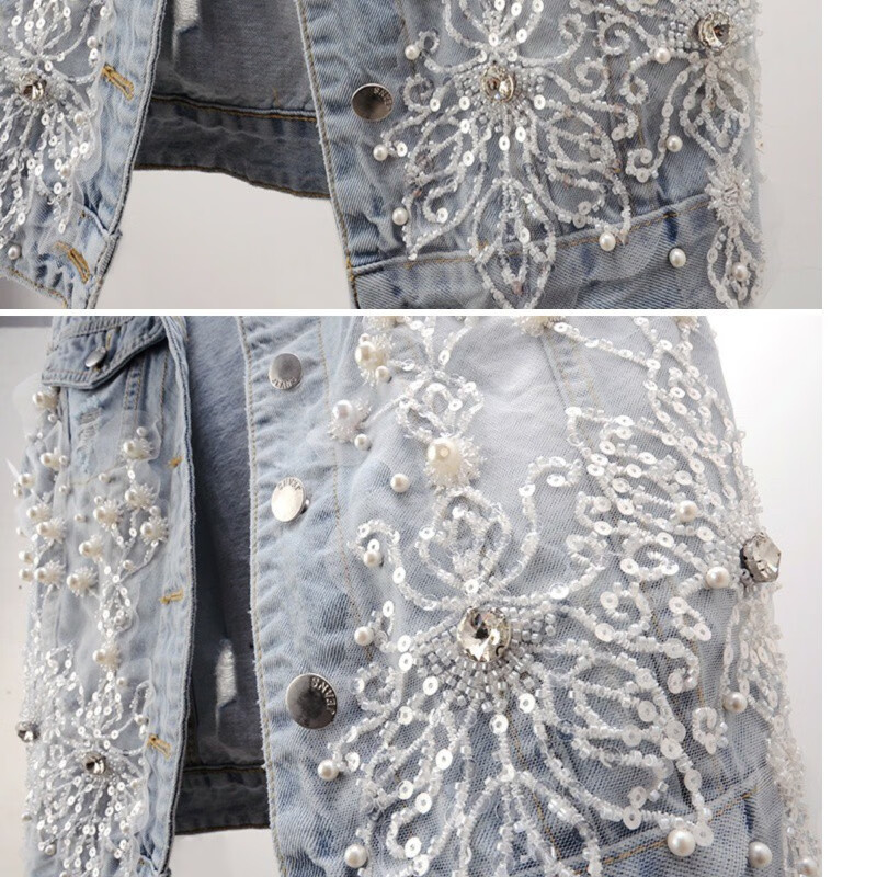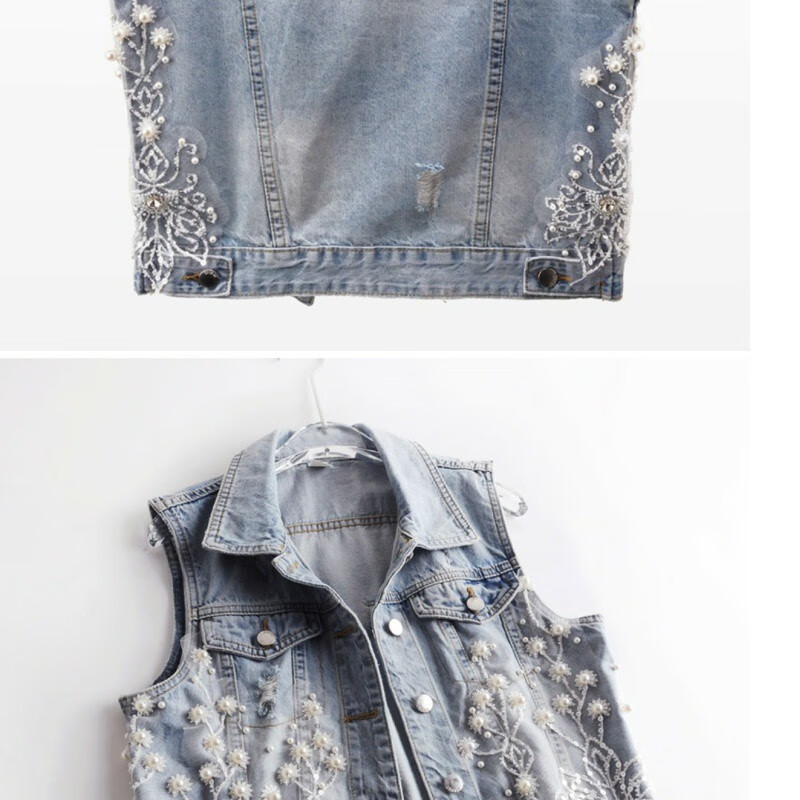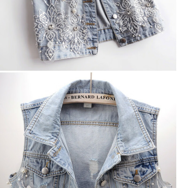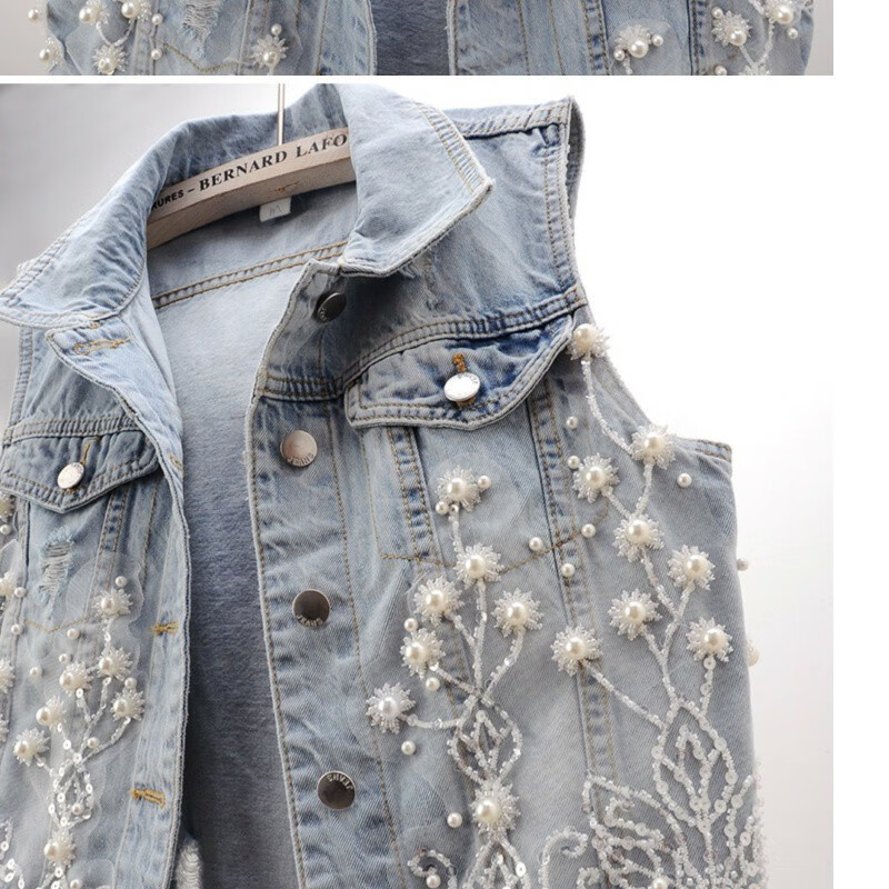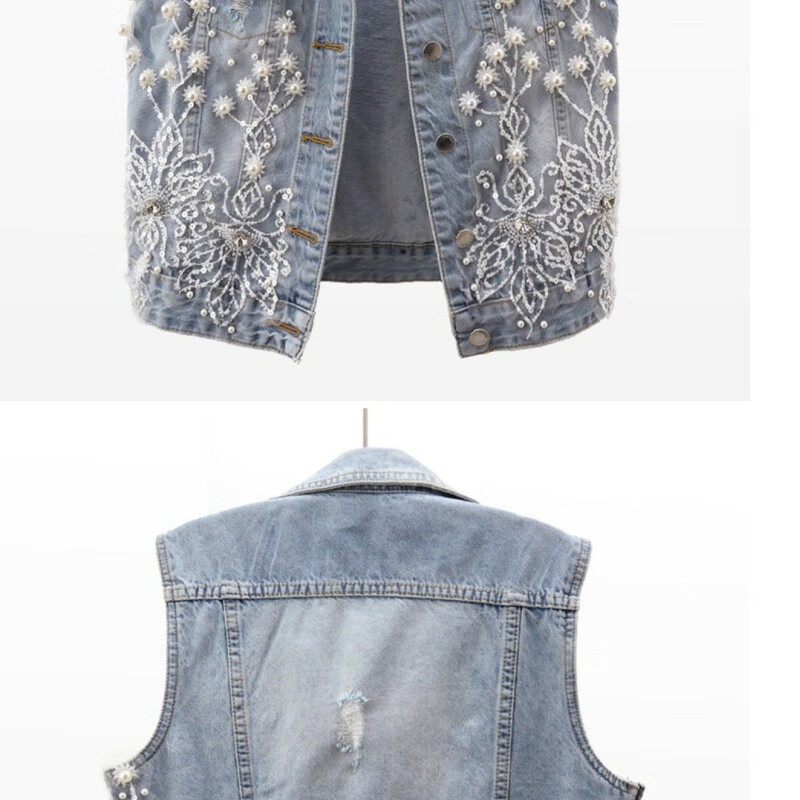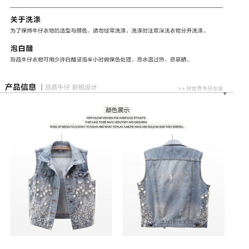 单南卫2024年春夏新款重工钉珠花朵牛仔马甲女短款破洞马夹背心坎肩上衣 浅蓝色 3291# S  建议体重95斤下
