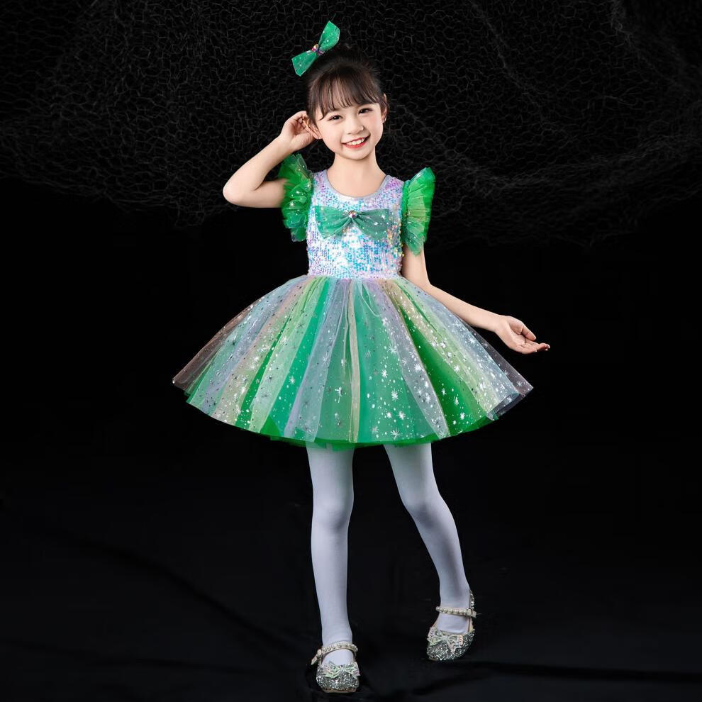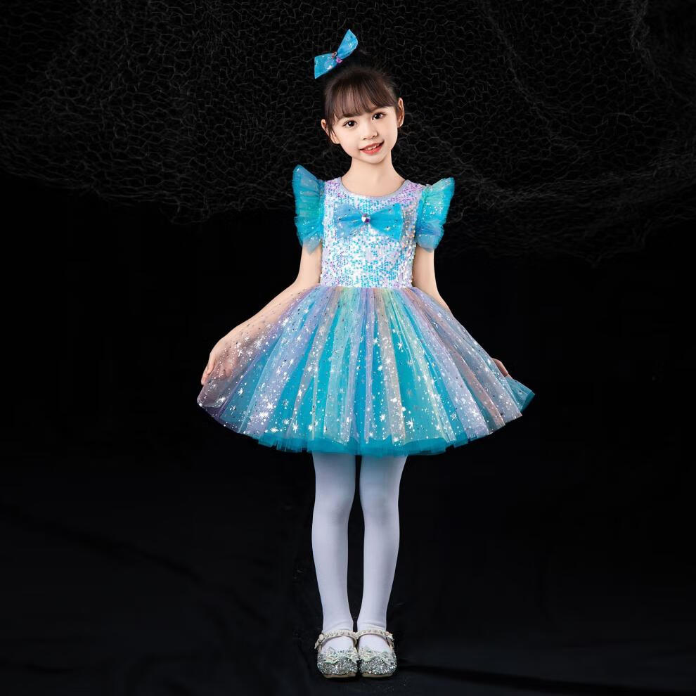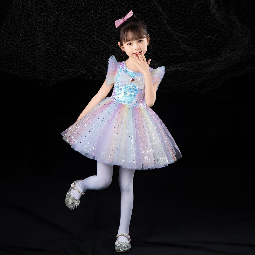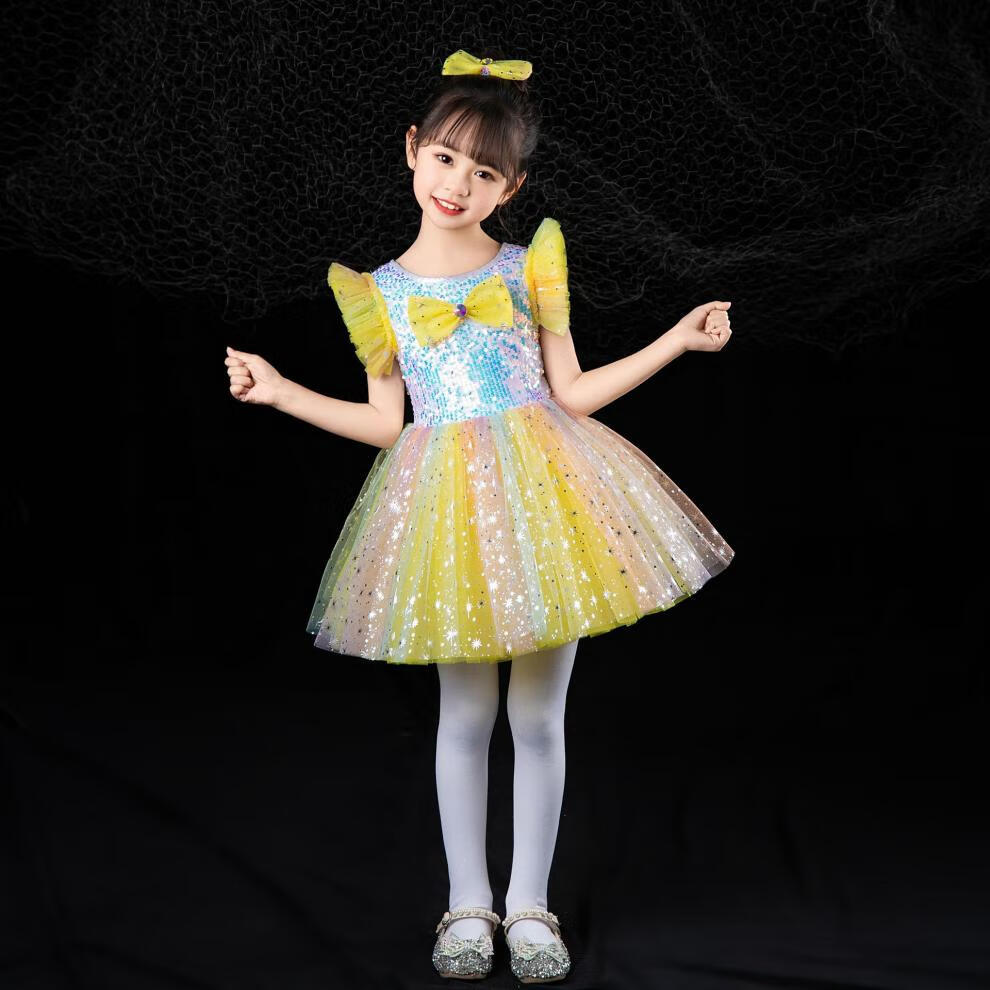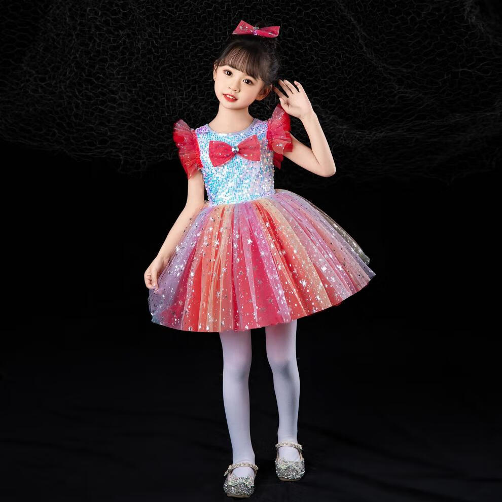 Disney Children's Performance Costumes Girl Princess Puff Dress Evening Gown Sequined Veil Skirt Dance Performance Suit Lotus Colorful Skirt + Bow 100 cm