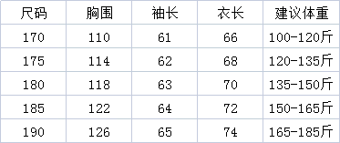 China (cm) 165 / 88-90 170 / 96-98 175 / 108-110 180 / 118-122 185 / 126-130