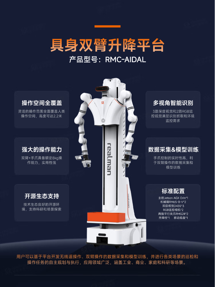 奇点人具身升降平台 RMC-AIDAL双臂 智能机器人 机械臂 双目视觉 轻量化仿人形操作平台