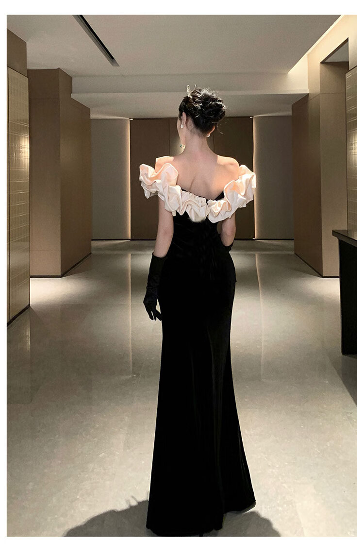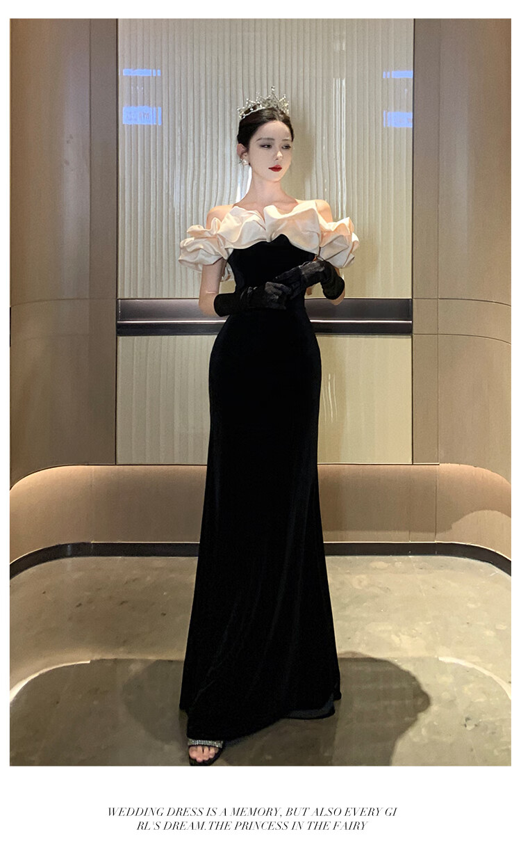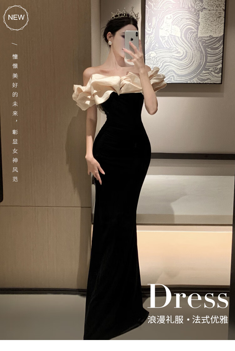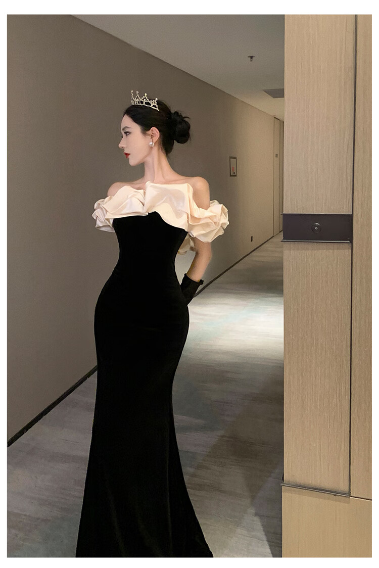 忻萦感赫本风黑色年会晚礼服裙高端轻奢小众鱼尾一字肩绒连衣裙 黑色 S