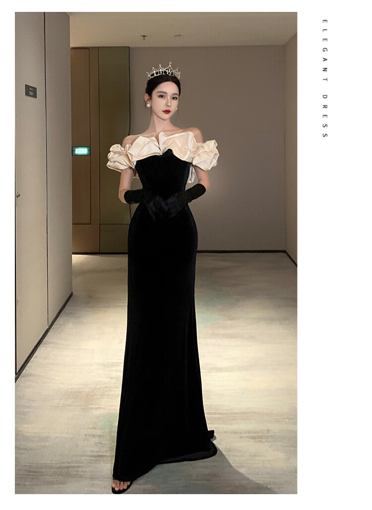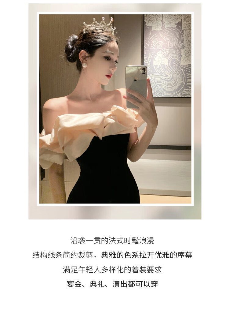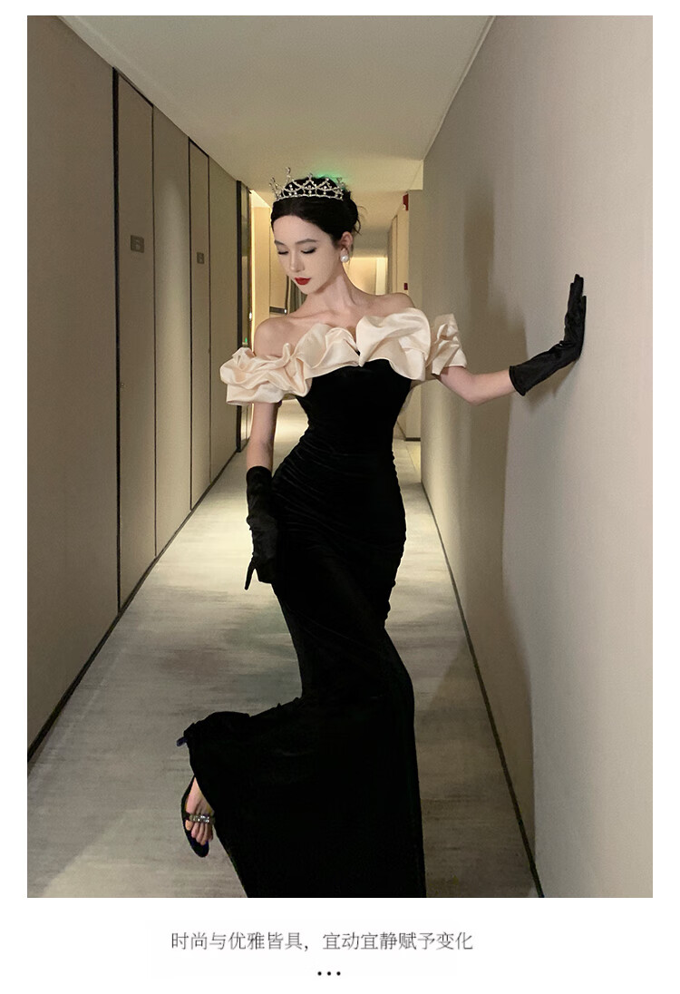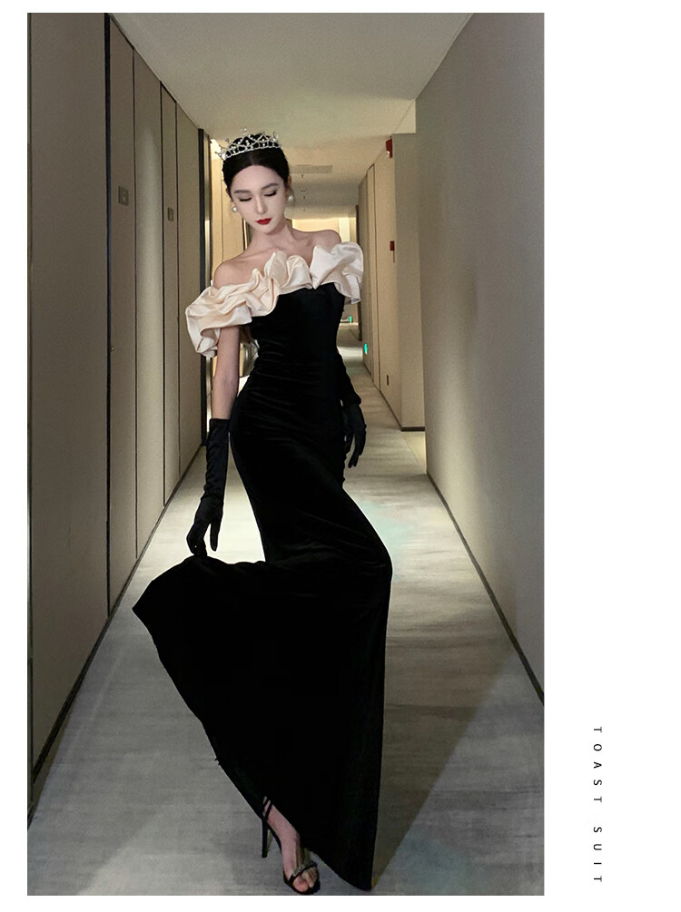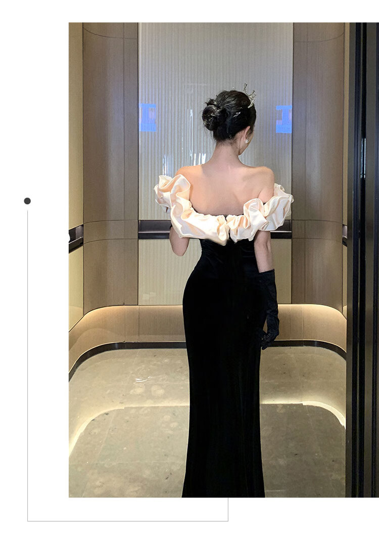 忻萦感赫本风黑色年会晚礼服裙高端轻奢小众鱼尾一字肩绒连衣裙 黑色 S