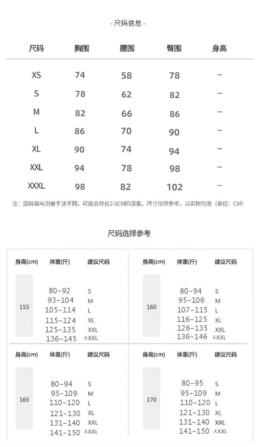 China (cm) 160-165/84-86 165-170 / 88-90 167-172 / 92-96 168-173 / 98-102 170-176 / 106-110
