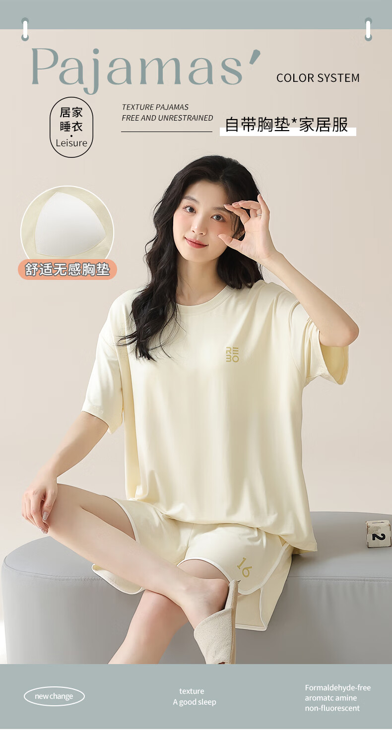 LangSha-Markenpyjama für Damen, Sommer, dünner Stil mit Brustpolster, Eisseide, kurzärmelig, einfarbig, Heimkleidung, 2025, neuer Stil, F18-15807-Pullover, doppelt kurz, hellgrün, kommt mit Brustumfang M 90–110. Jin Jin entspricht 0,5 kg