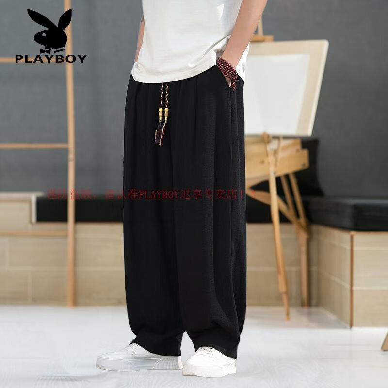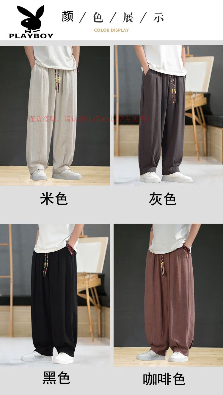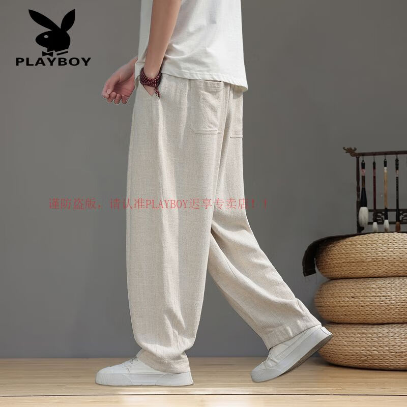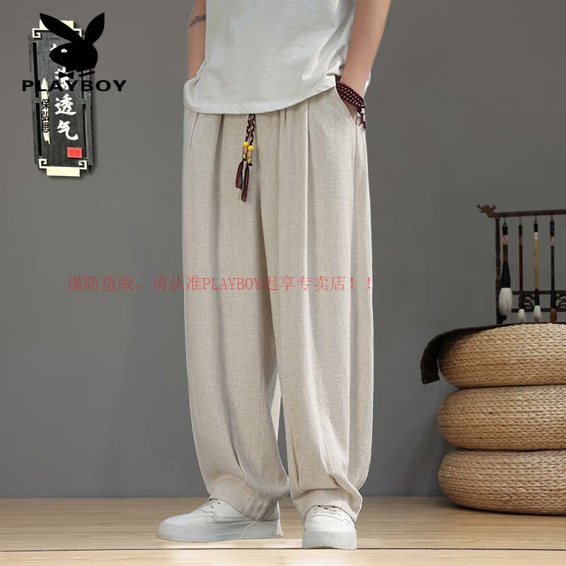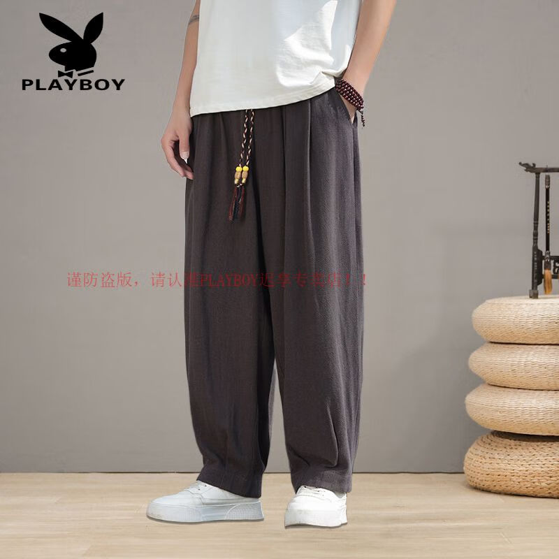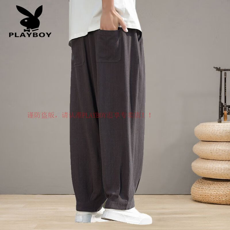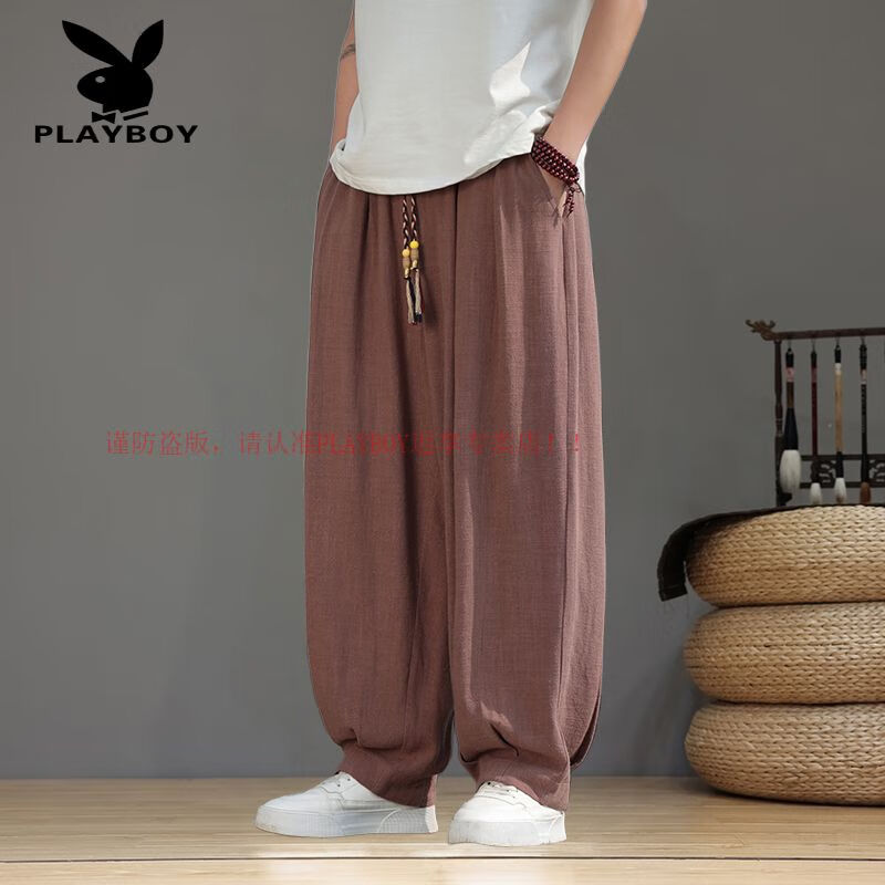 Playboy (PLAYBOY) Spring and Summer Chinese Style Linen Pants Men's Tang Suit Thin Section Loose Large Size Wide Leg Bloomers Cotton and Linen Harem Casual Pants Brown L 120-140Jin Jin is equal to 0.5 kg
