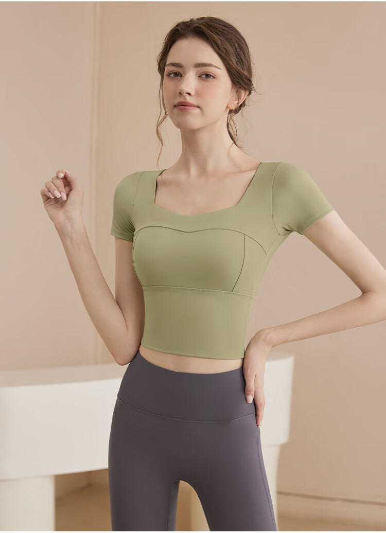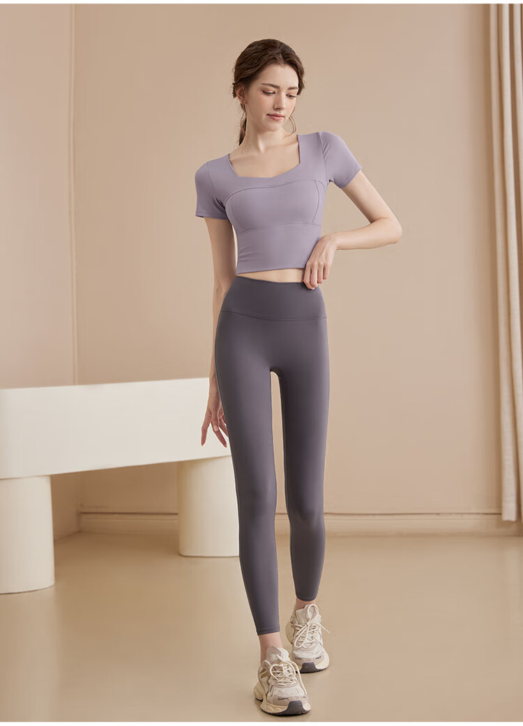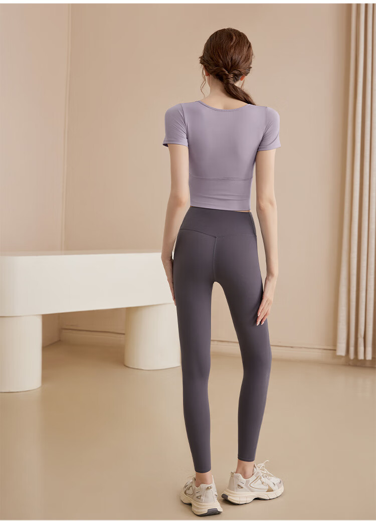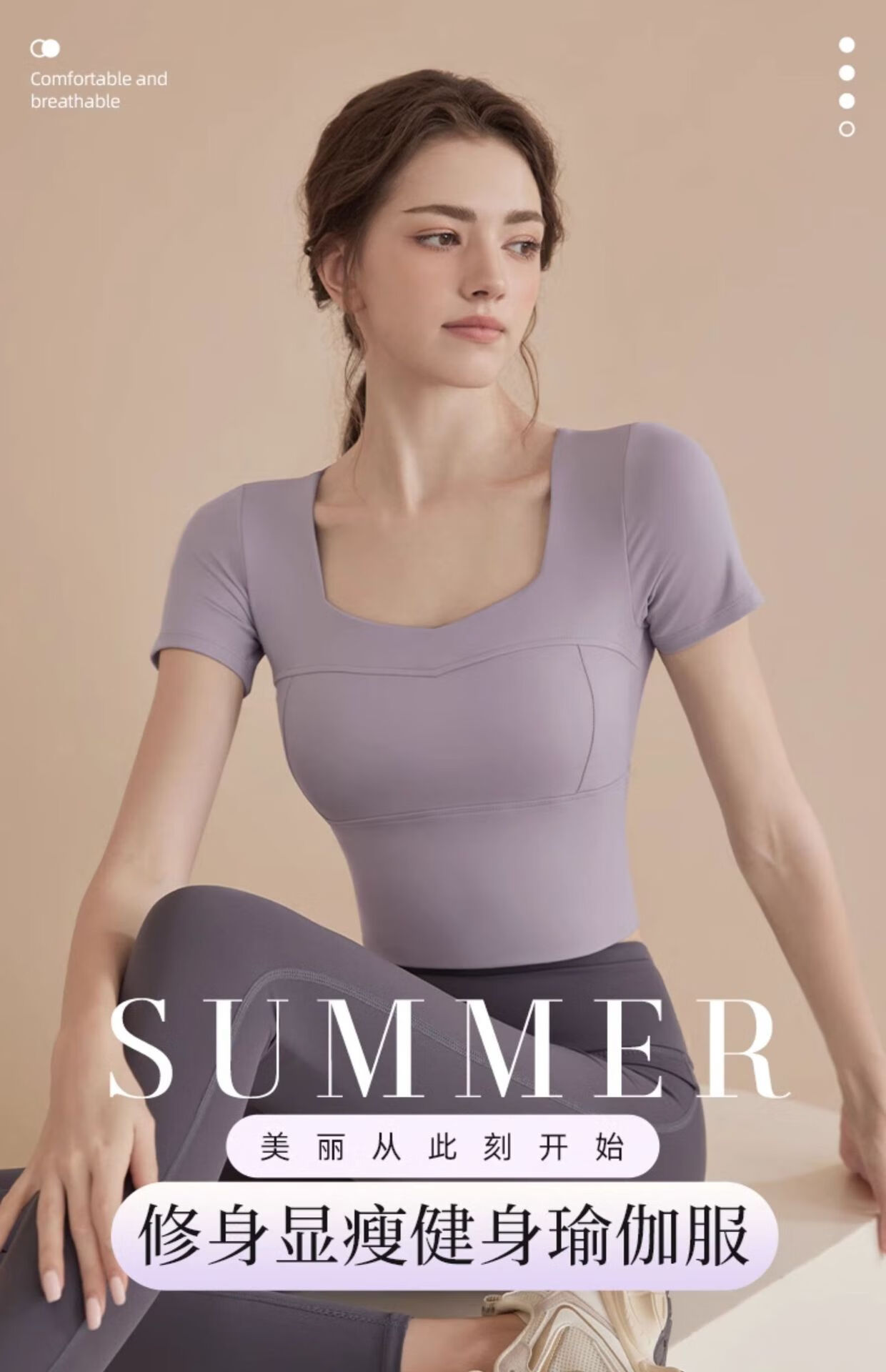 Ropa de yoga sumergida brillante Camiseta corta con almohadilla para el pecho para mujer Pilates profesional Adelgazamiento Correr Deportes Fitness Top de manga corta Púrpura L
