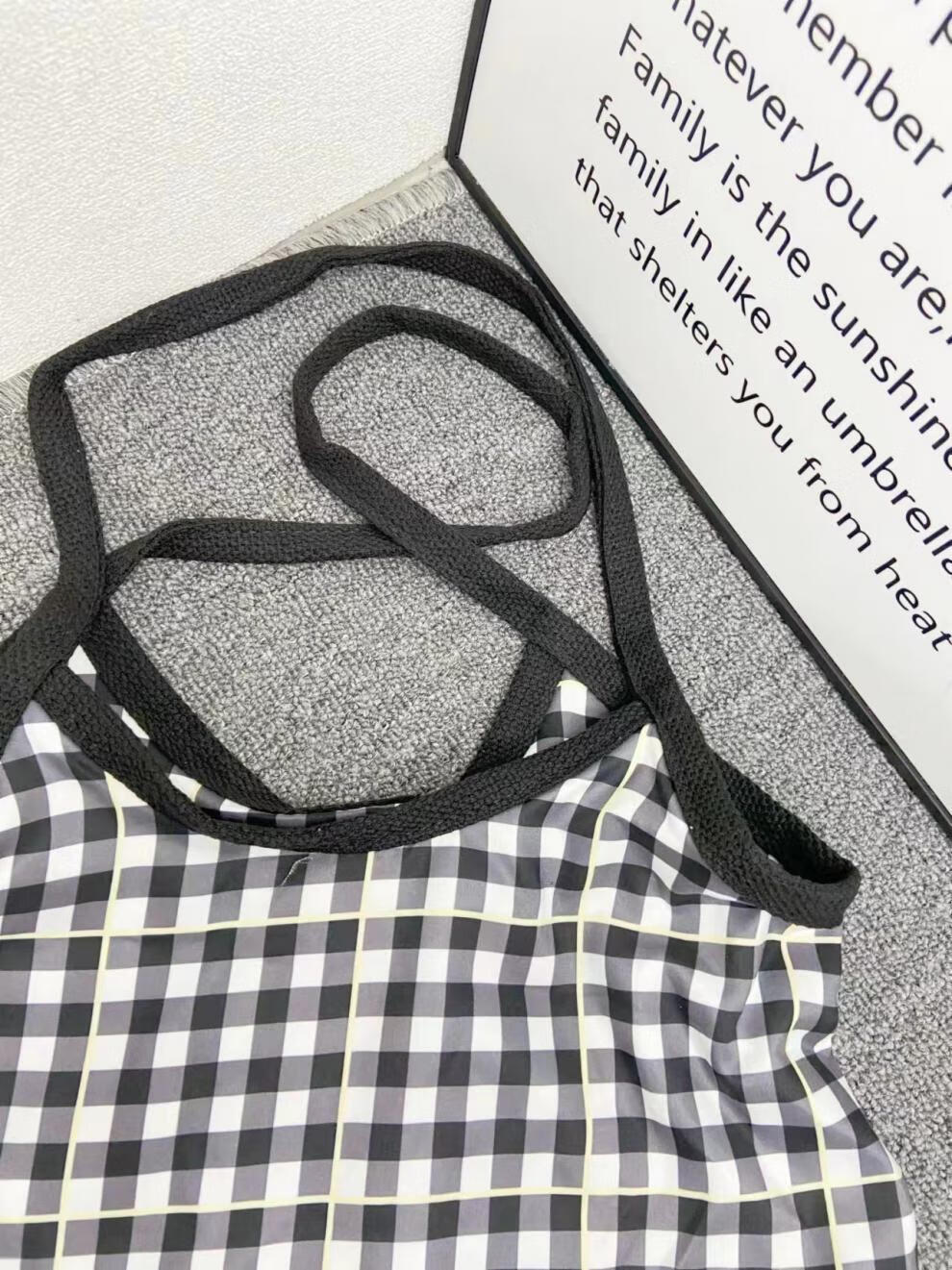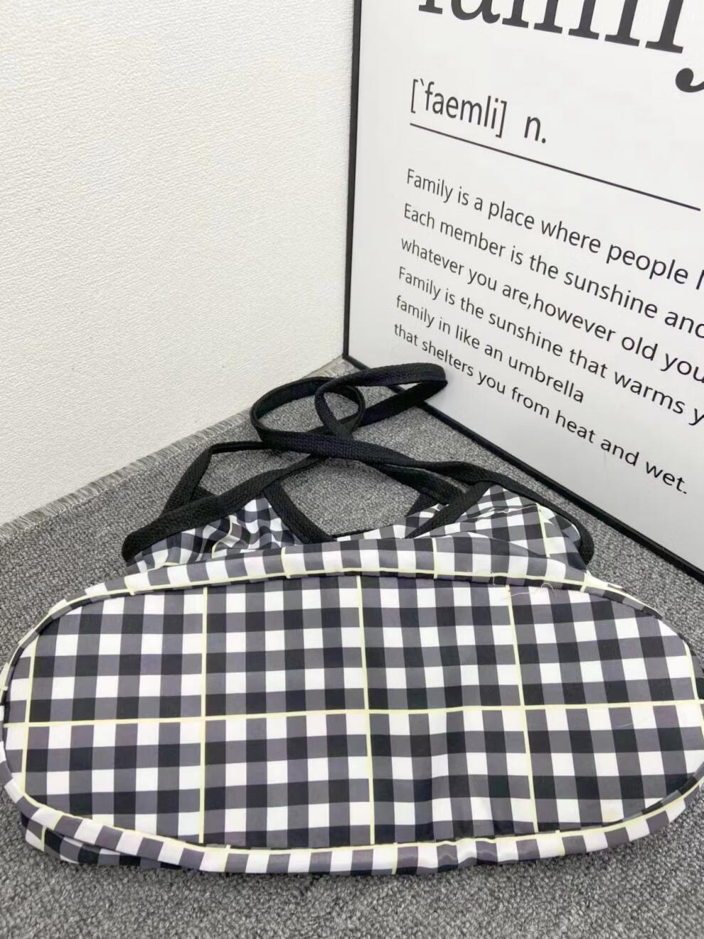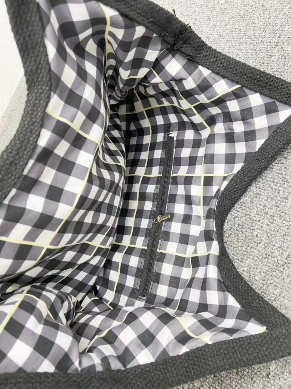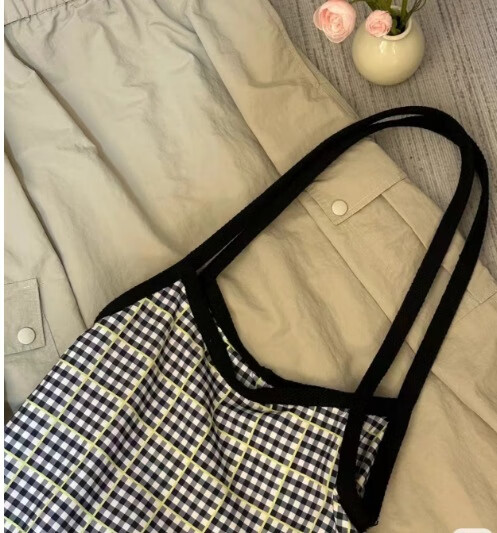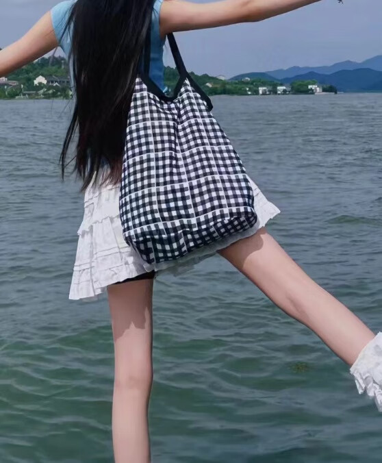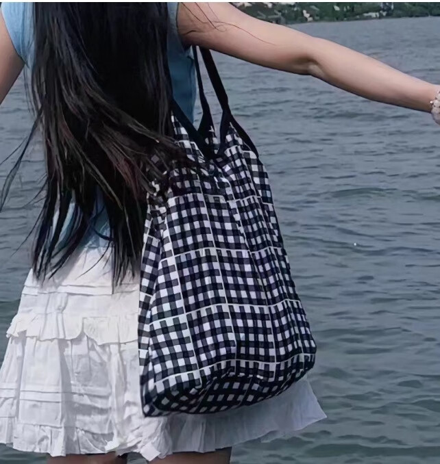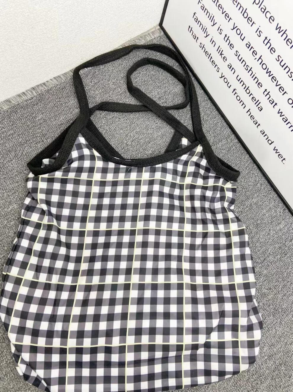 稻草人(MEXICAN)包包女2024新款文艺黑白格子手提单肩包清爽夏日帆布水桶包腋下包 黑色