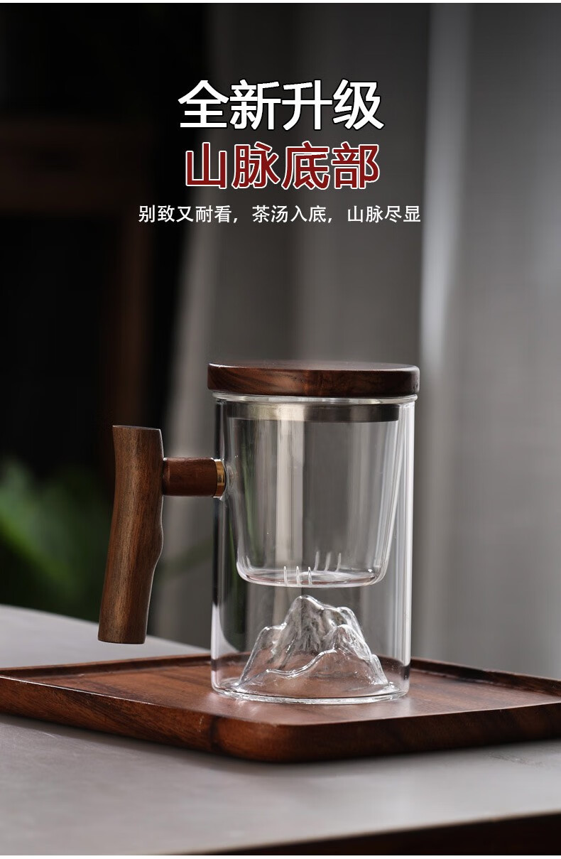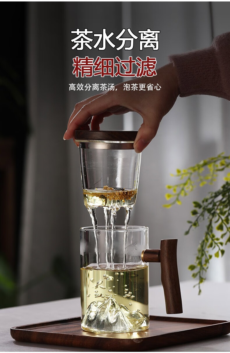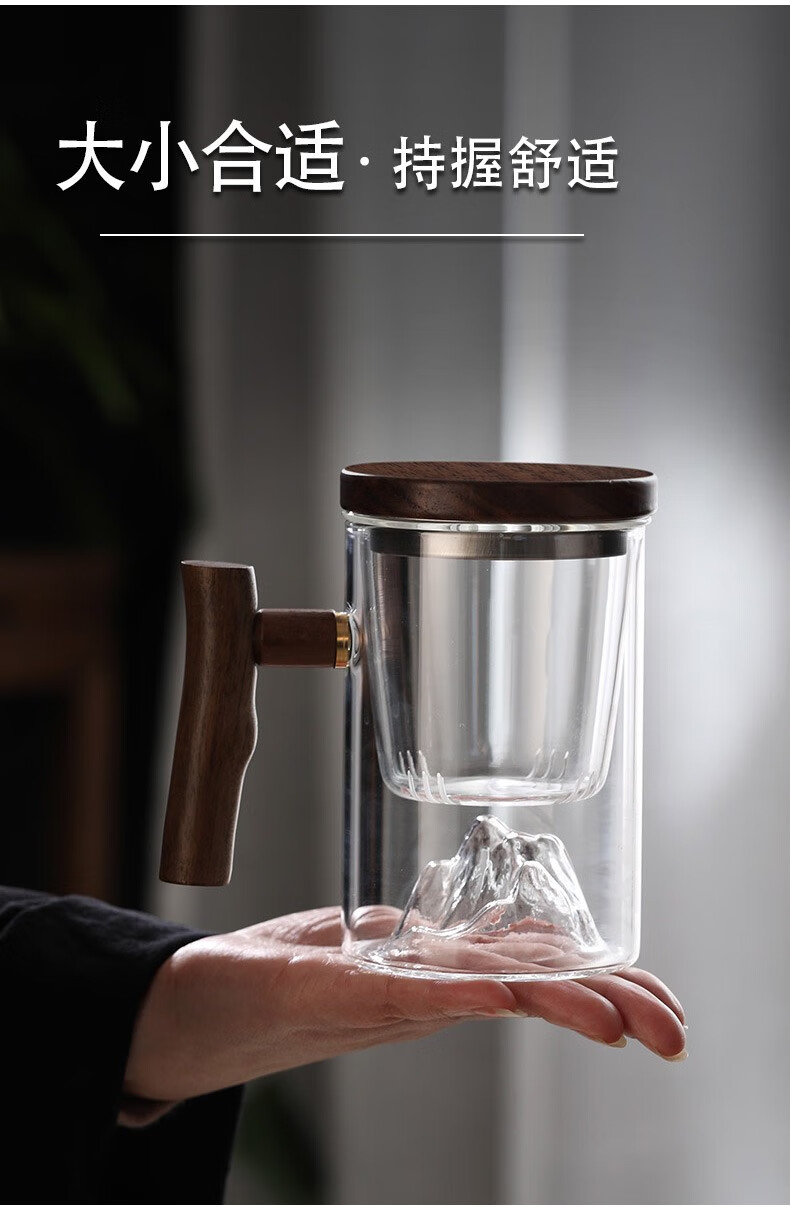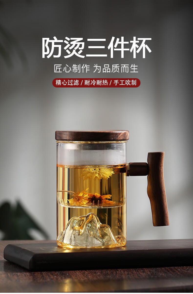 个人专用泡茶杯茶水分离男士带把喝茶水杯玻璃日式观山茶道杯子 9194鸿崖三件杯榉木450ML 200mL(含)-400mL(含)