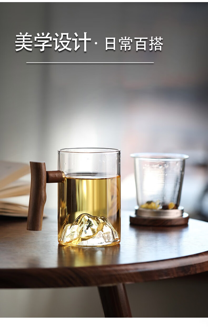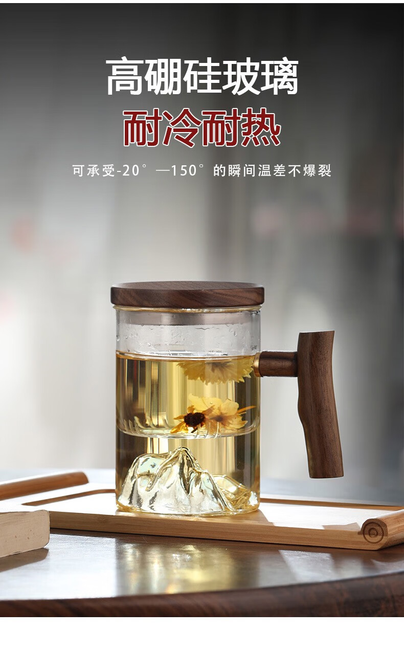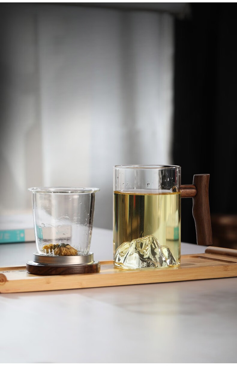 个人专用泡茶杯茶水分离男士带把喝茶水杯玻璃日式观山茶道杯子 9194鸿崖三件杯榉木450ML 200mL(含)-400mL(含)
