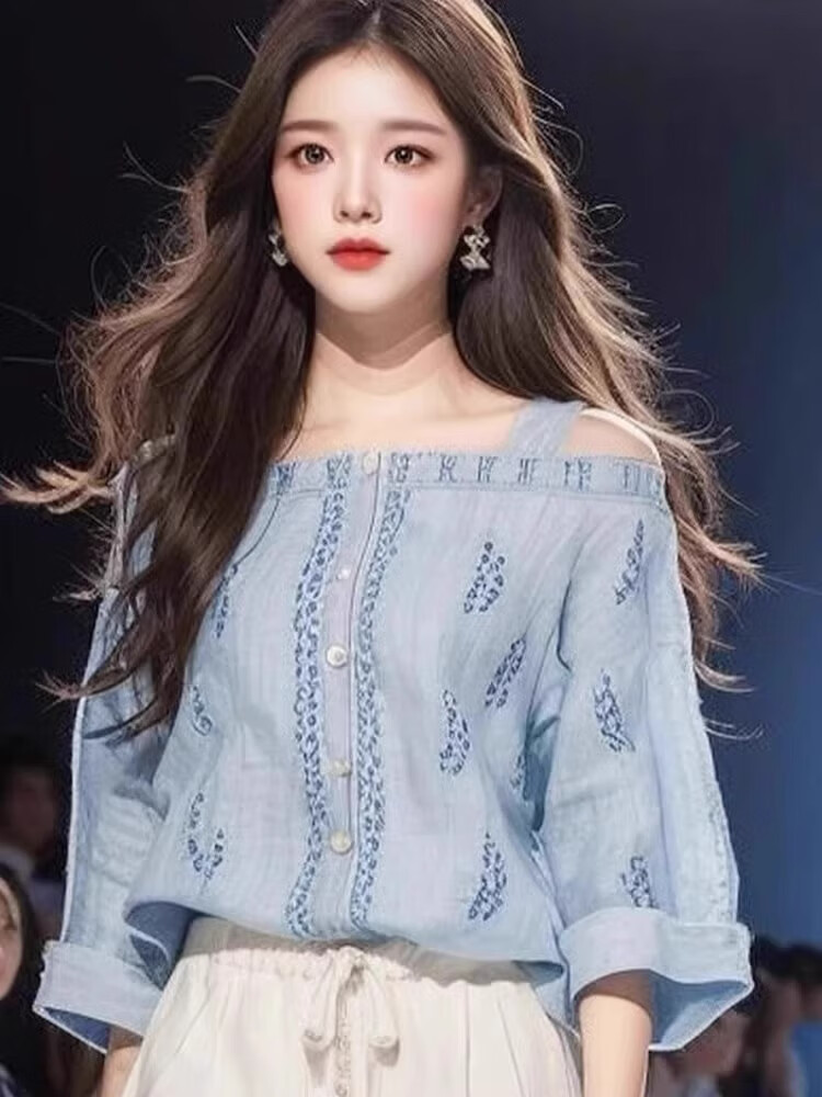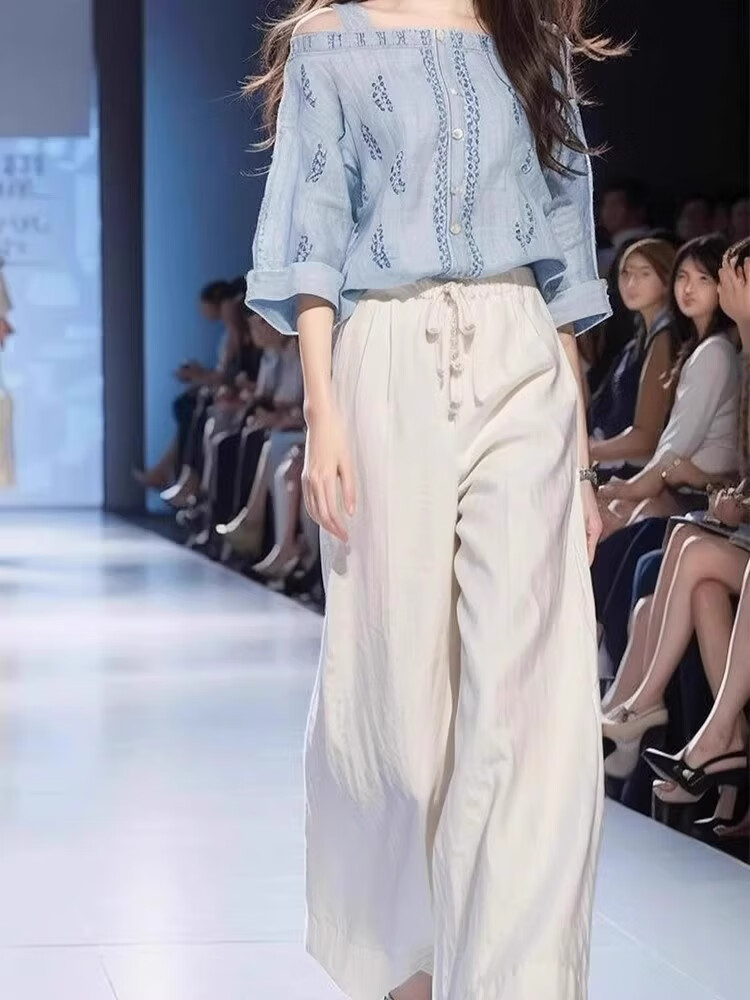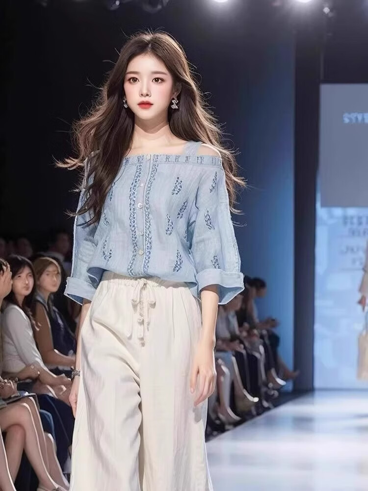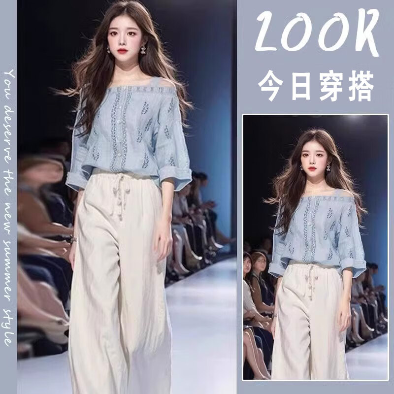 ROMON camisa azul claro, estilo fresco y salado, estilo ligero y lujoso, pantalón de traje de dos piezas para mujer de alta sociedad, top sencillo de verano, ropa de mujer nueva de verano/funda adelgazante ligeramente gorda S recomendado 85-95 Jin Jin equivale aproximadamente a 0,5 kg