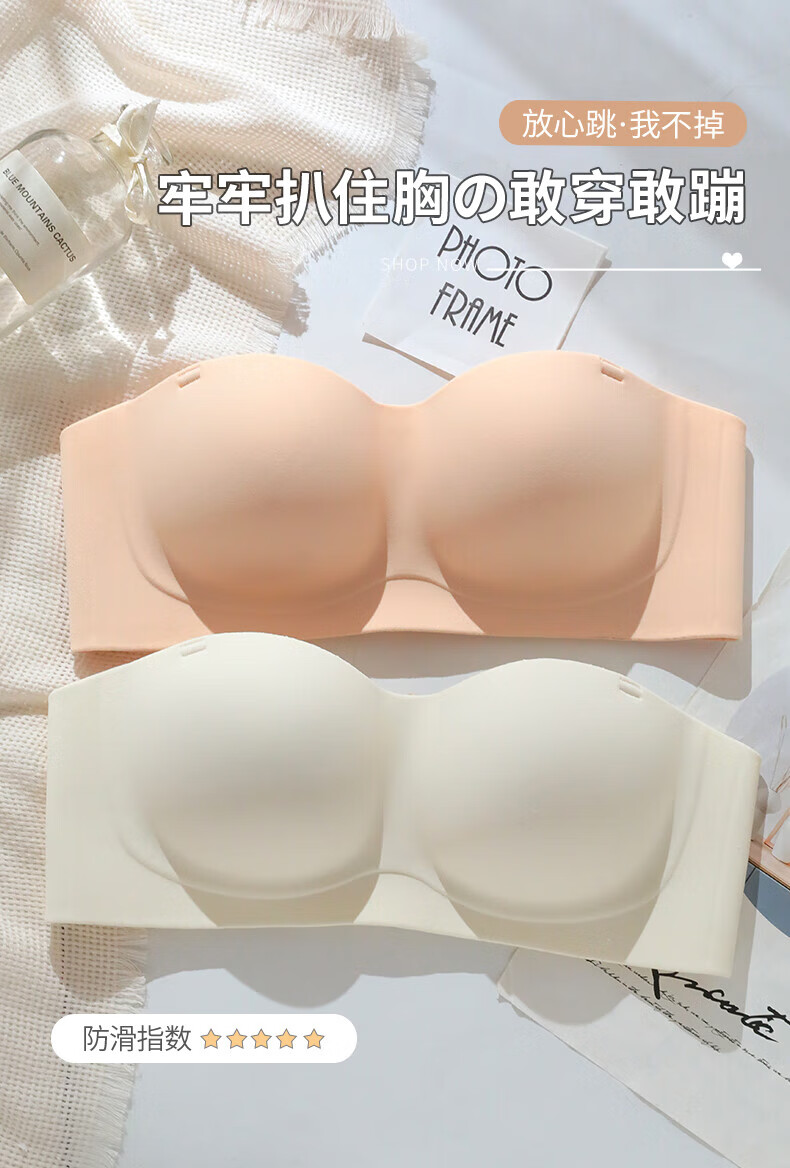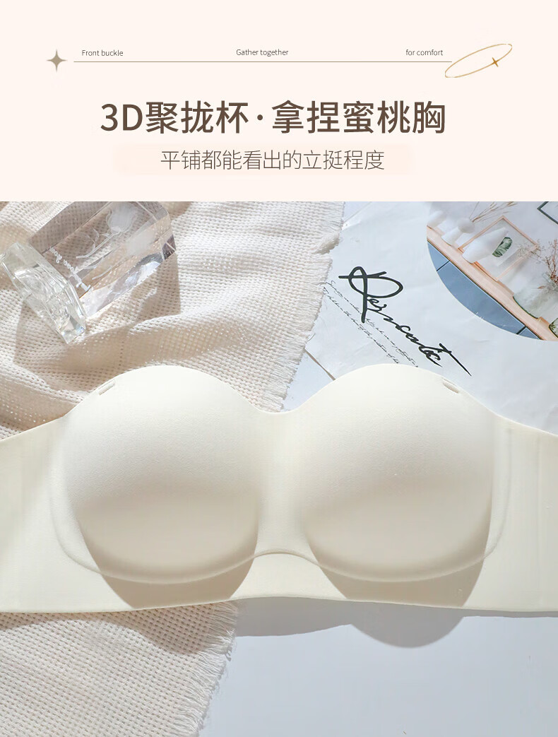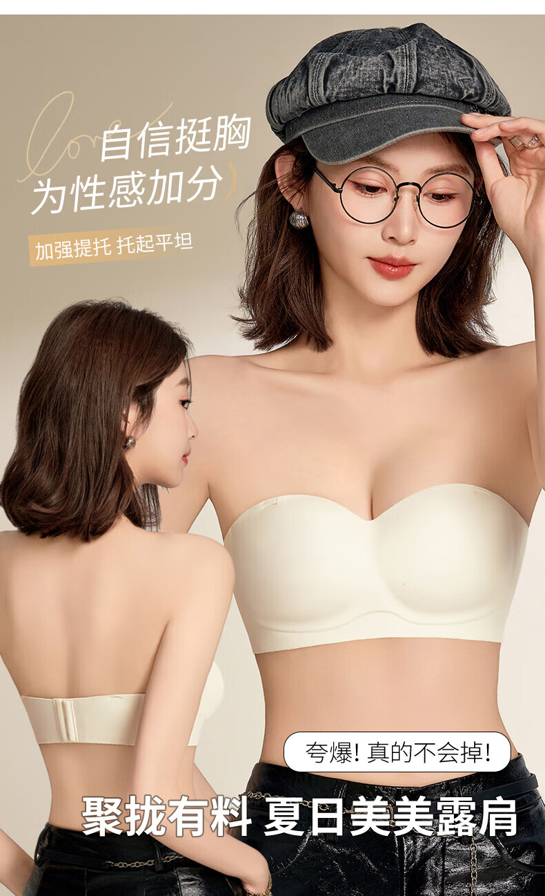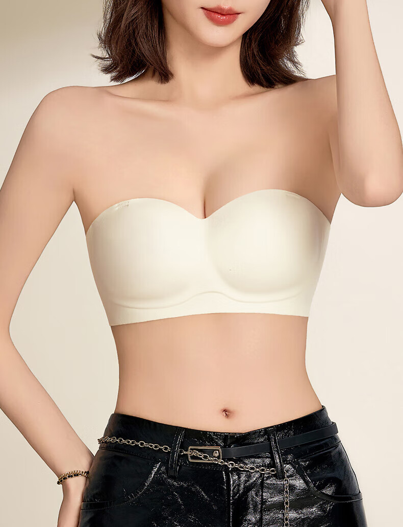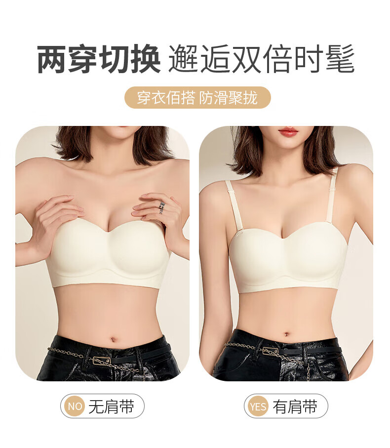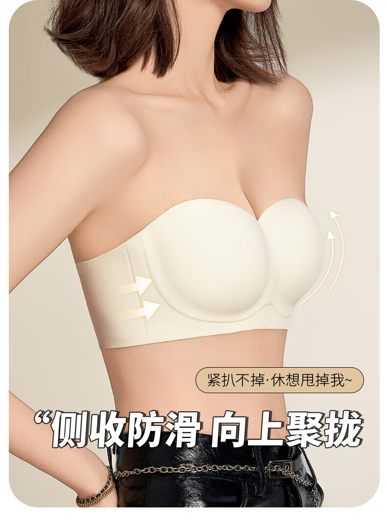 猫人无肩带内衣女士小胸聚拢防滑抹胸裹胸隐形文胸罩收副乳防下垂上托 杏白 70B (160) 通杯·厚