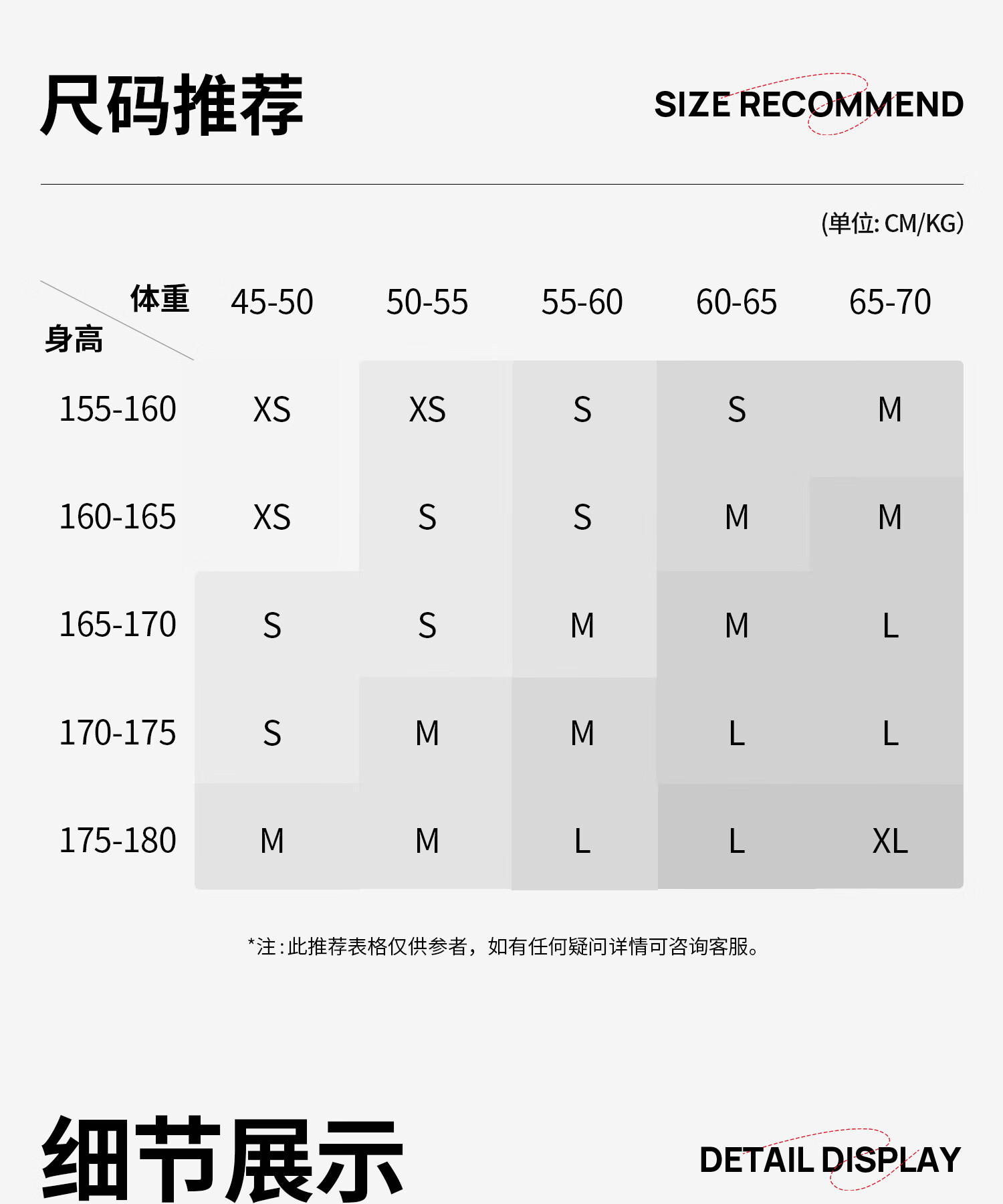 China (cm) 160-165/84-86 165-170 / 88-90 167-172 / 92-96 168-173 / 98-102 170-176 / 106-110