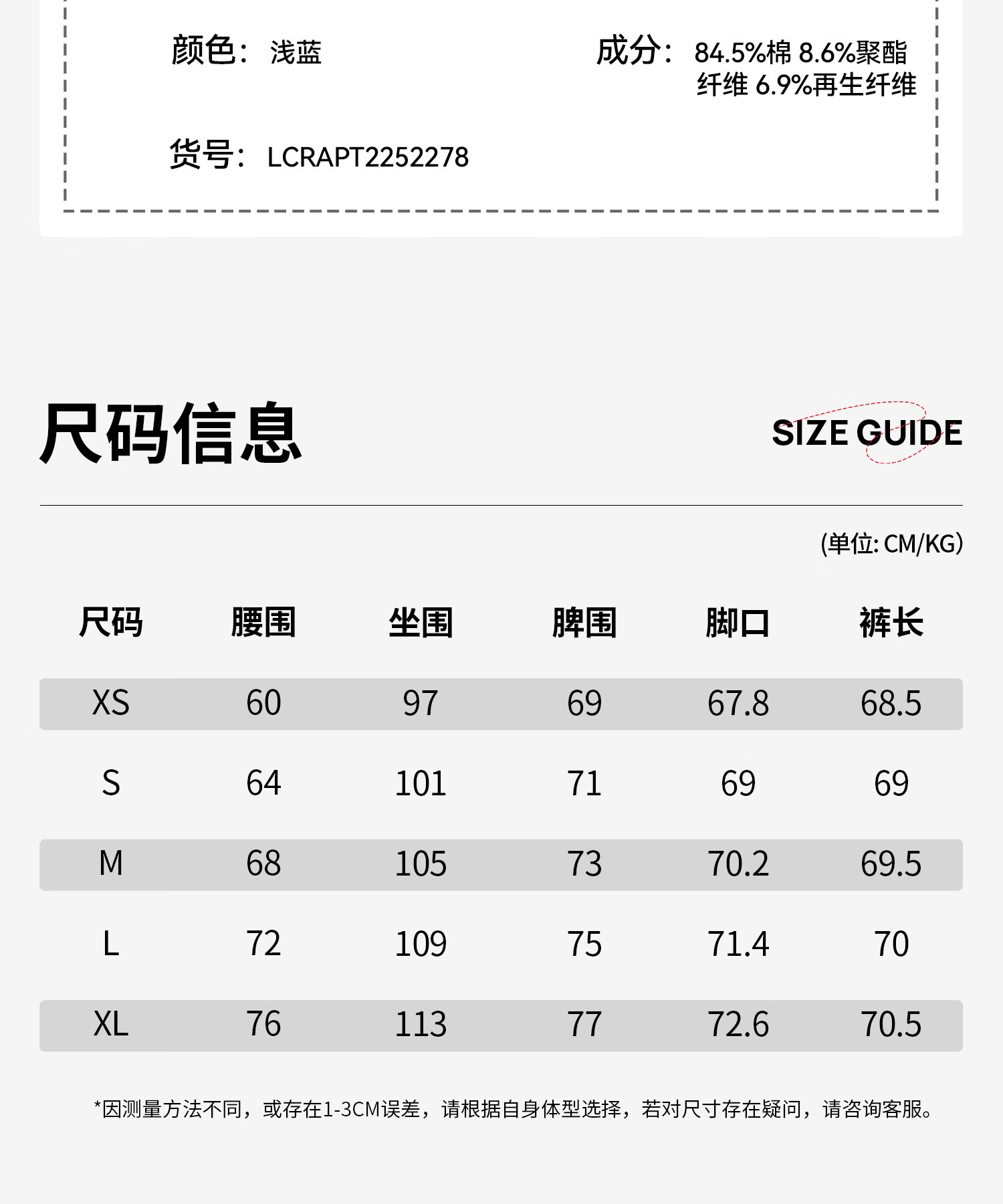 Outseam (cm) 99 cm 101.5 cm 104 cm 106.5 cm 109 cm