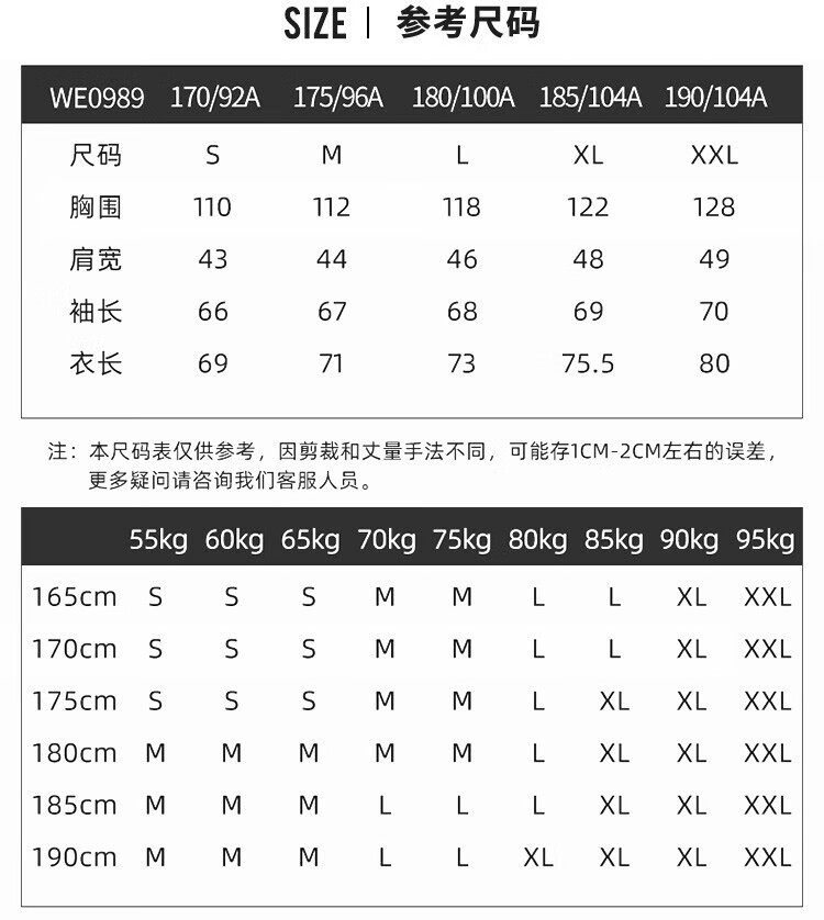 China (cm) 165 / 88-90 170 / 96-98 175 / 108-110 180 / 118-122 185 / 126-130