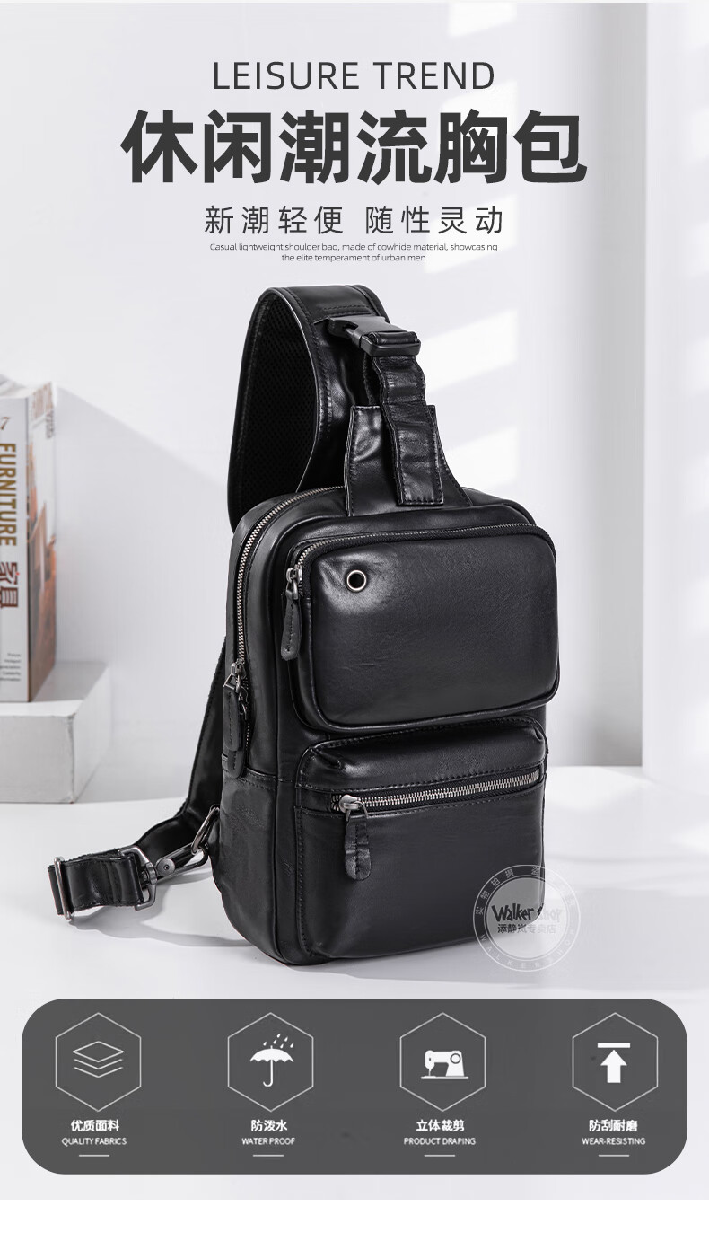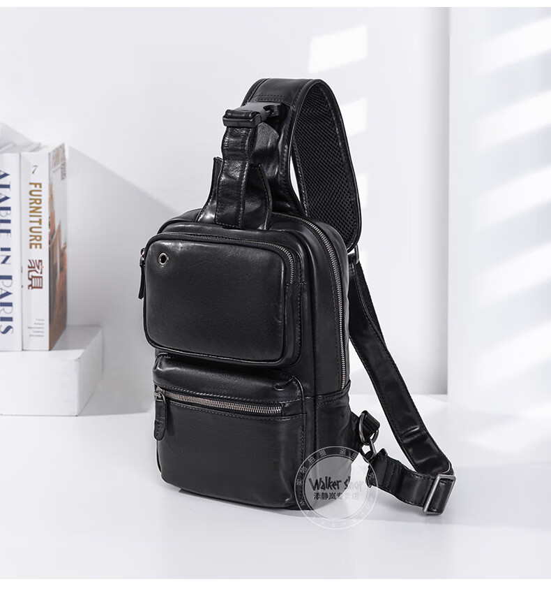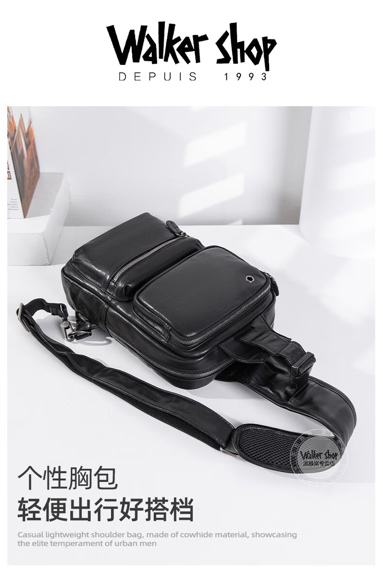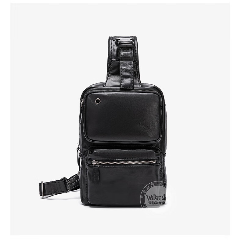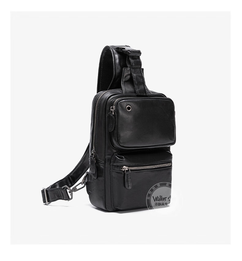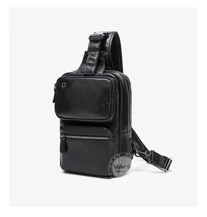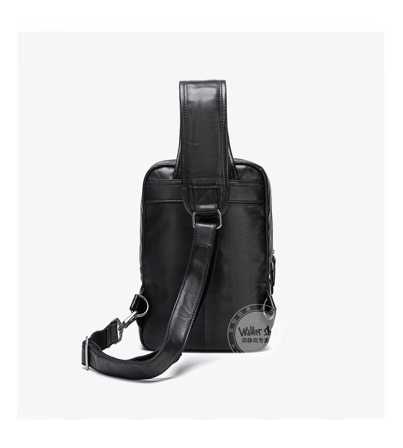 Walker Shop胸包男士【头层牛皮面料】休闲潮流单肩包青年时尚男士斜跨包 黑色 31cm*8cm*18cm
