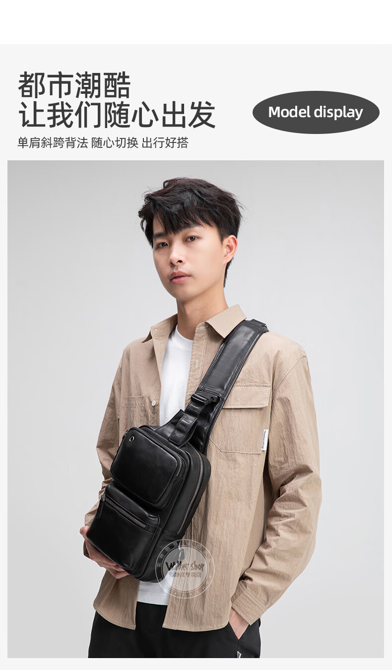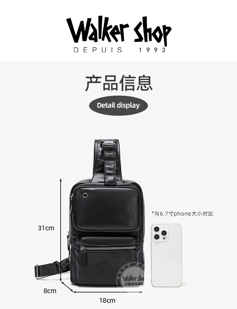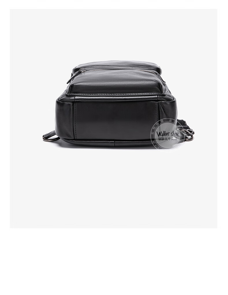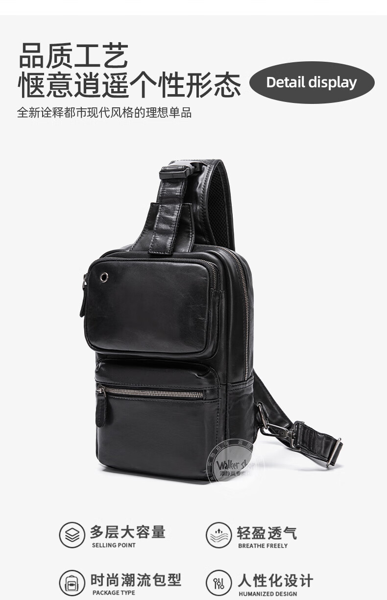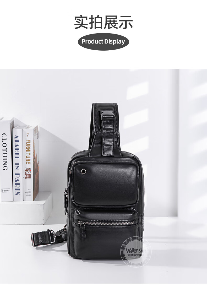 Walker Shop胸包男士【头层牛皮面料】休闲潮流单肩包青年时尚男士斜跨包 黑色 31cm*8cm*18cm