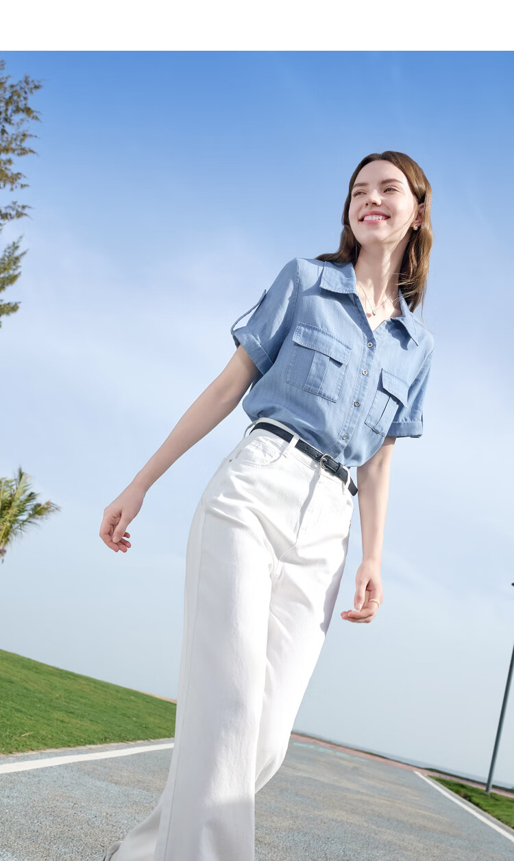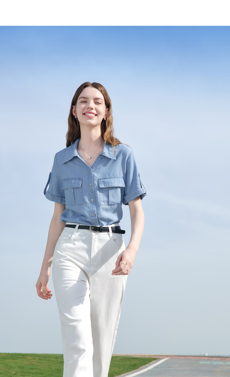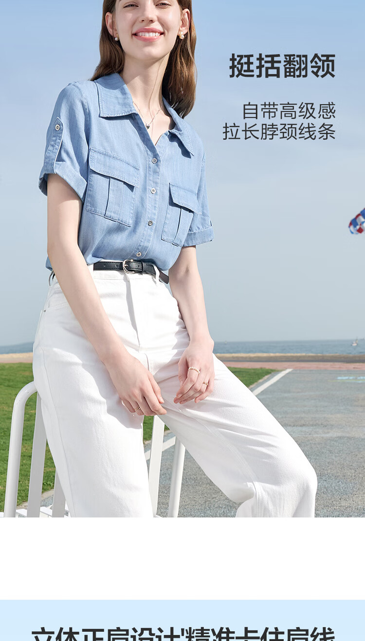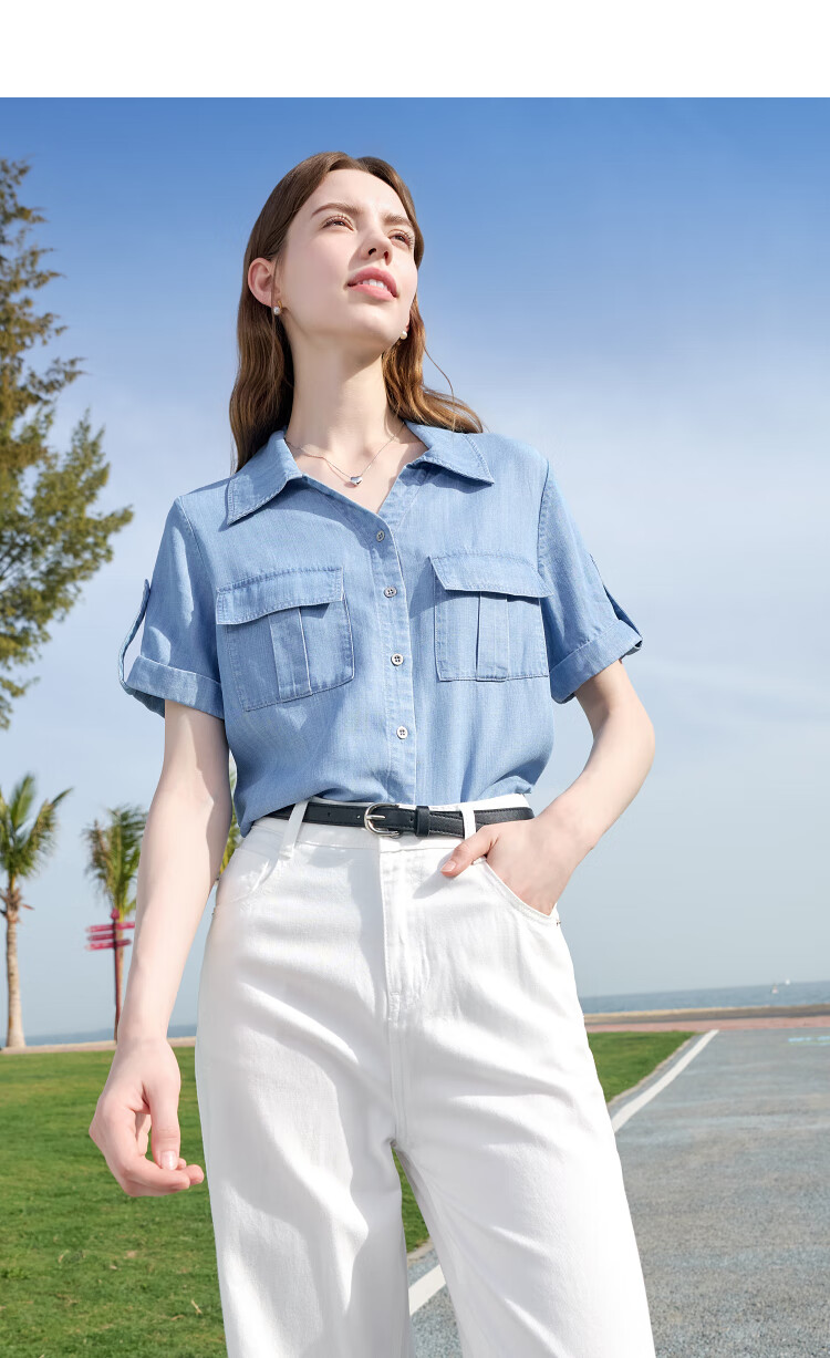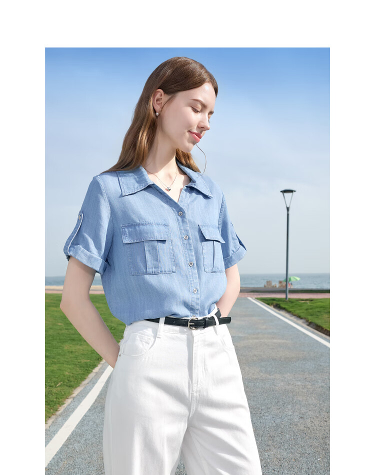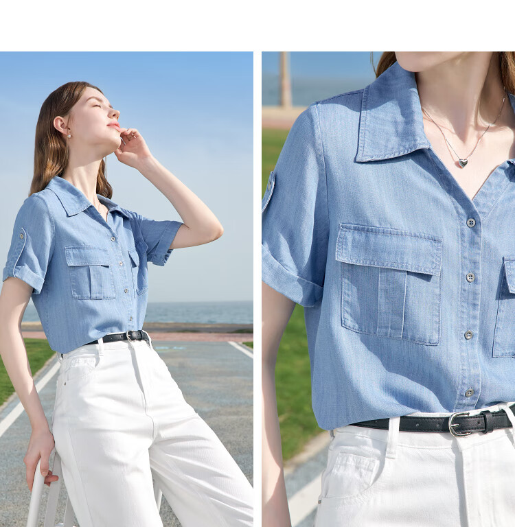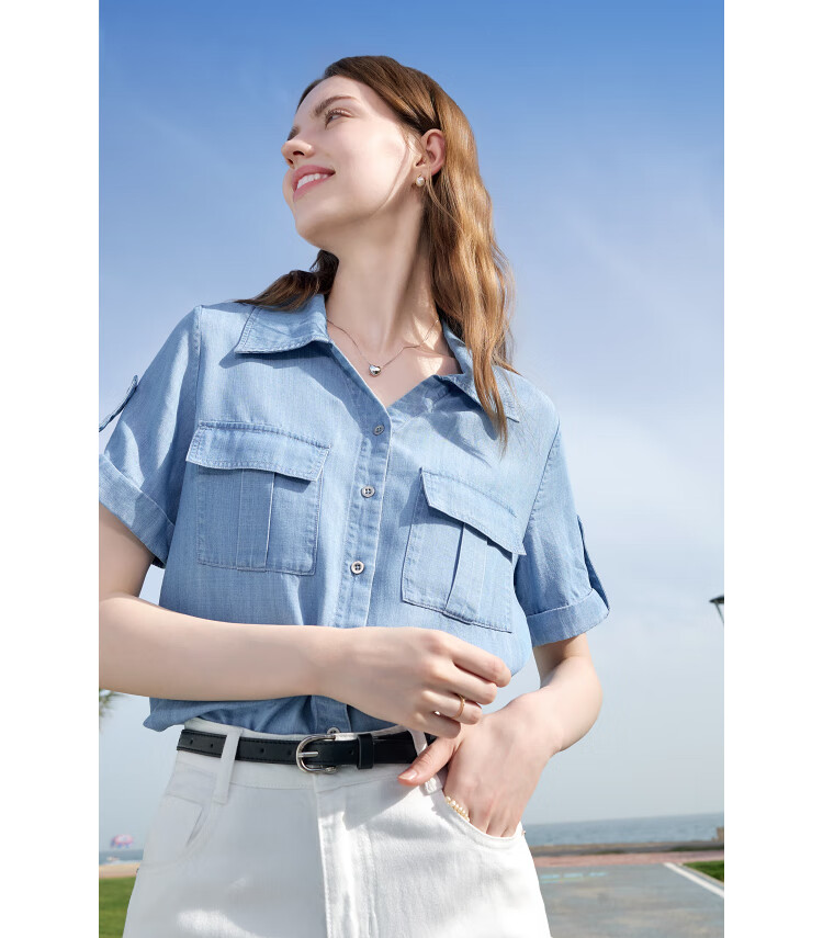百图betu女装2025夏季新款衬衫莱赛尔莱赛尔凉感牛仔短袖上衣2505X17 牛仔色 M