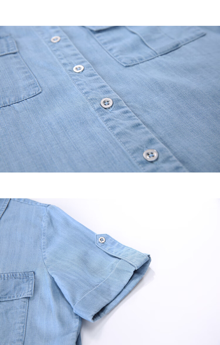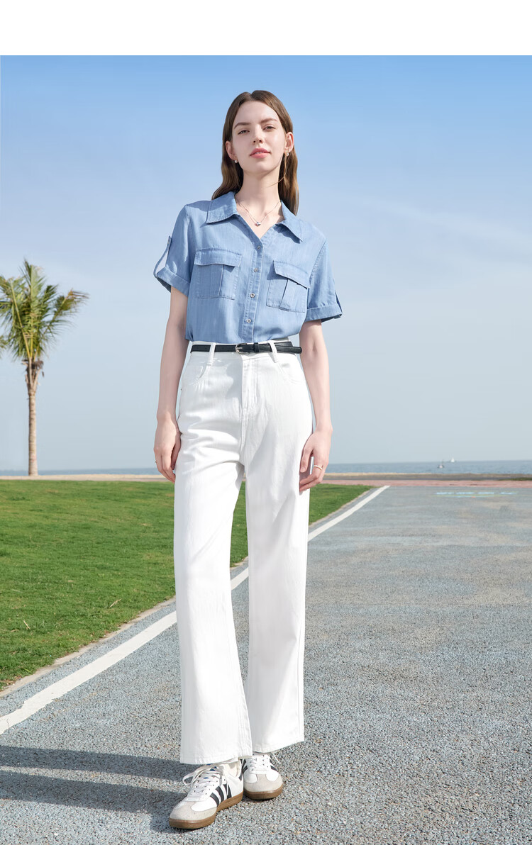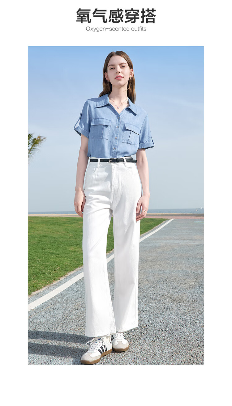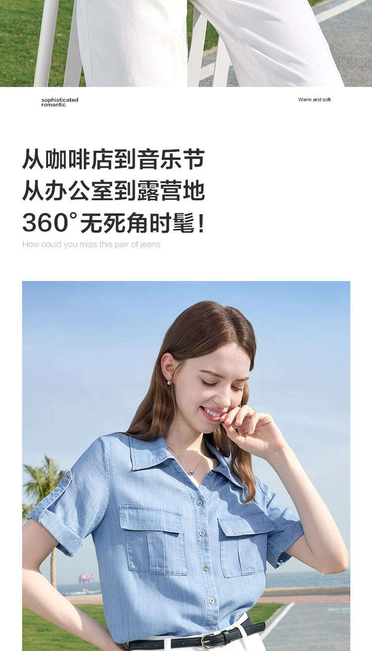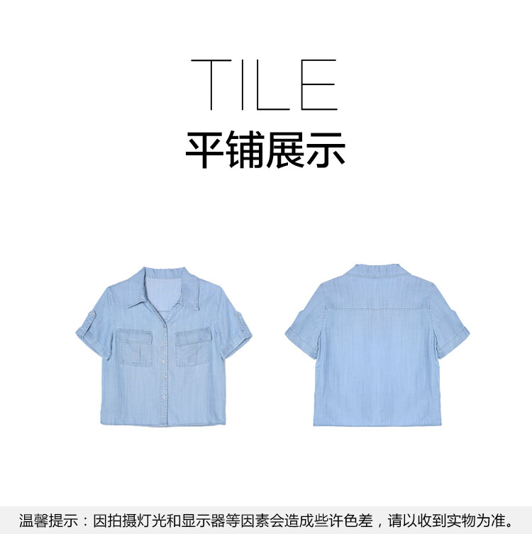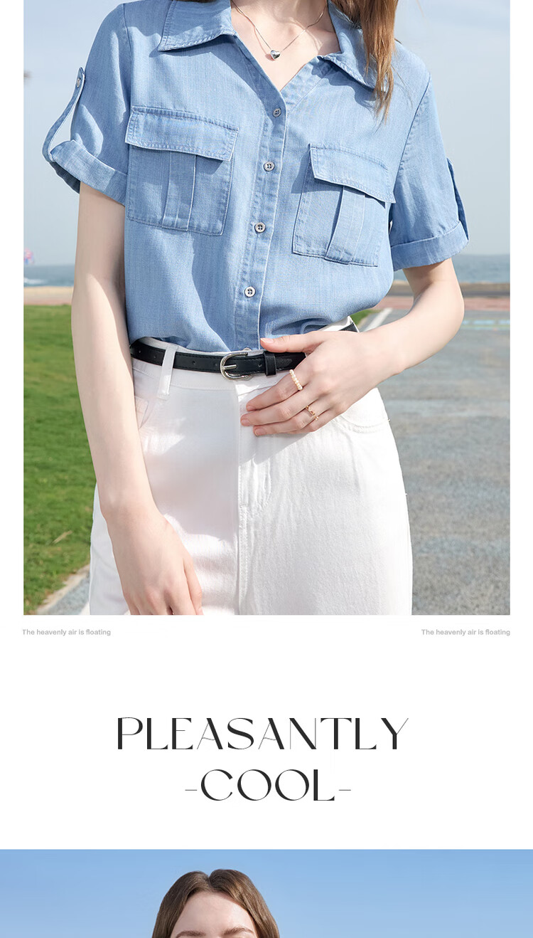 百图betu女装2025夏季新款衬衫莱赛尔莱赛尔凉感牛仔短袖上衣2505X17 牛仔色 M
