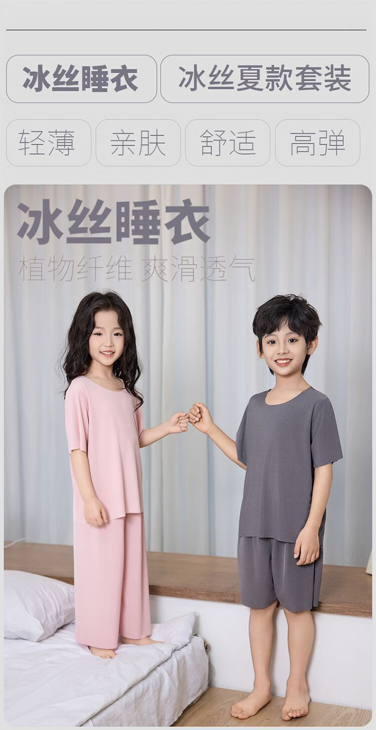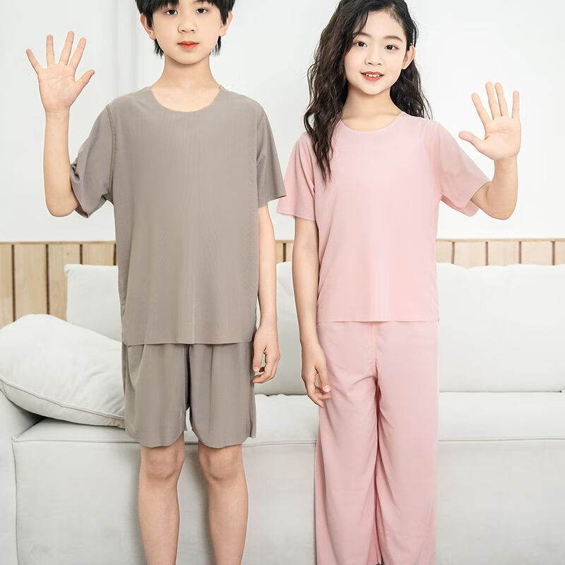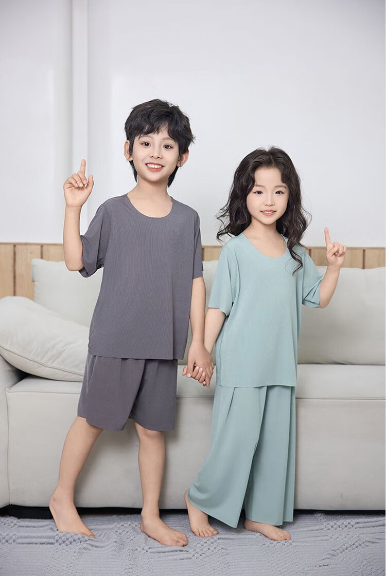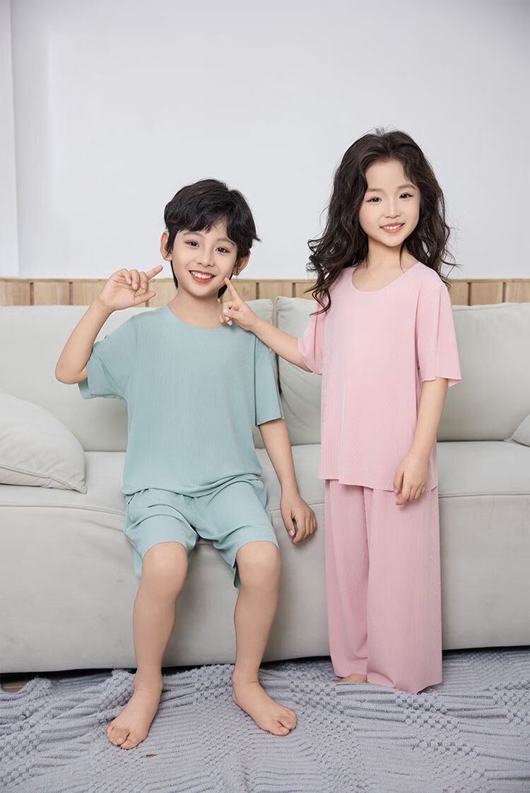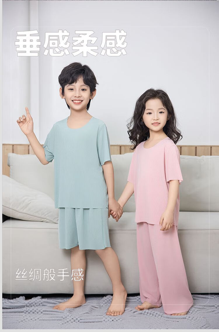 儿童睡衣冰丝莫代尔套装女童面膜亲子男童夏季薄款无痕空调家居服 男款-绿色 M (140码 65-75斤)