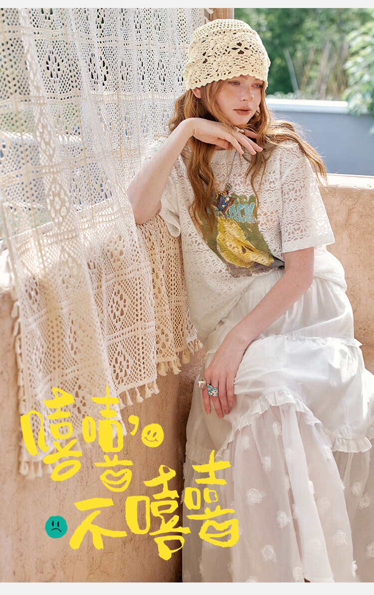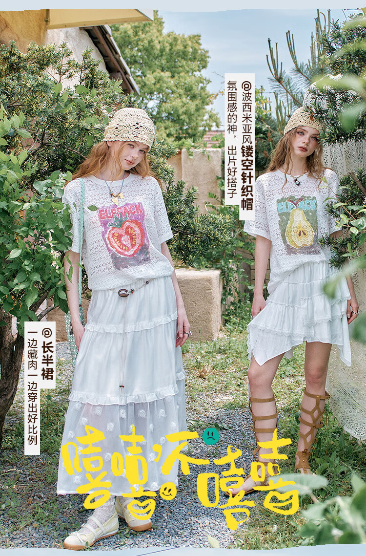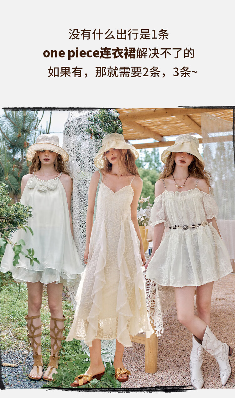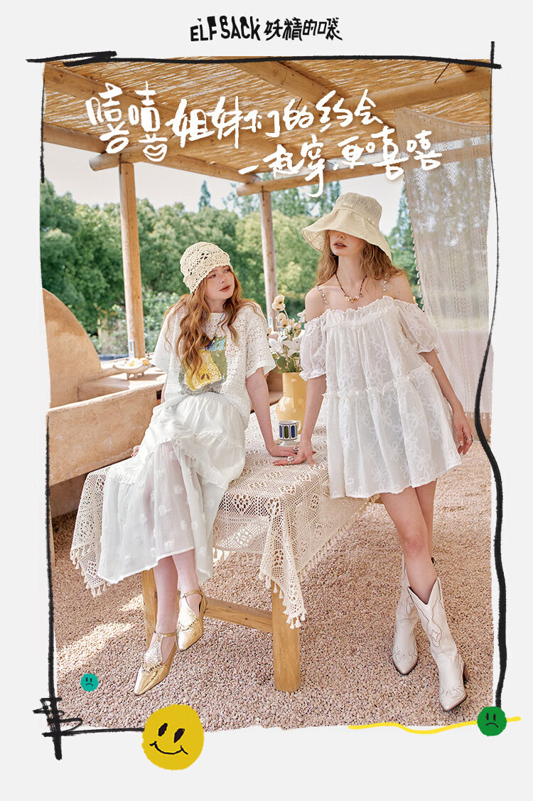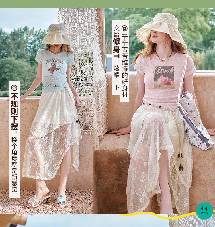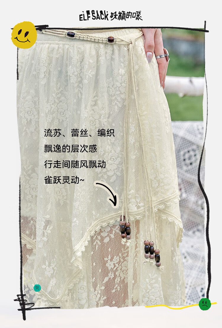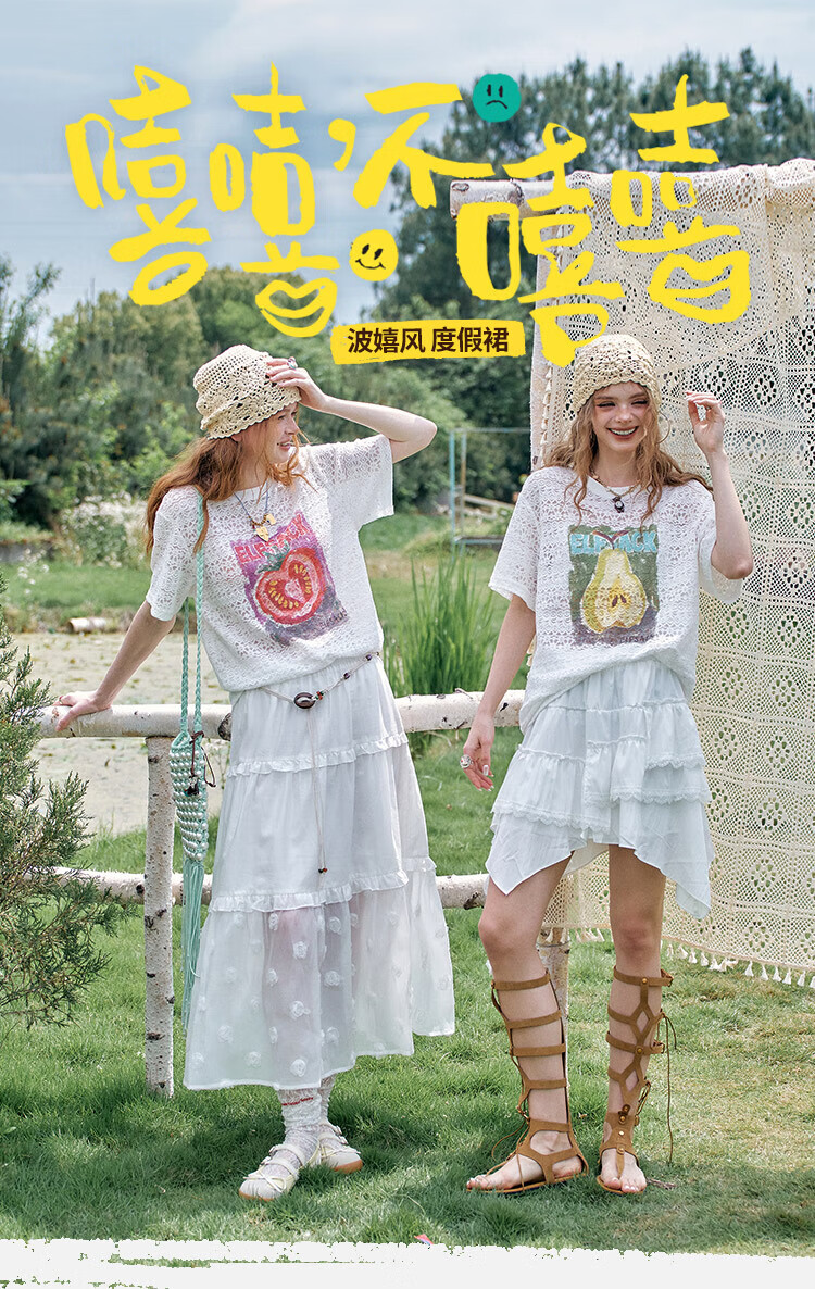 妖精的口袋【嘻嘻不嘻嘻】波嬉风白色连衣裙女25年夏季新款t恤半身裙套装裙 蕾丝米白色(雪纺吊带连衣裙) L