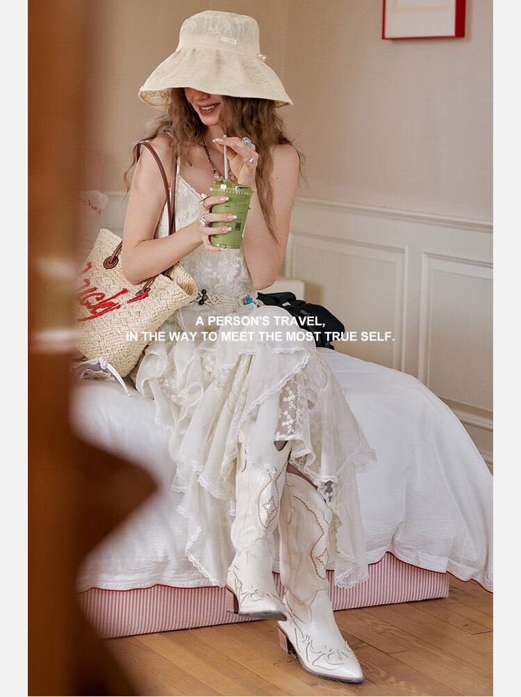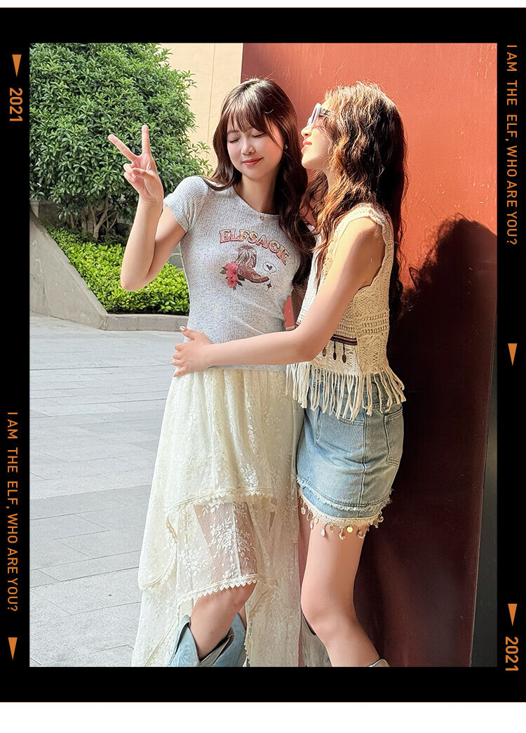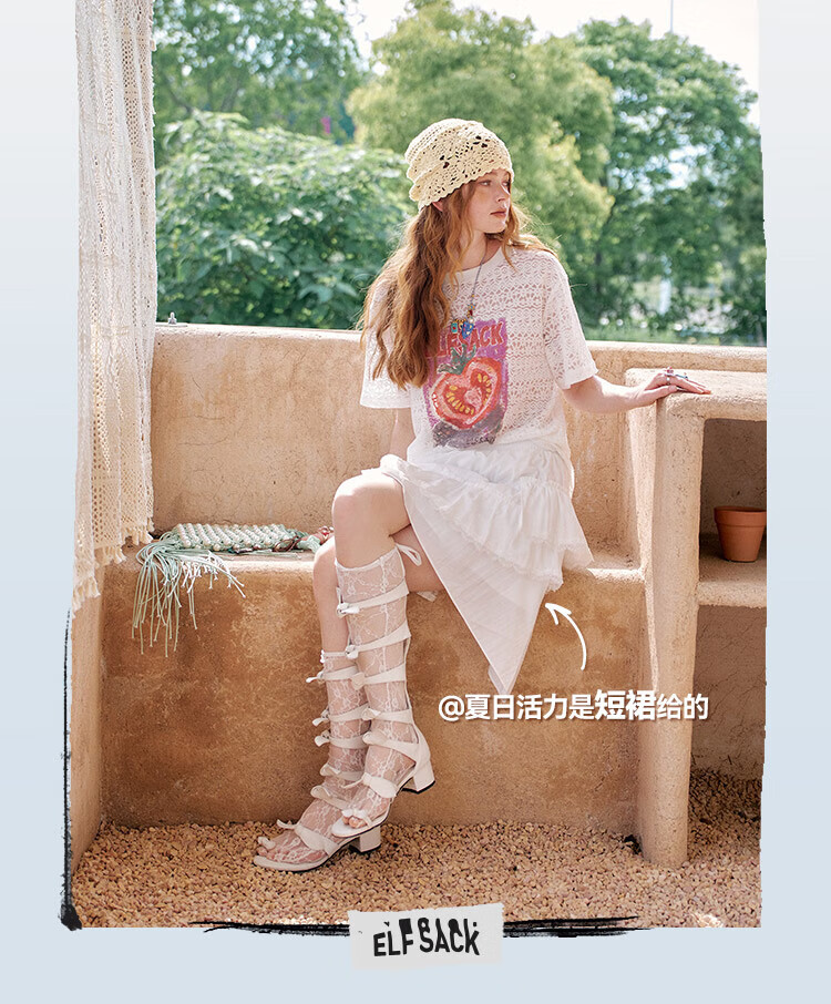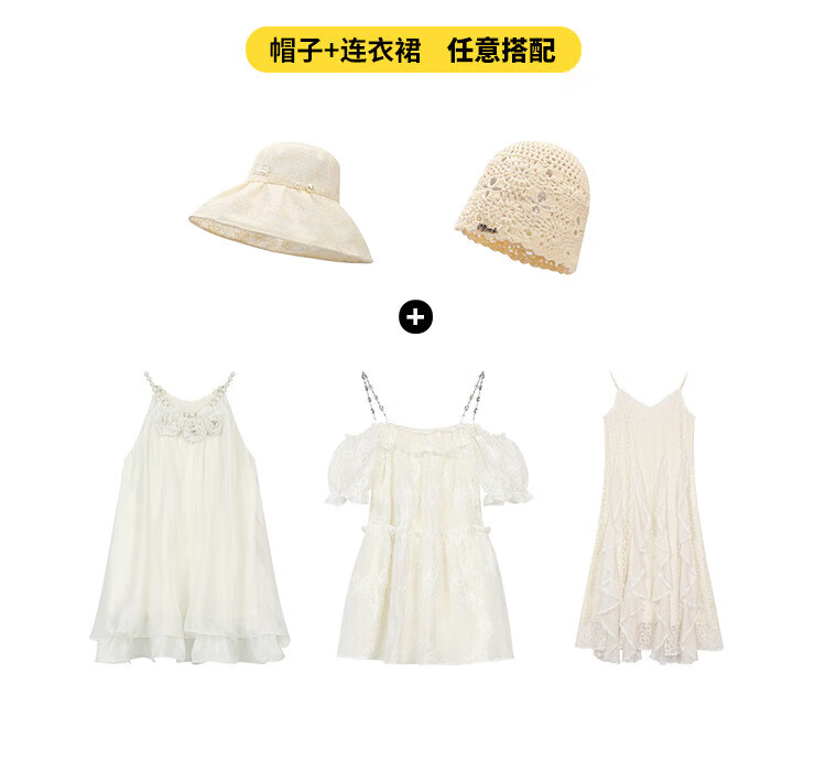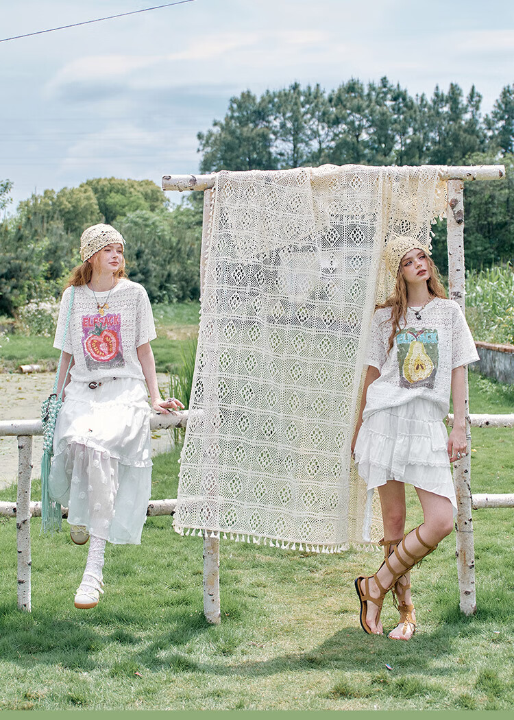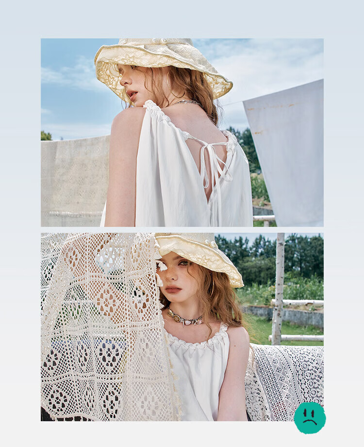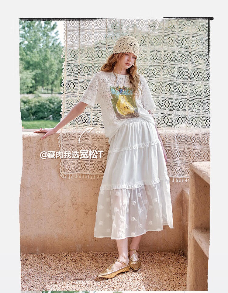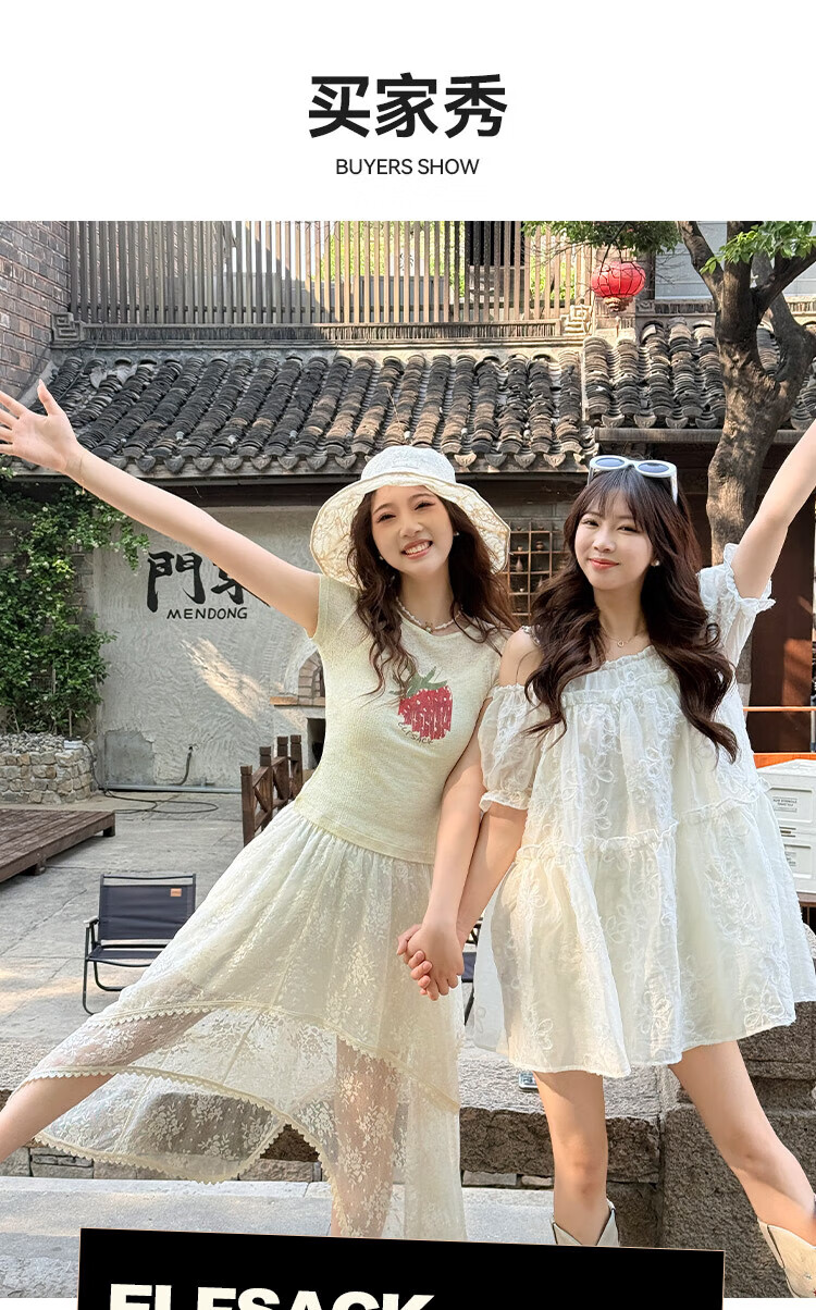 妖精的口袋【嘻嘻不嘻嘻】波嬉风白色连衣裙女25年夏季新款t恤半身裙套装裙 蕾丝米白色(雪纺吊带连衣裙) L