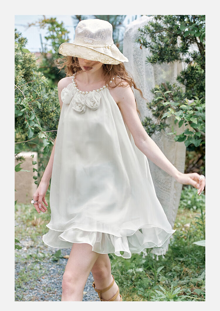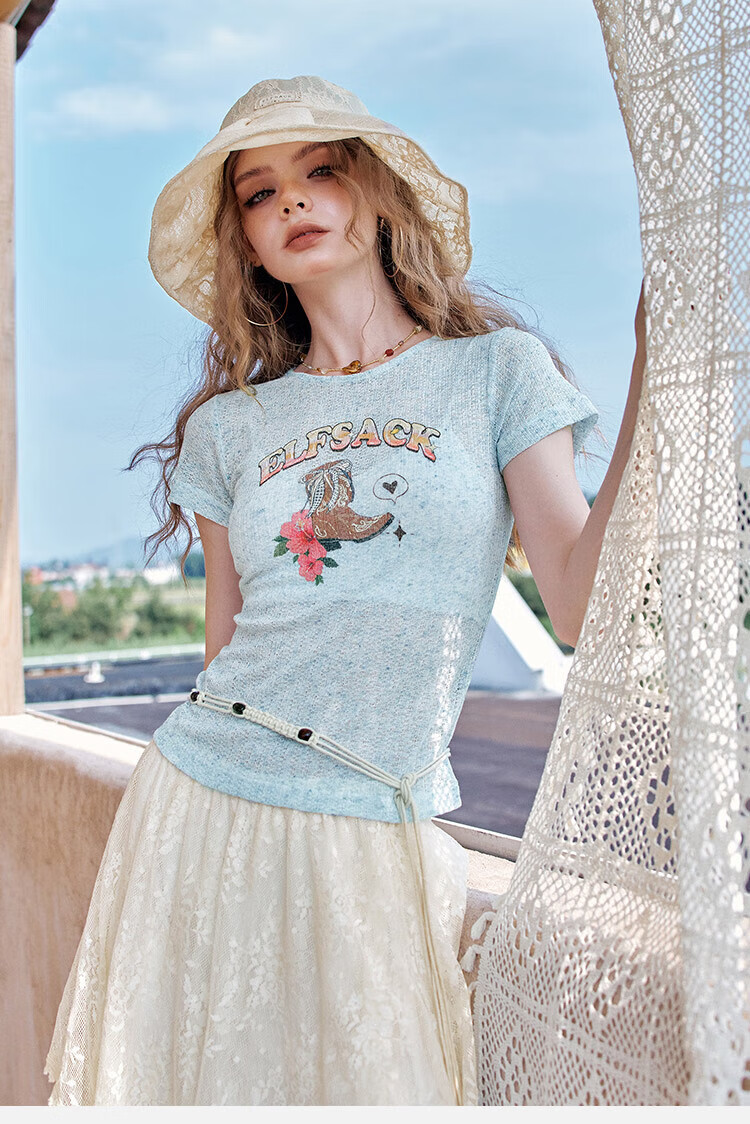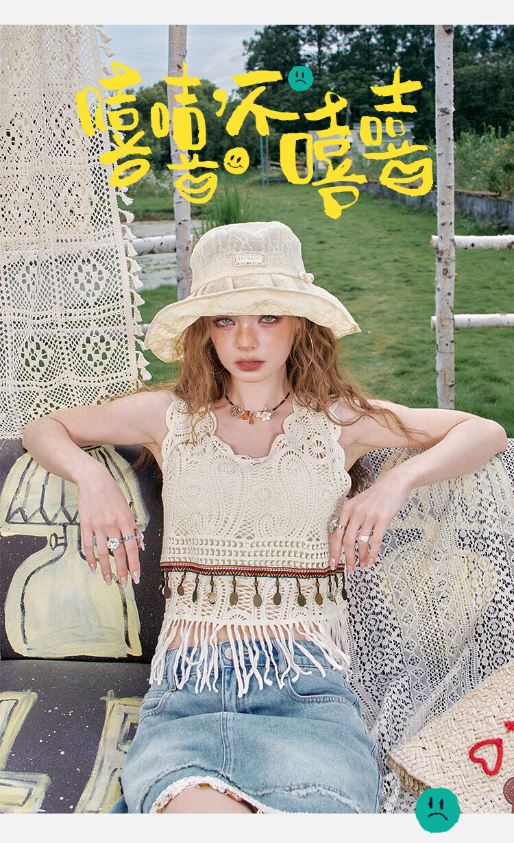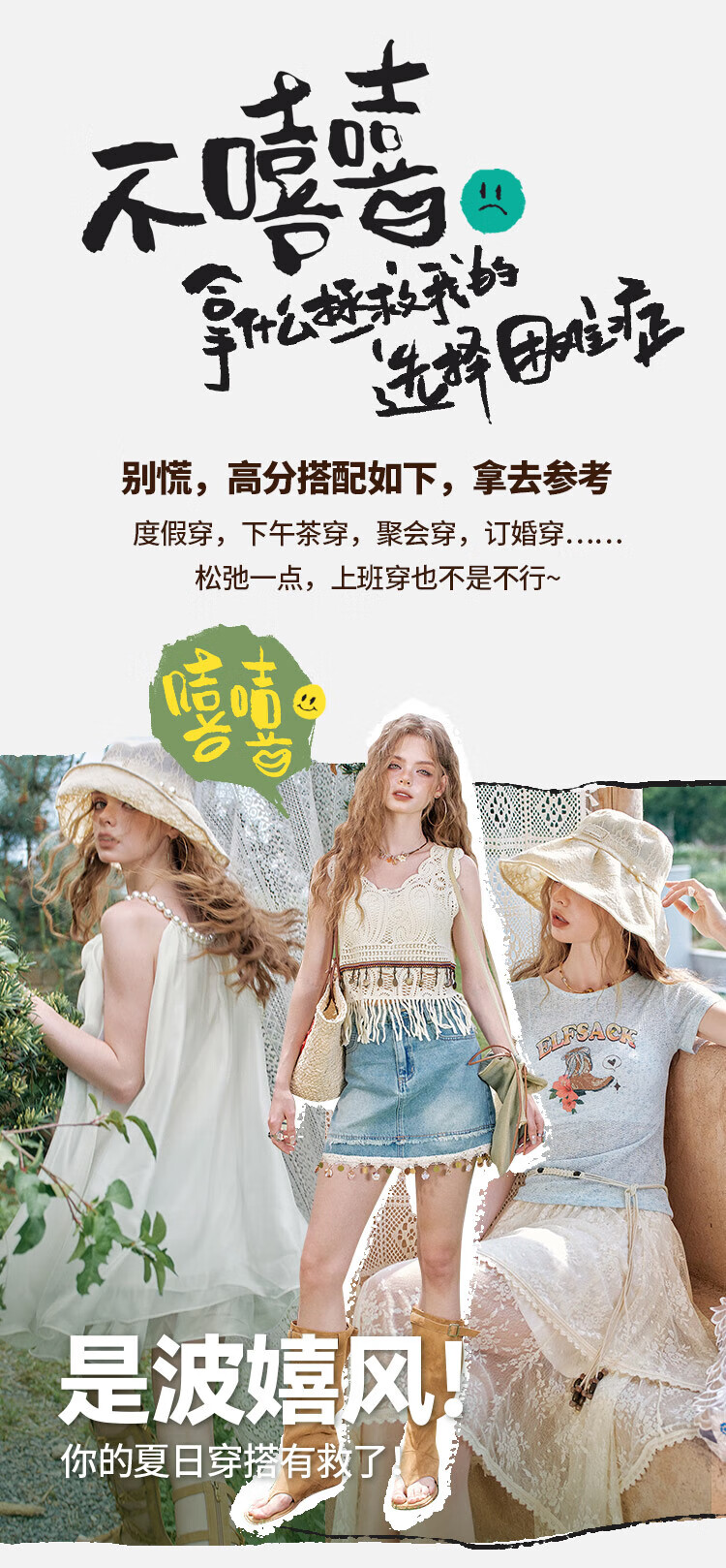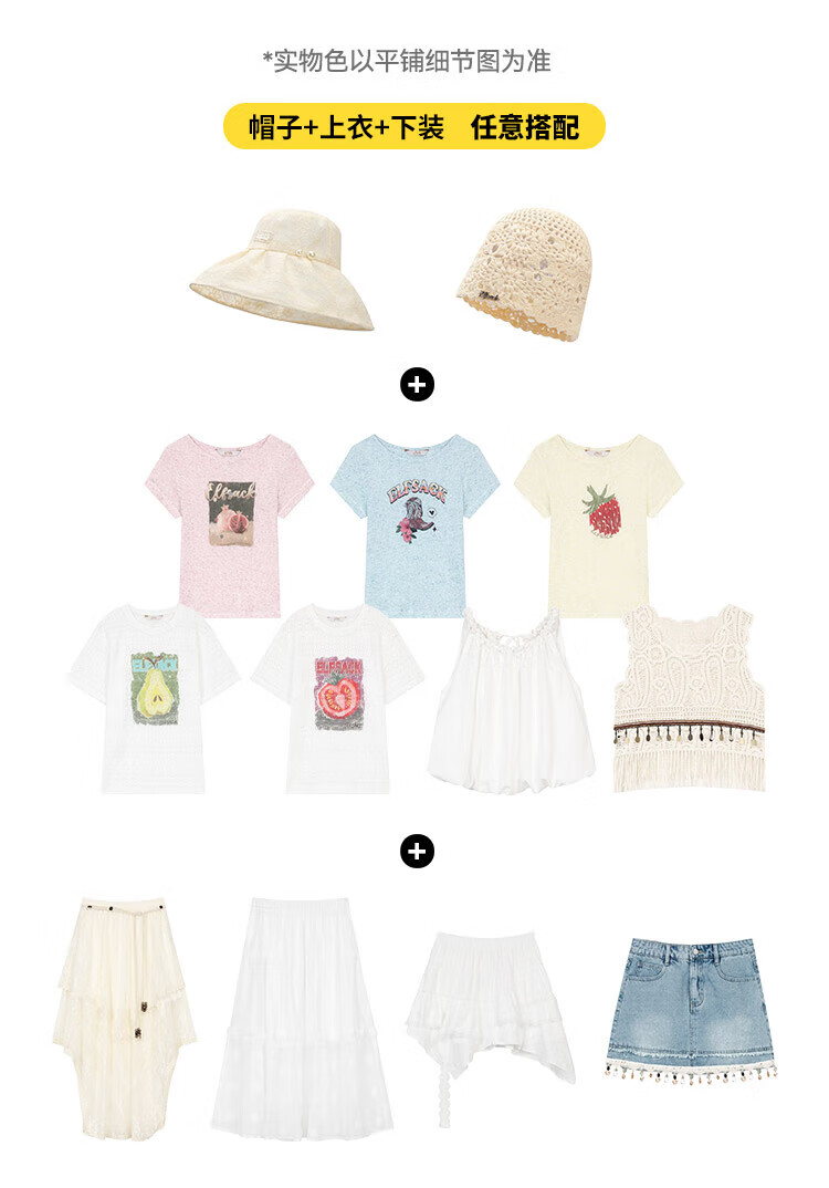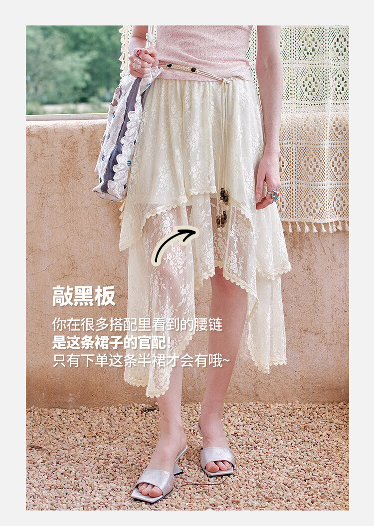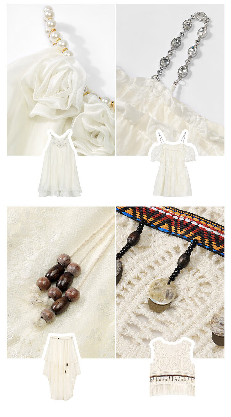 妖精的口袋【嘻嘻不嘻嘻】波嬉风白色连衣裙女25年夏季新款t恤半身裙套装裙 蕾丝米白色(雪纺吊带连衣裙) L