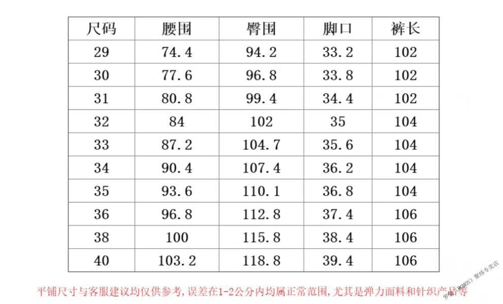 Outseam (cm) 99 cm 101.5 cm 104 cm 106.5 cm 109 cm