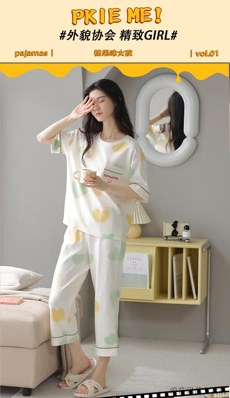 浪莎(LangSha)2025年新款睡衣女夏季纯棉短袖七分裤薄款休闲可外穿家居服舒适 9859【短-袖短-裤】 M 【建议80-100斤穿】