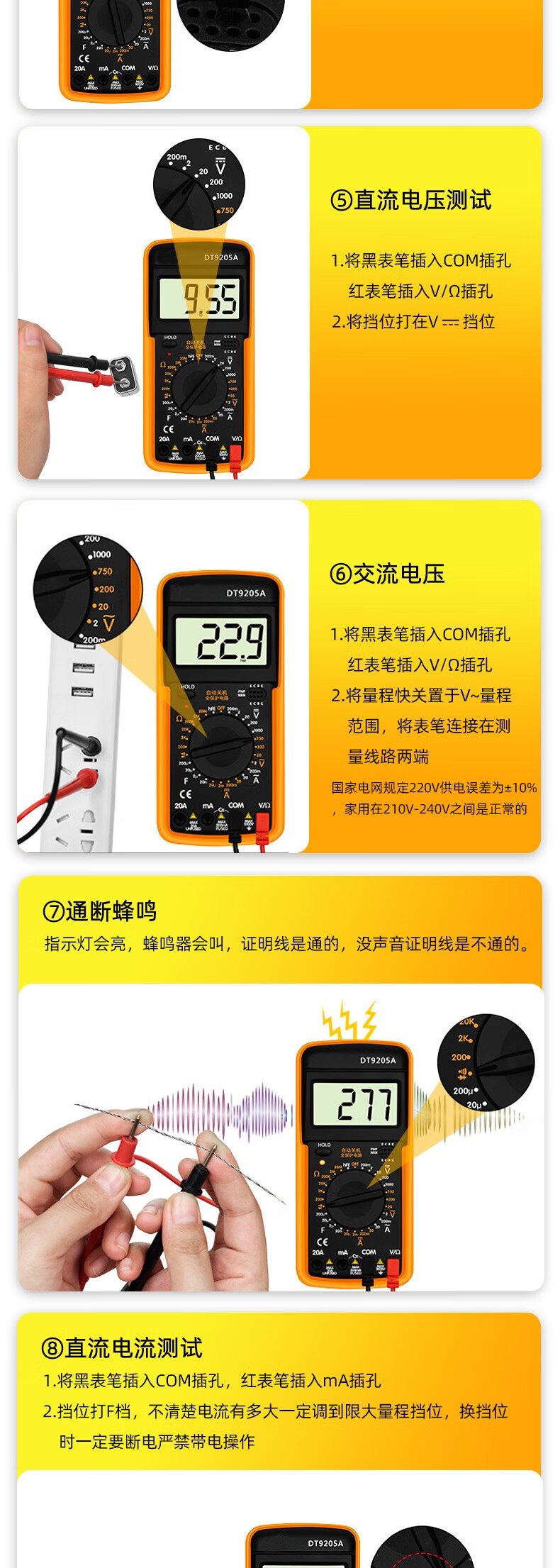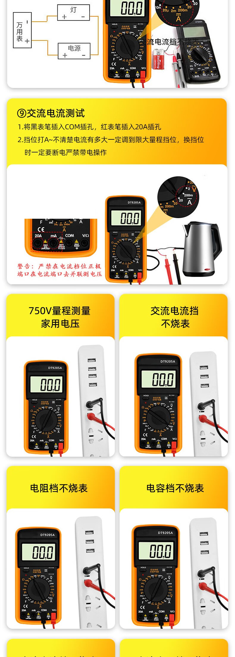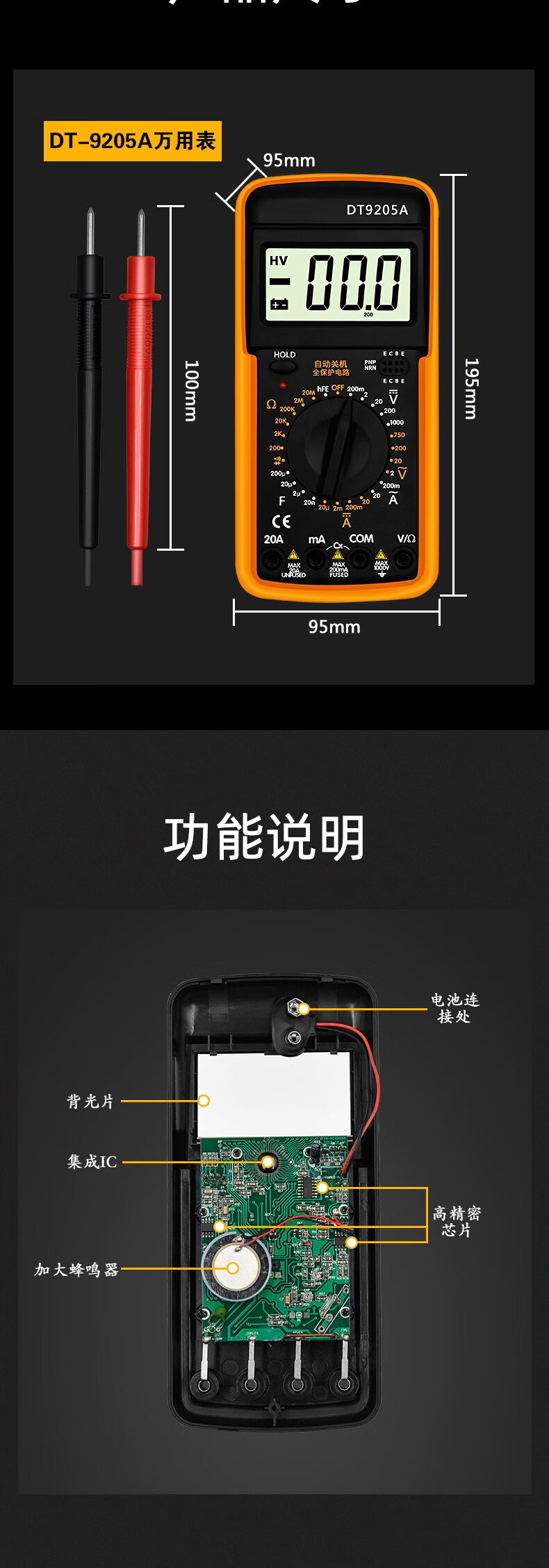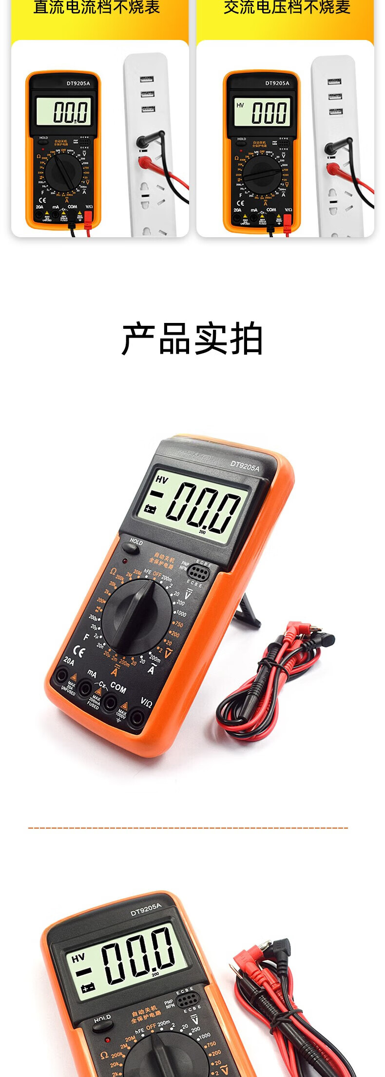 哩也波哩也防烧数字表 DT9205A精度自动家用维修多功能电工万用表电流表 DT9205A万用表升级款带HOLD