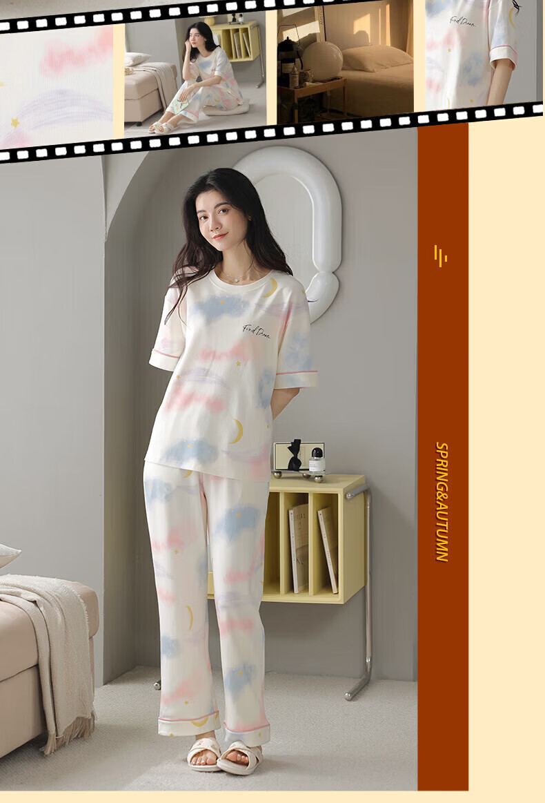 都市丽人夏季睡衣女士纯棉薄款短袖长裤学生可爱韩版套装春秋天宽松家居服 y9715 M 码建议75-95斤