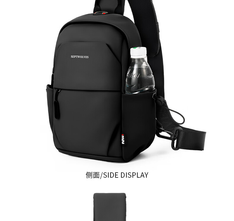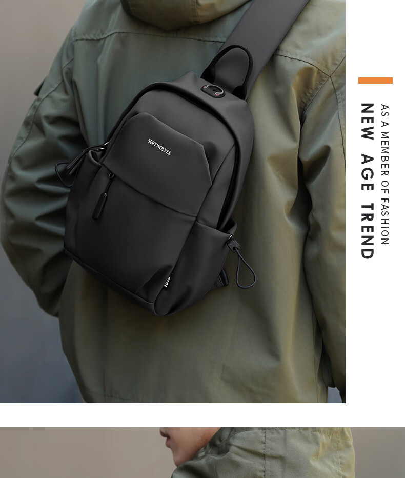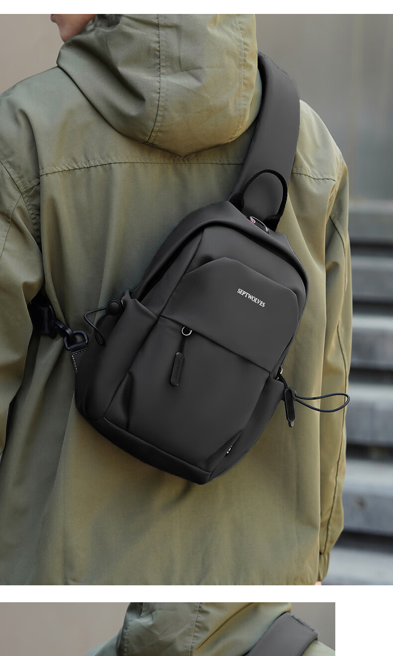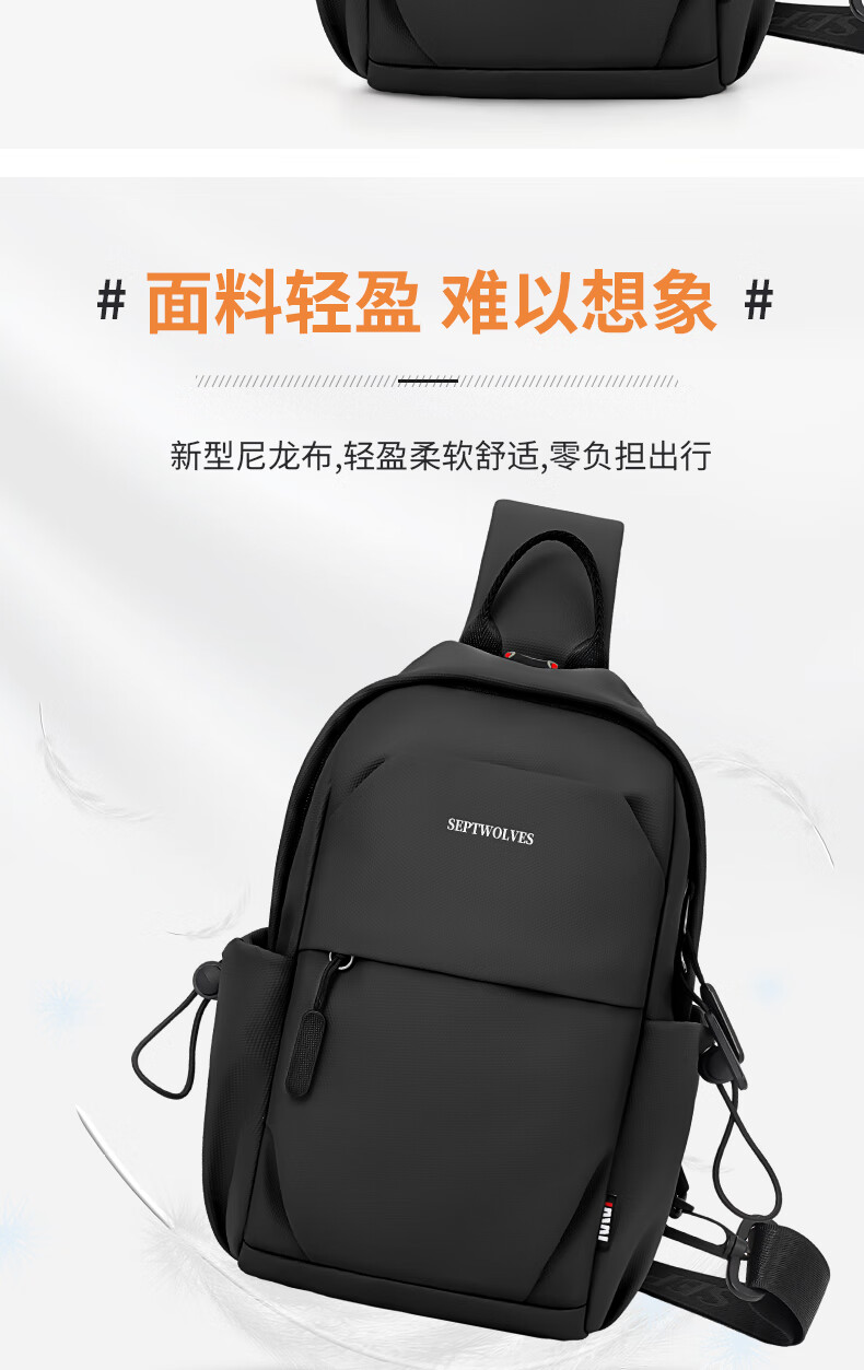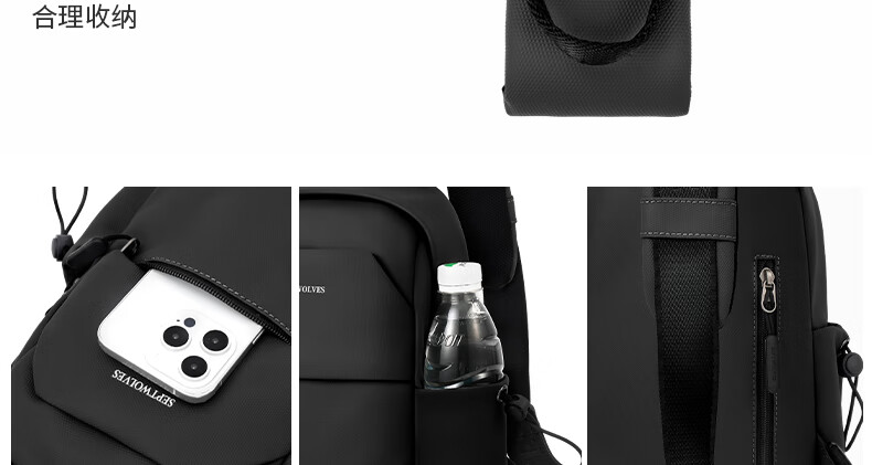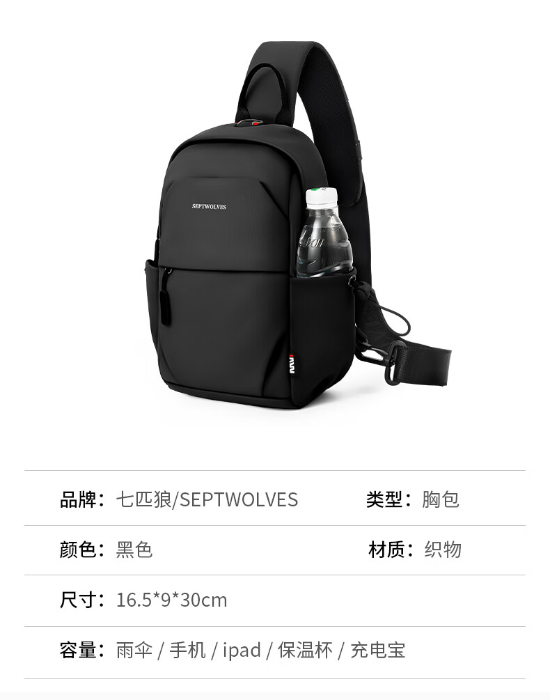 七匹狼男士斜挎包大容量胸包单肩包2025年新款通勤防泼水休闲便携小背包 黑色【升级七层仓 侧袋可放雨伞水杯】