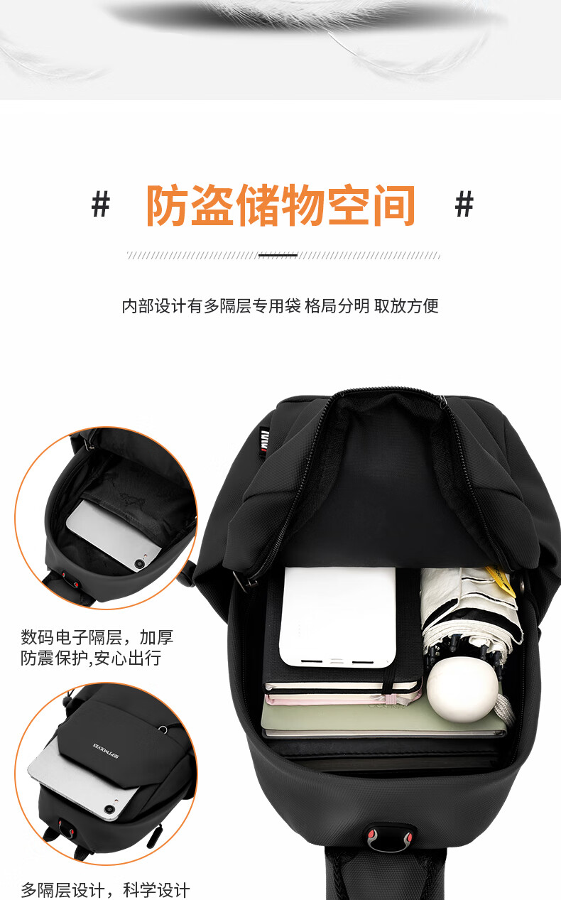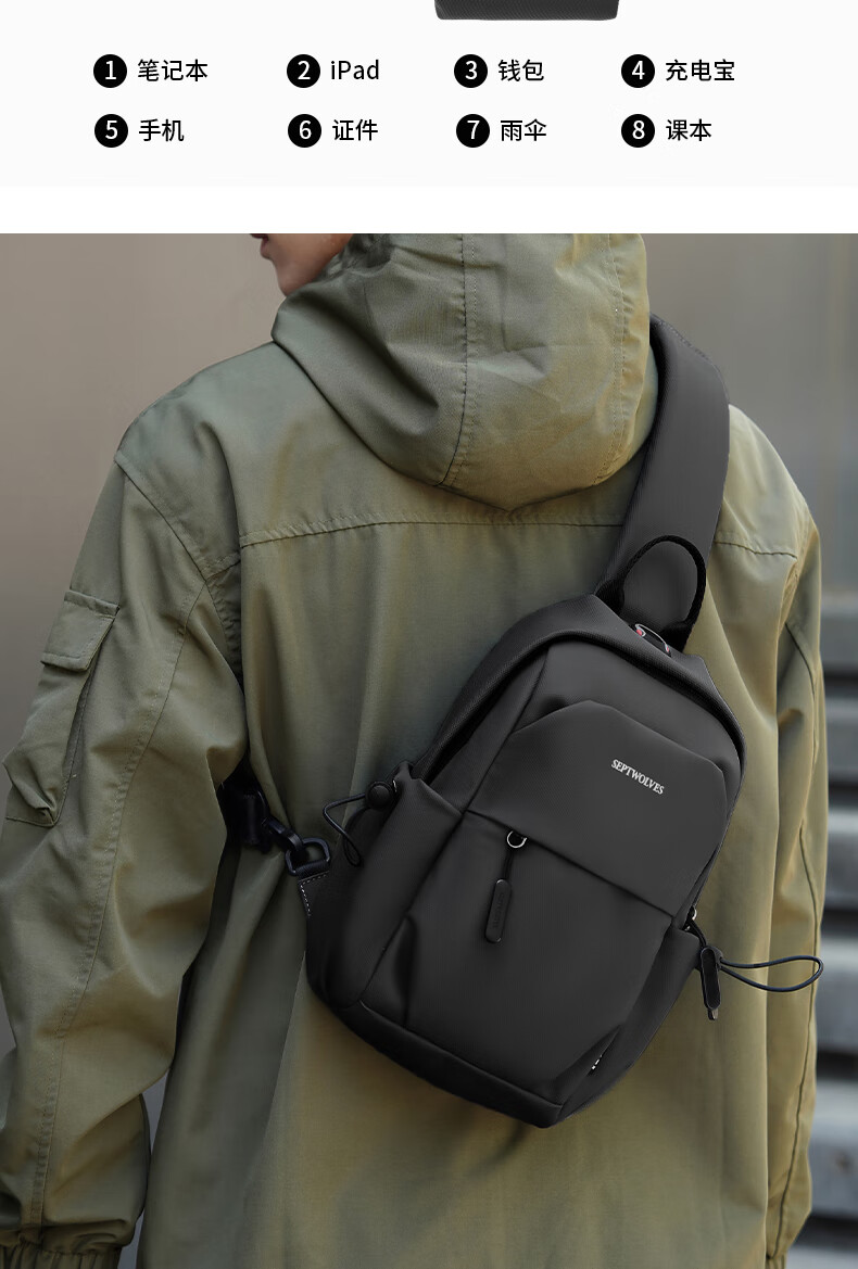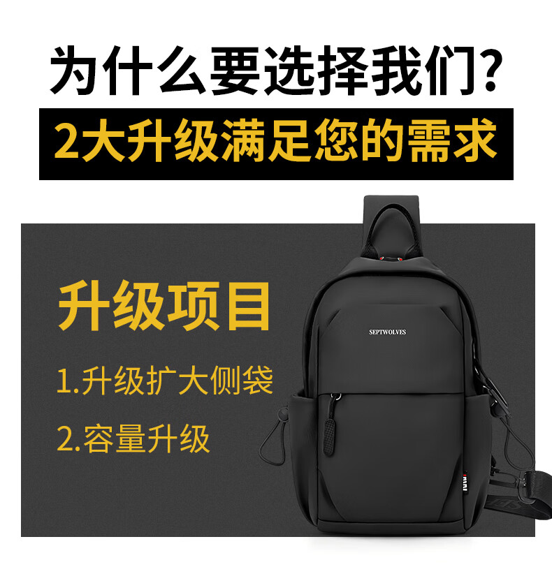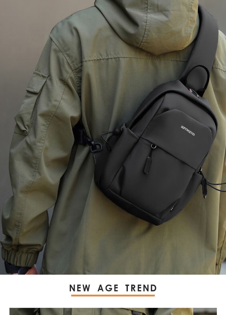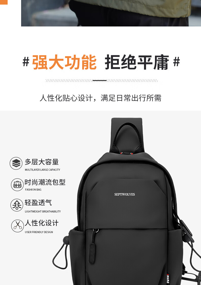 七匹狼男士斜挎包大容量胸包单肩包2025年新款通勤防泼水休闲便携小背包 黑色【升级七层仓 侧袋可放雨伞水杯】