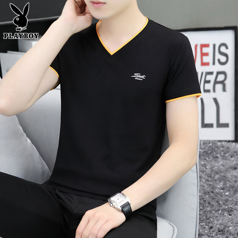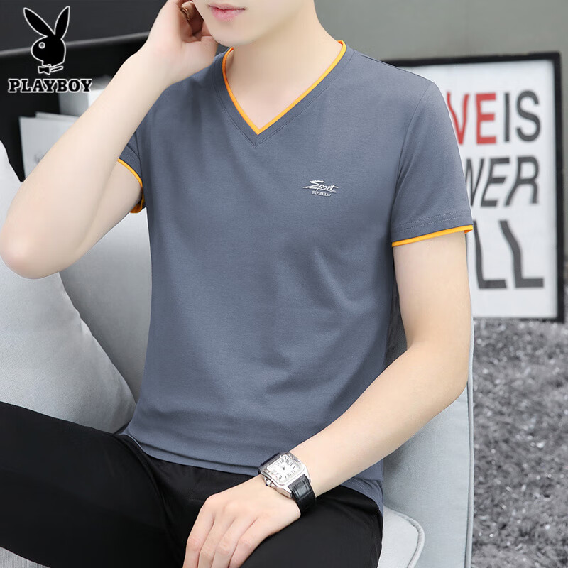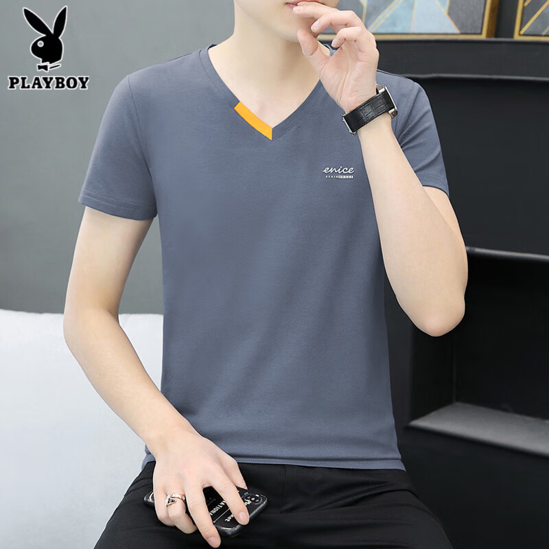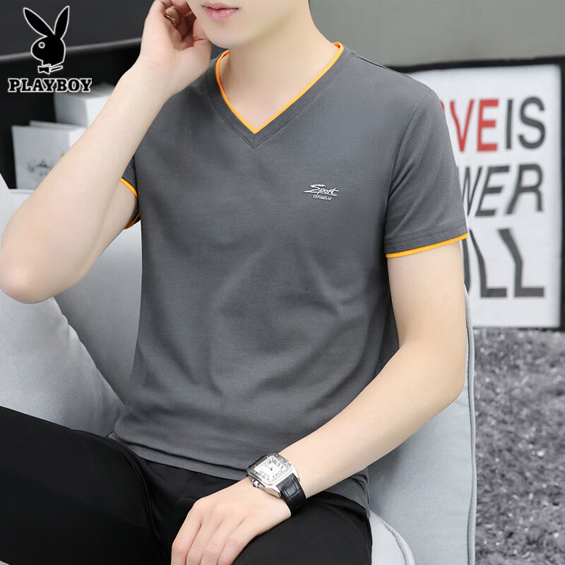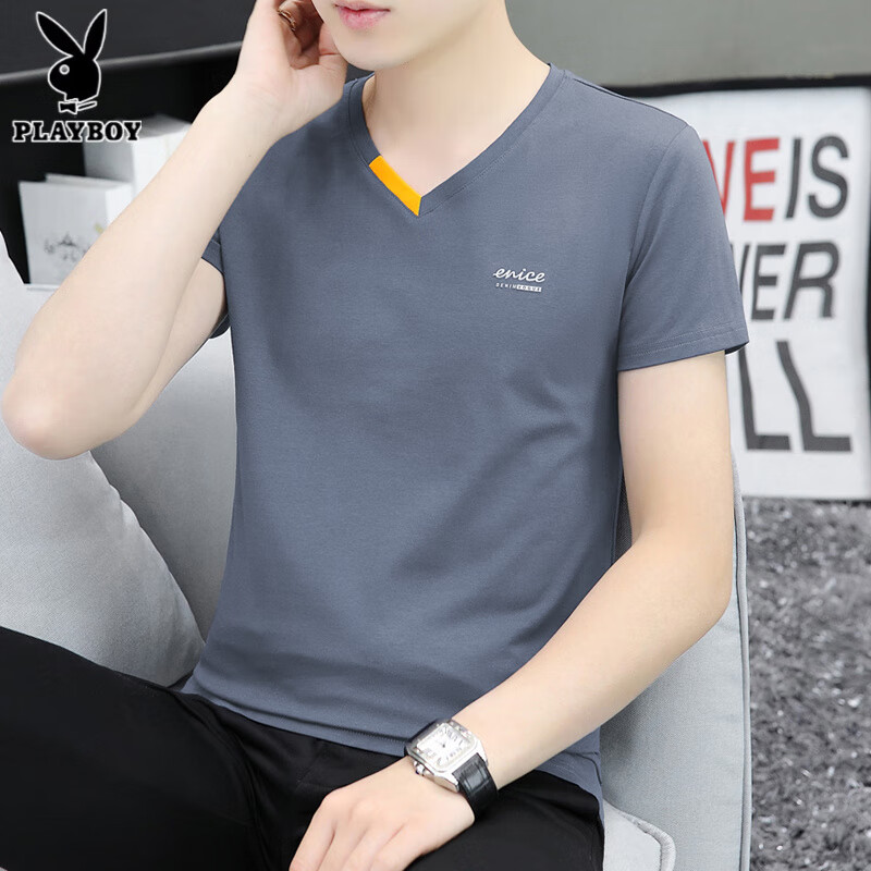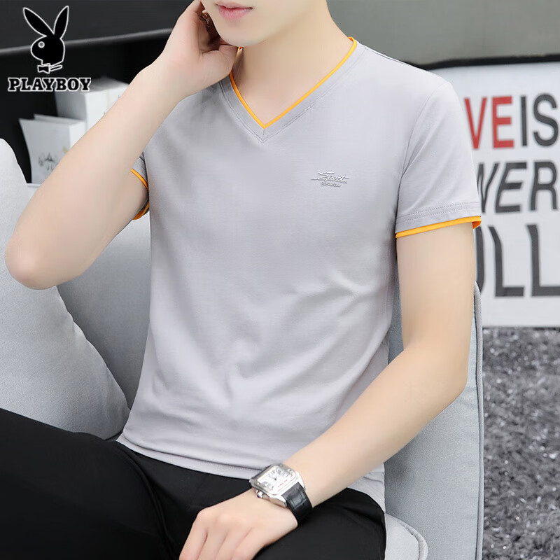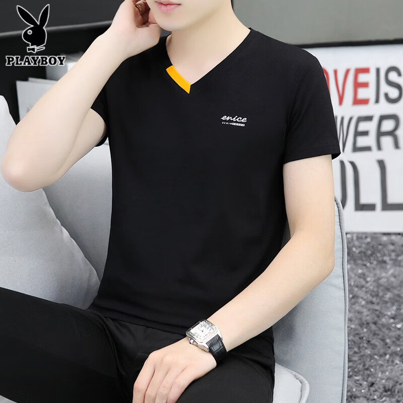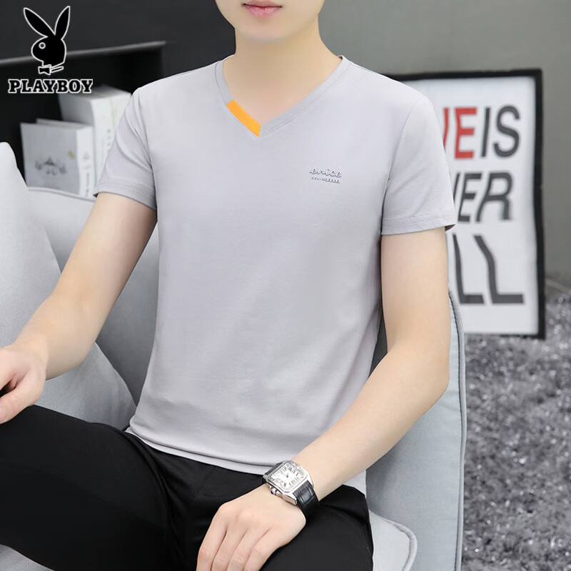 花花公子(PLAYBOY)夏季新款男士纯棉V领半袖T恤潮流休闲小字母印花鸡心领短袖体恤衫 691 白色 M 90-100斤