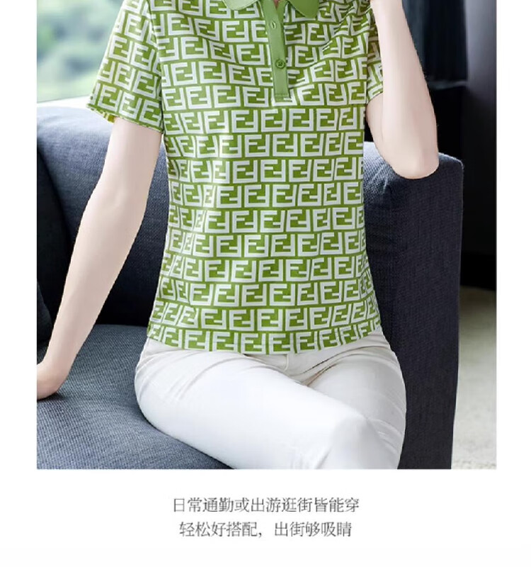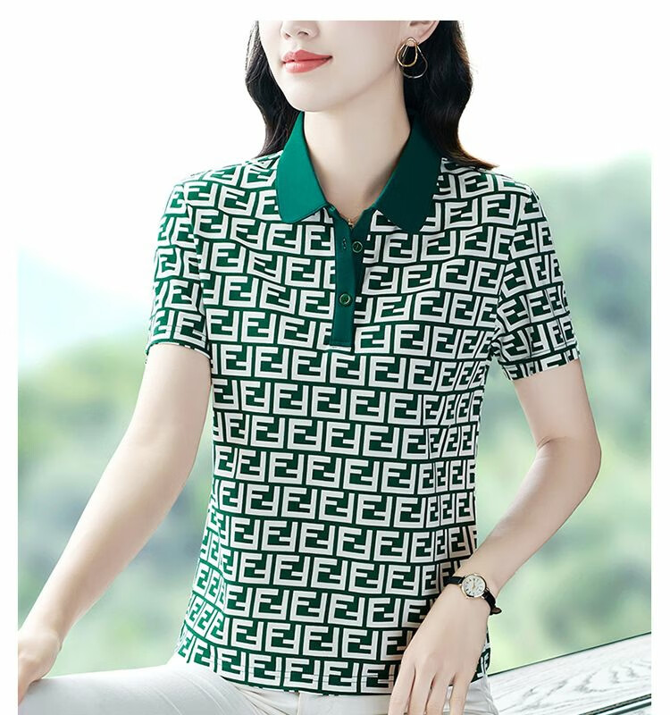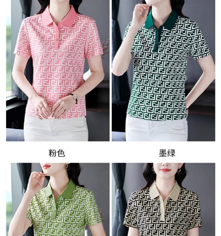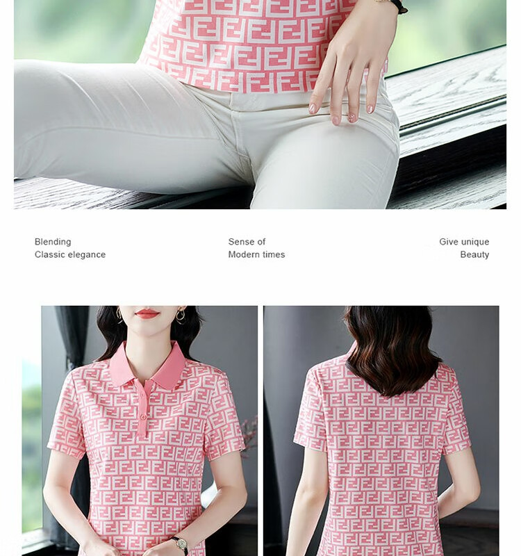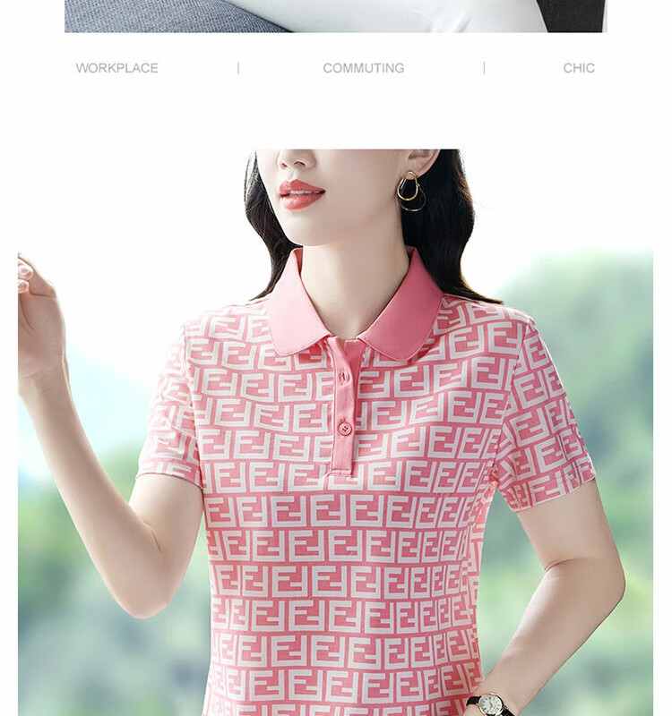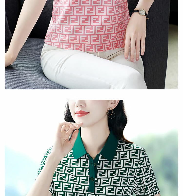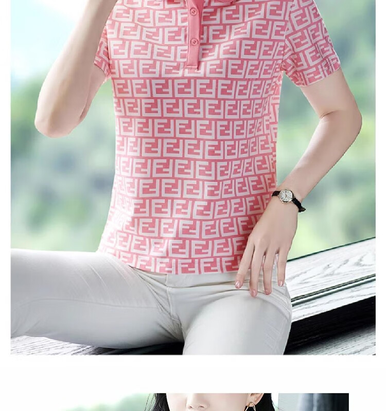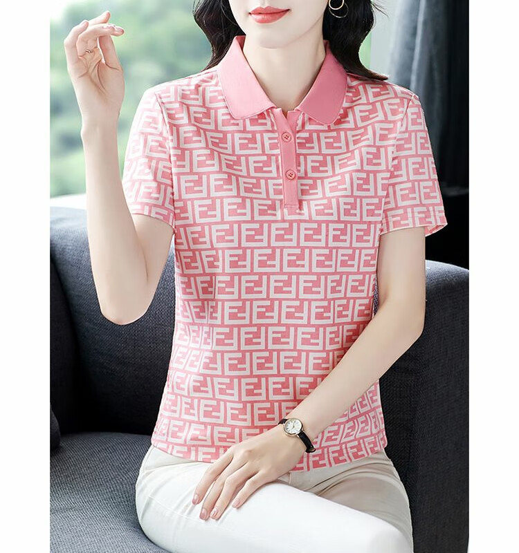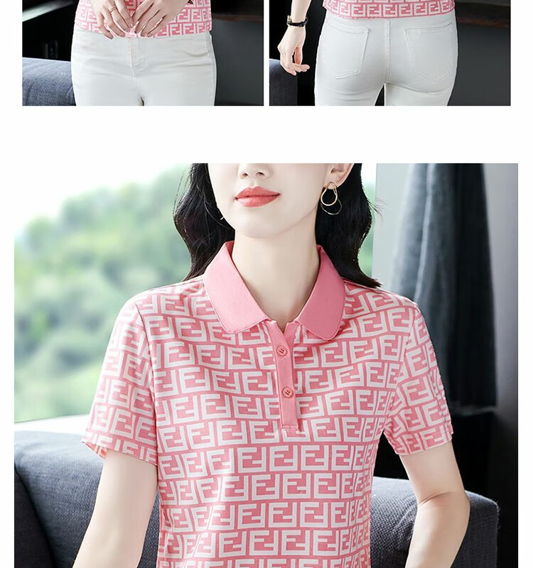 洋气妈妈翻领短袖t恤女士夏季2024新款宽松显瘦POLO衫女印花上衣 829-粉色 829-粉色 M 【建议85-100斤】