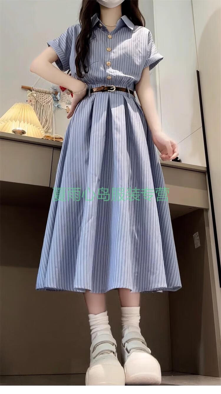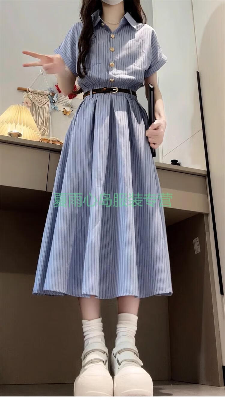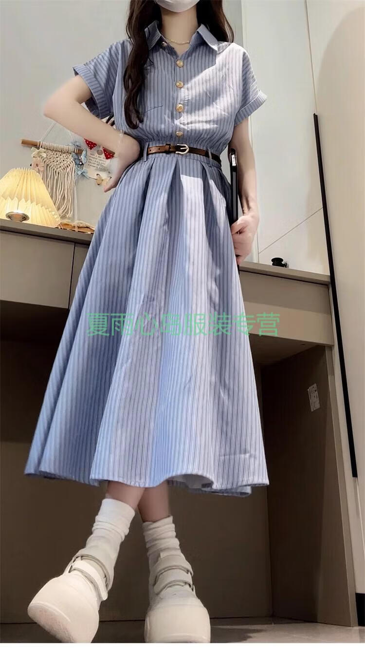 啄木鸟2025新款韩系学院风蓝色短袖衬衫连衣裙子女夏季气质收腰长裙 蓝色送腰带独特漂亮约会穿搭/今 S 40/45kg