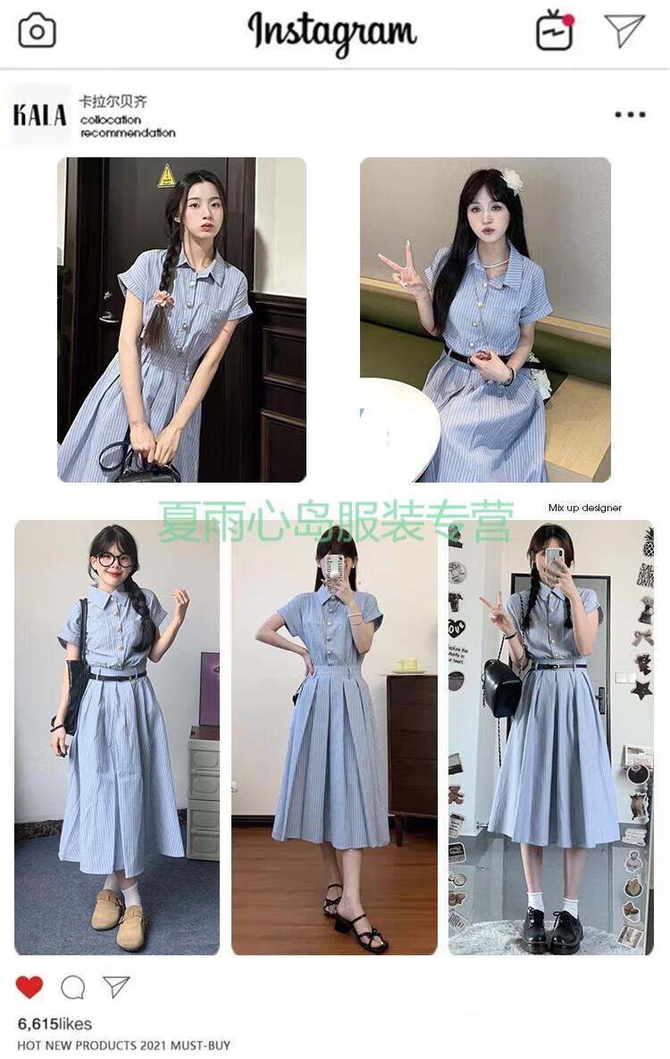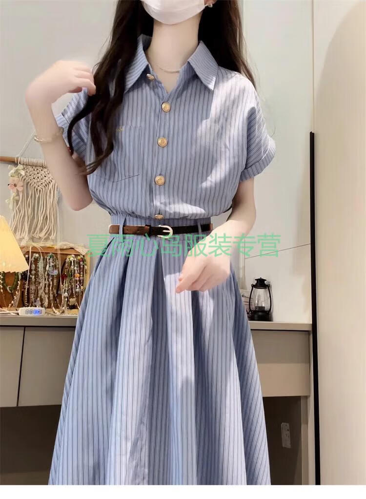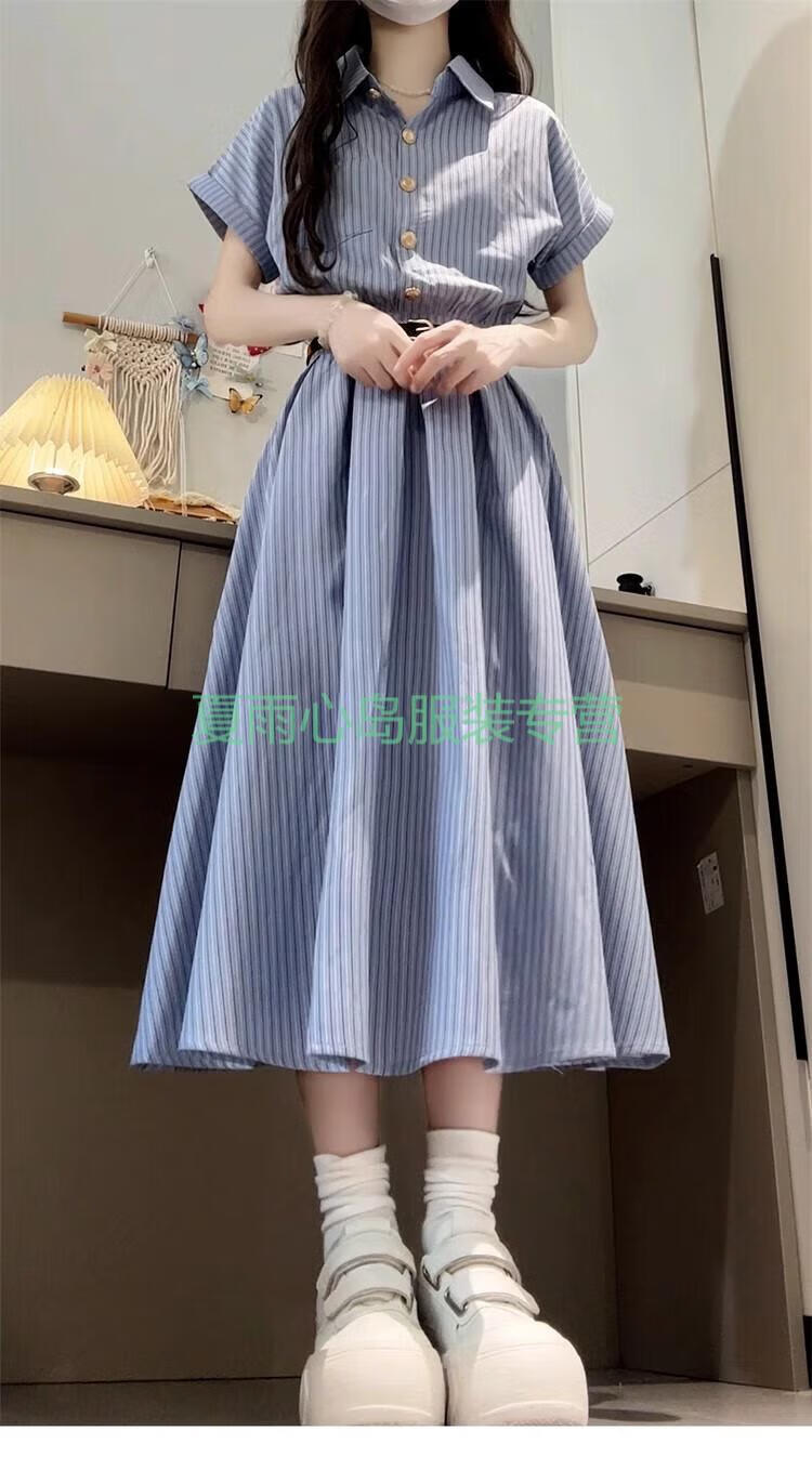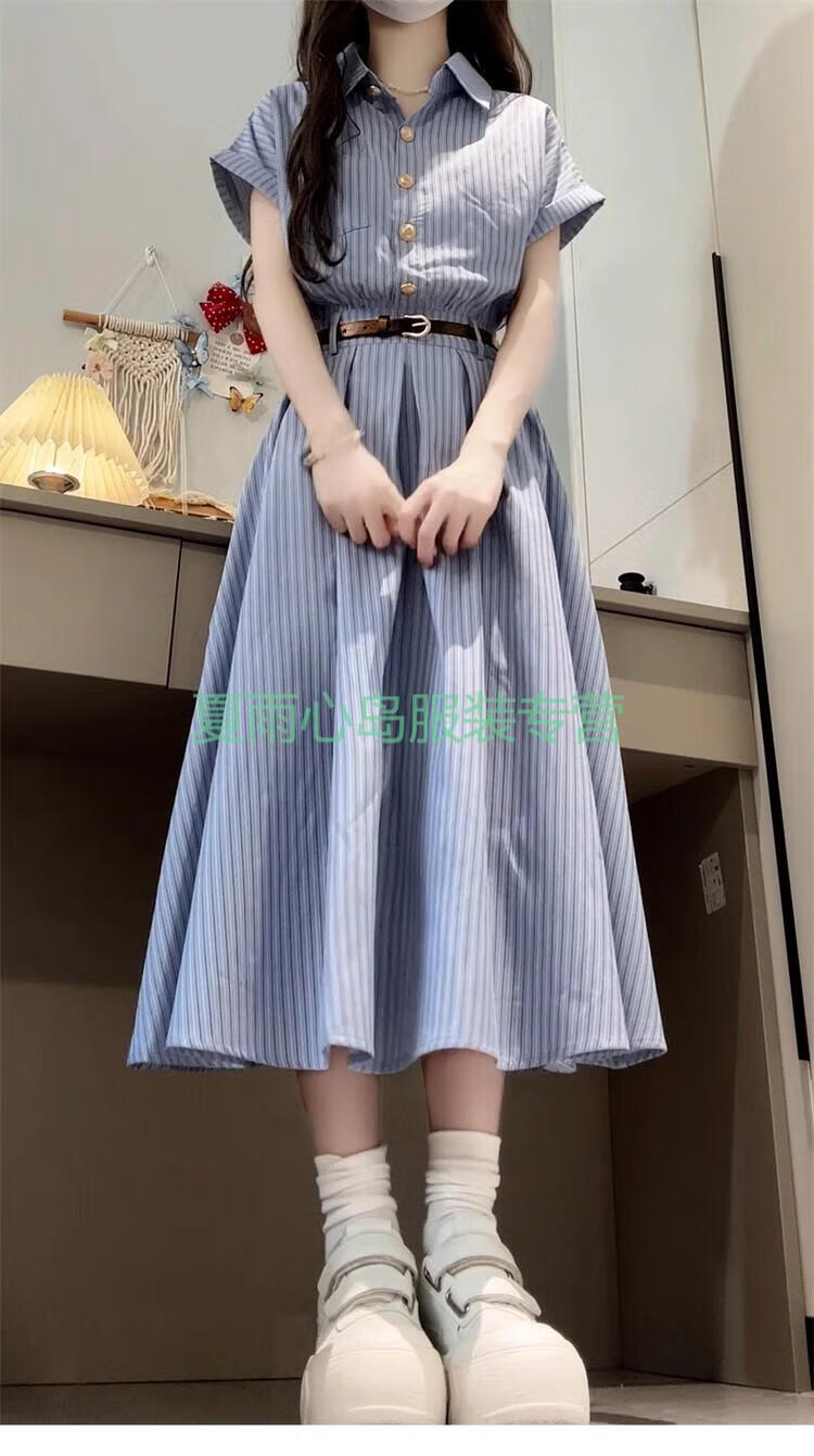 啄木鸟2025新款韩系学院风蓝色短袖衬衫连衣裙子女夏季气质收腰长裙 蓝色送腰带独特漂亮约会穿搭/今 S 40/45kg