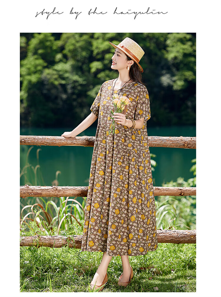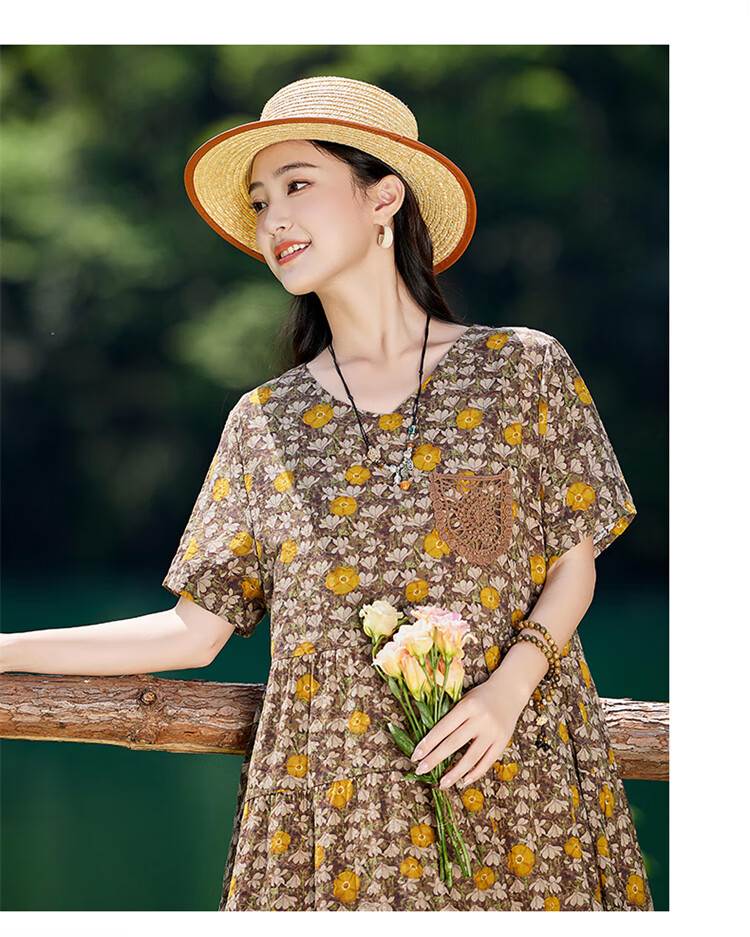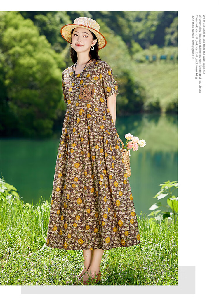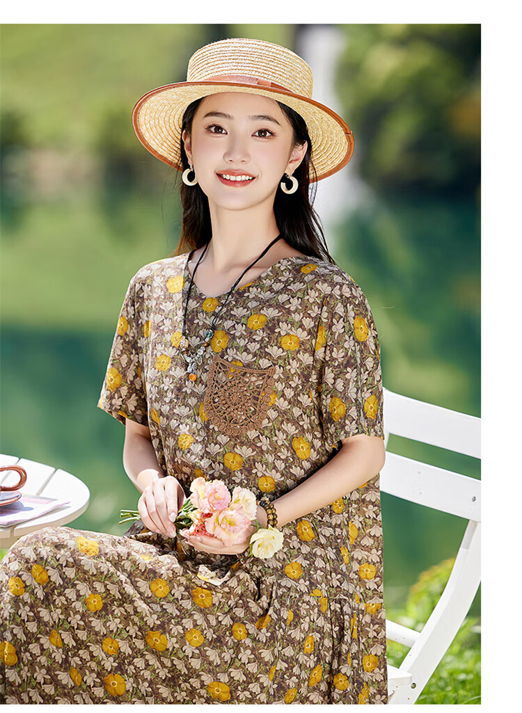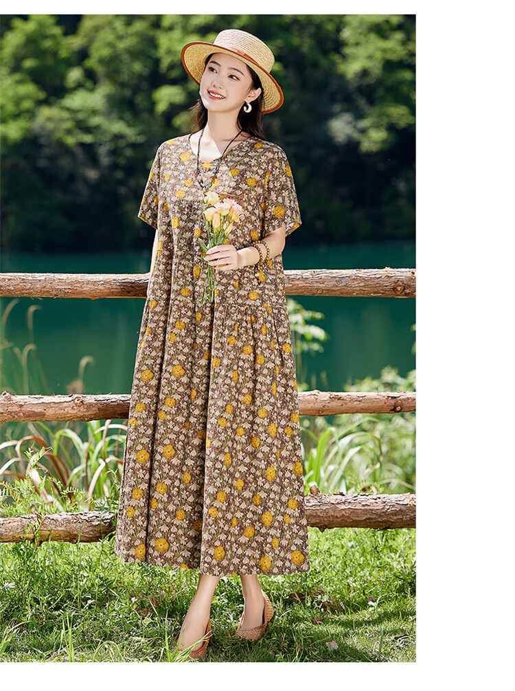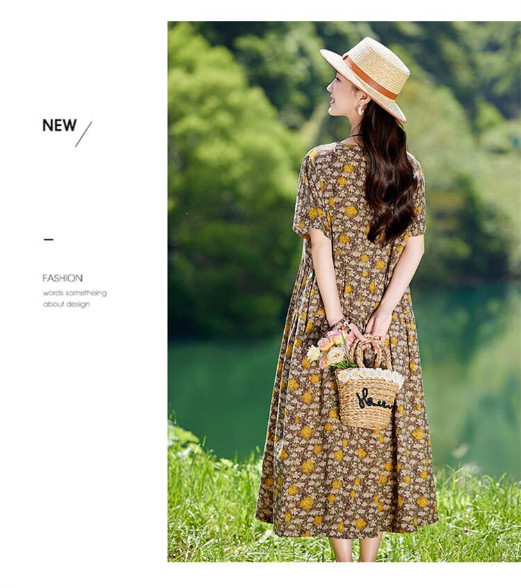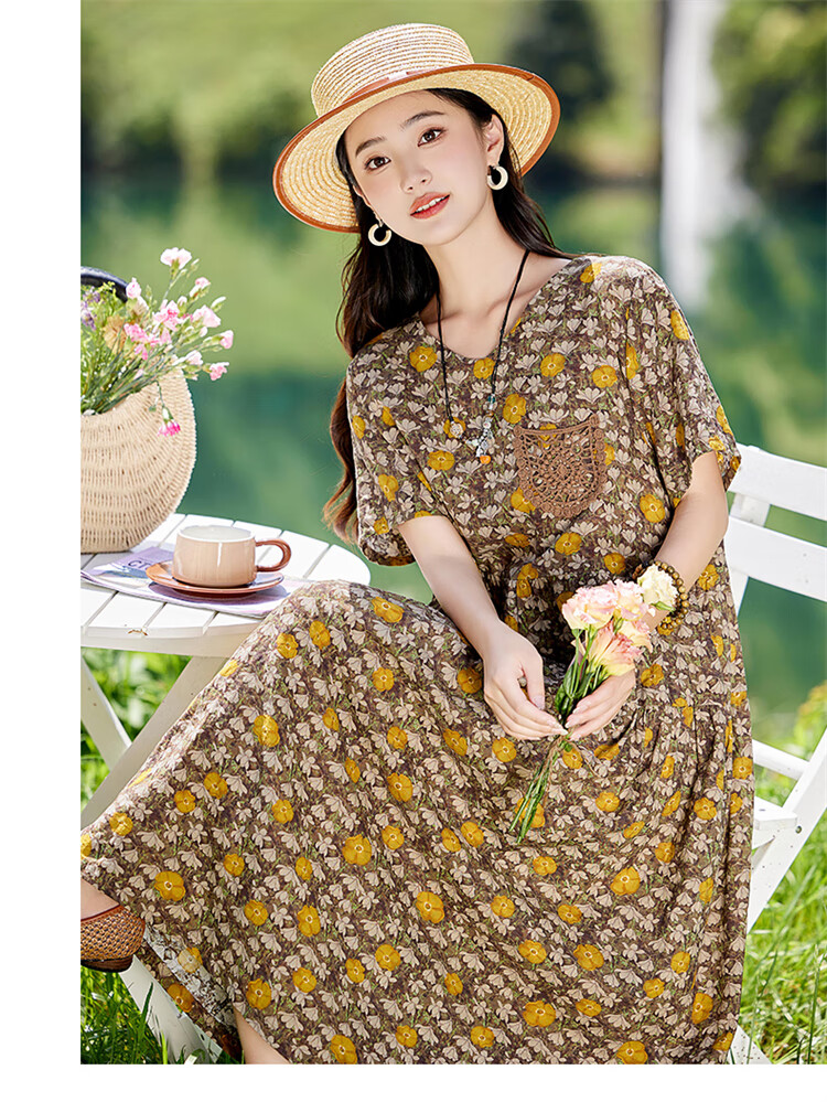 XAE奢侈高档品牌短袖连衣裙女2025夏季新款复古宽松休闲显瘦碎花裙 米色 XL 建议120-130斤