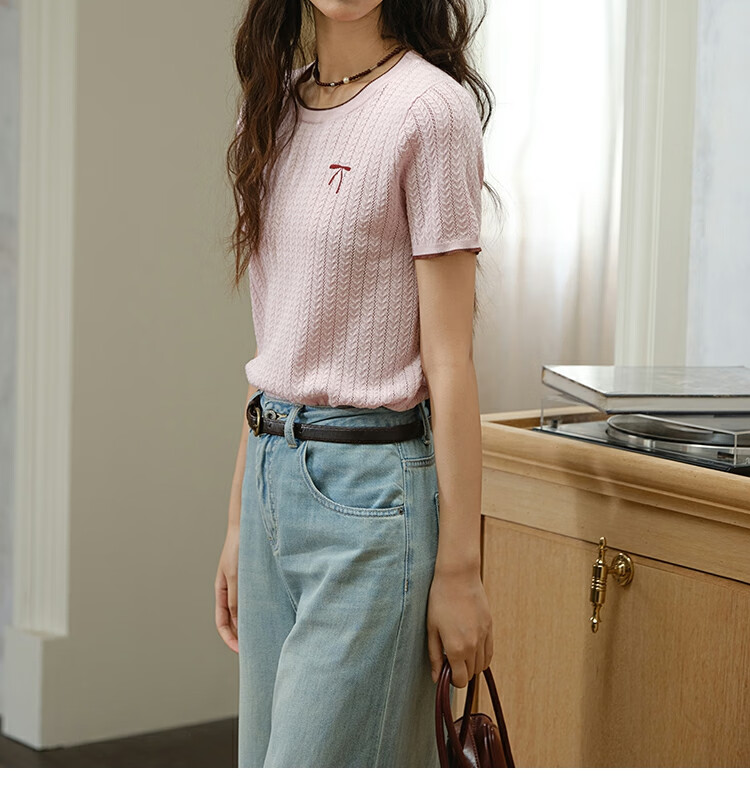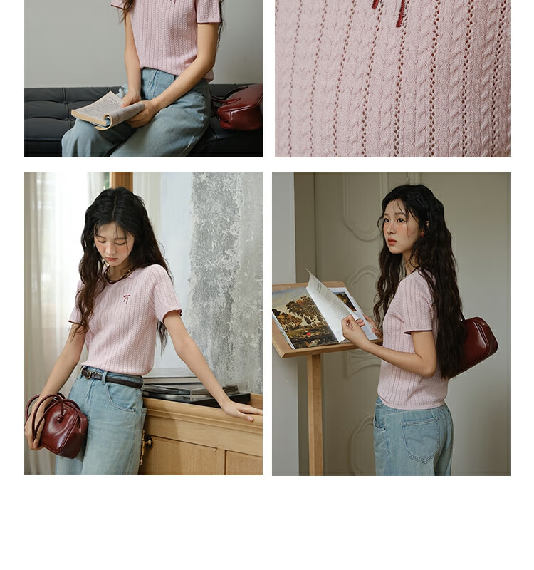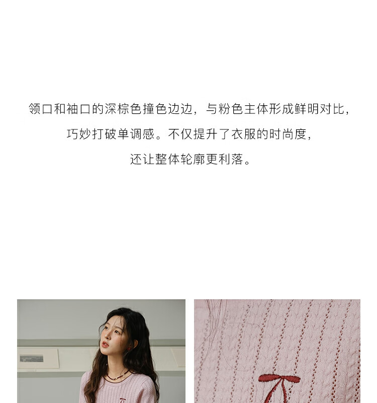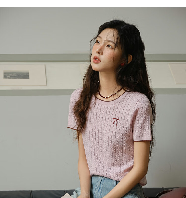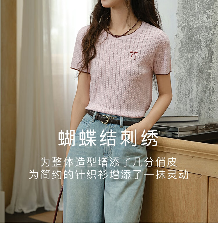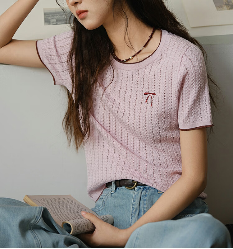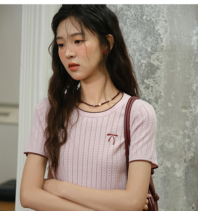 谜秀樱花粉挑空扭绳针织衫2025夏季新款蝴蝶结刺绣撞色边设计短款上衣 花色 樱花粉 上衣 M