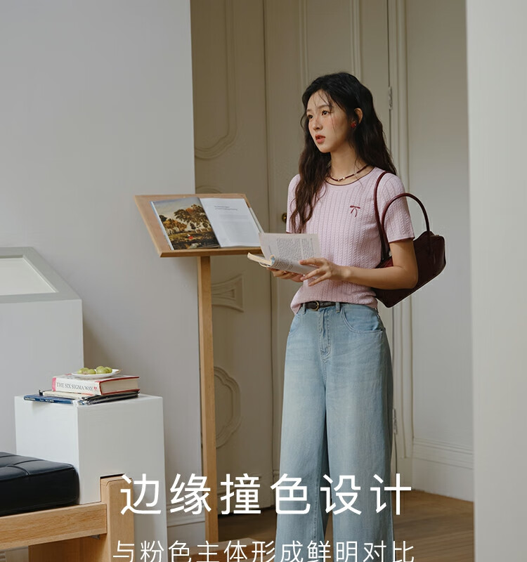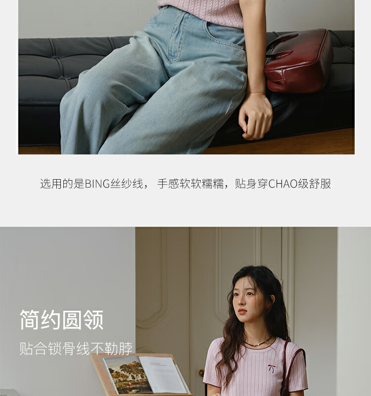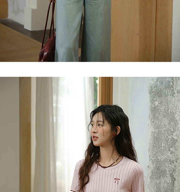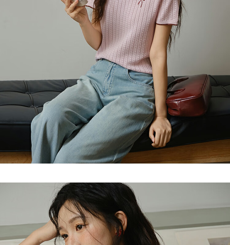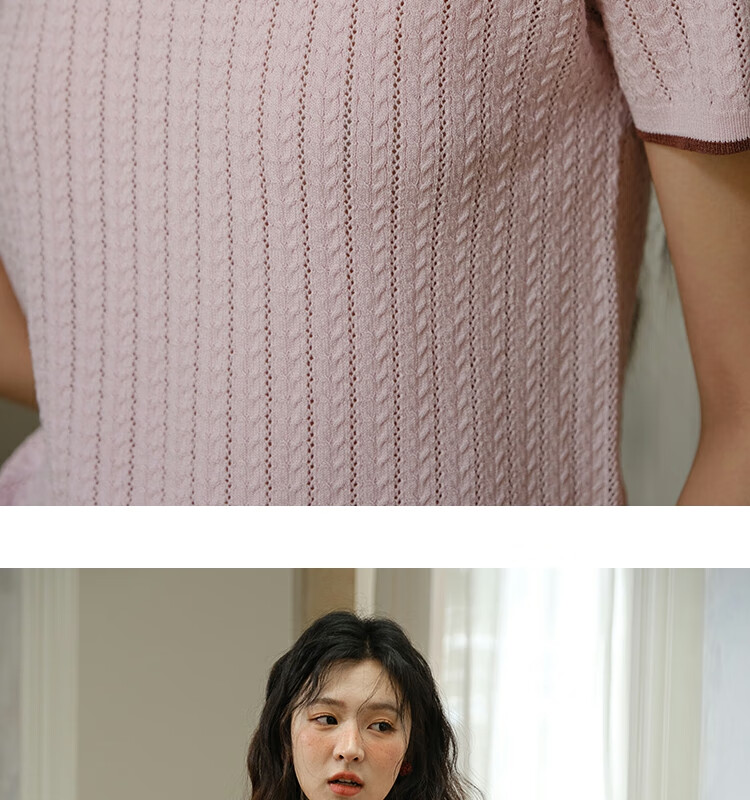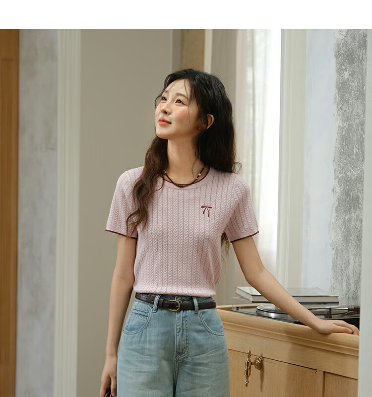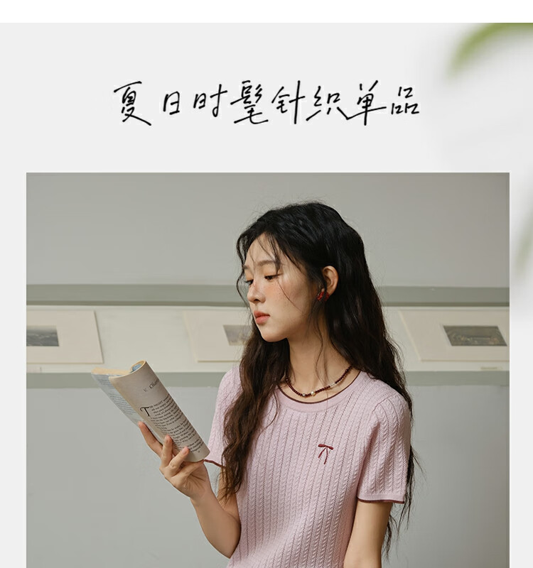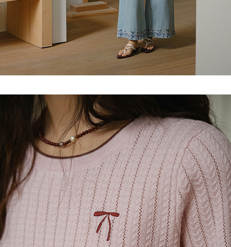 谜秀樱花粉挑空扭绳针织衫2025夏季新款蝴蝶结刺绣撞色边设计短款上衣 花色 樱花粉 上衣 M