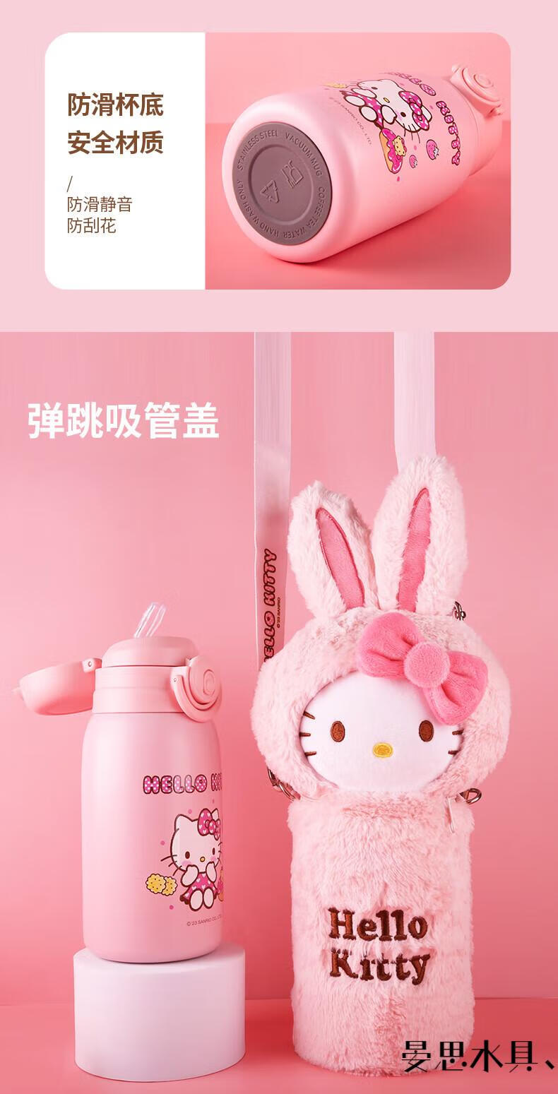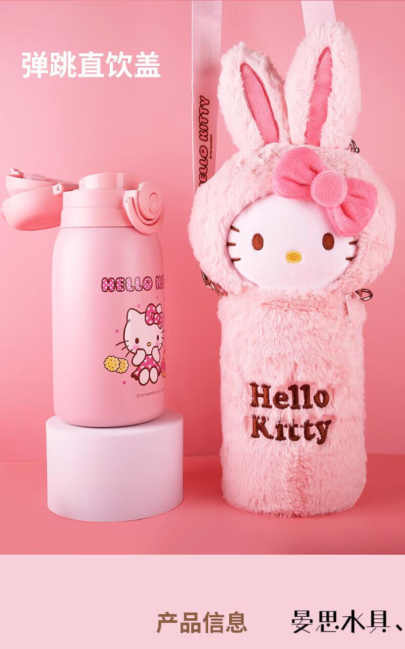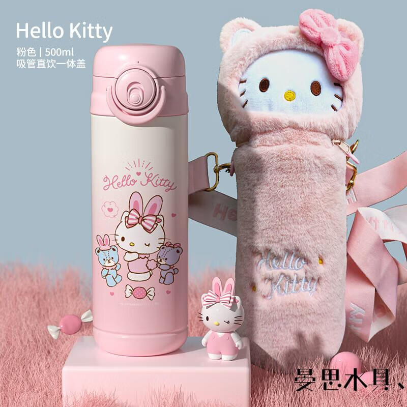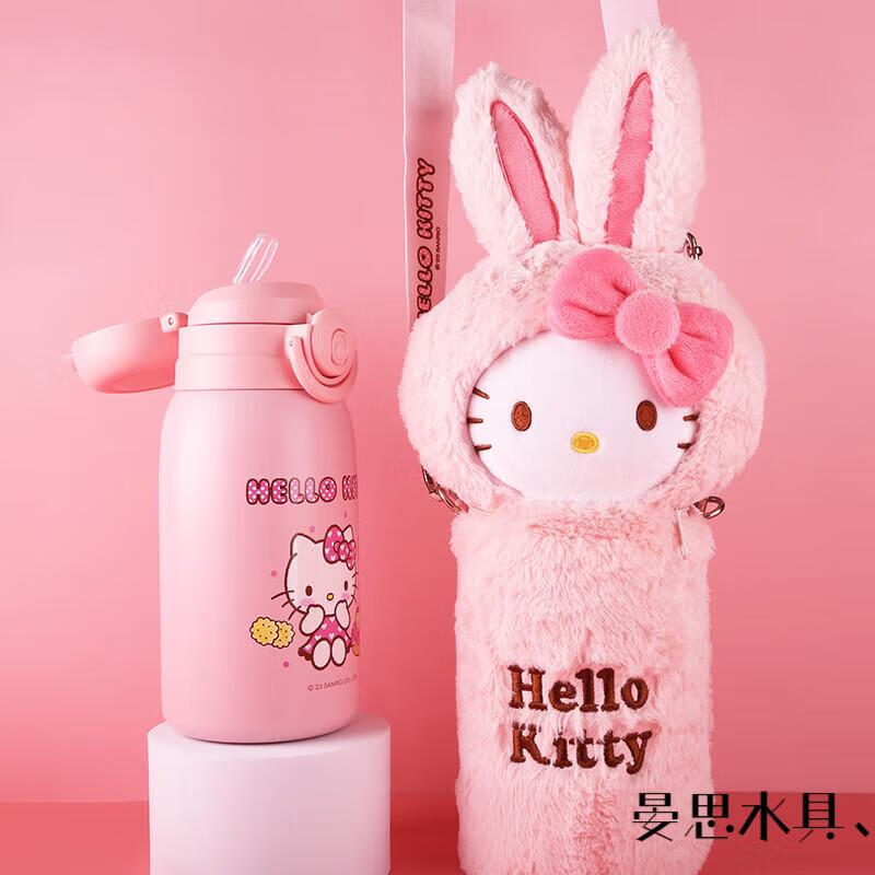 Disney Hello Kitty Children's Straw Thermos Cup Plush Cup Cover High-Looking Girl Water Cup Kindergarten Cute 316 Kettle 6625 Plush Powder 500ML