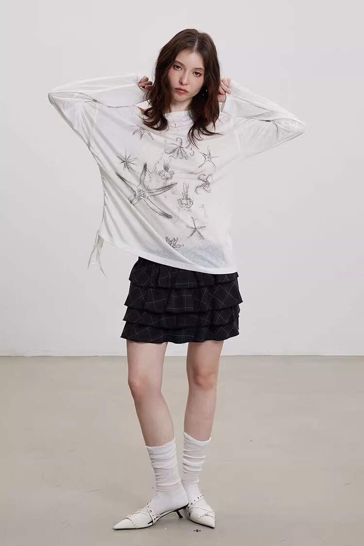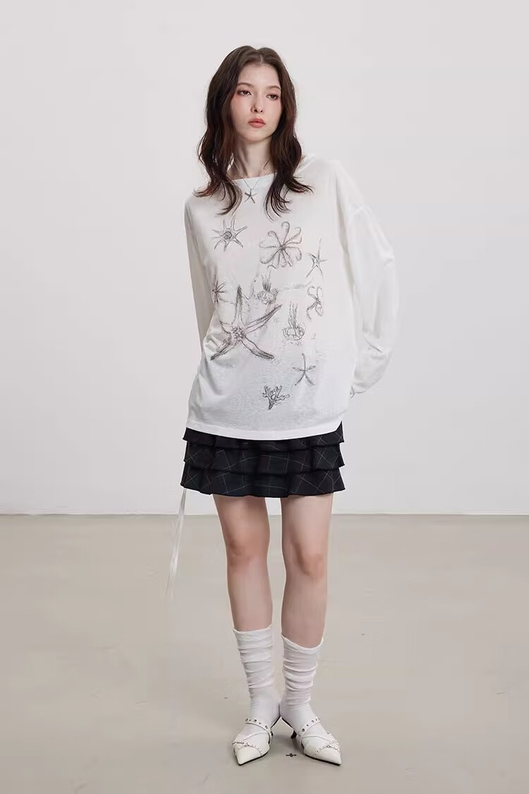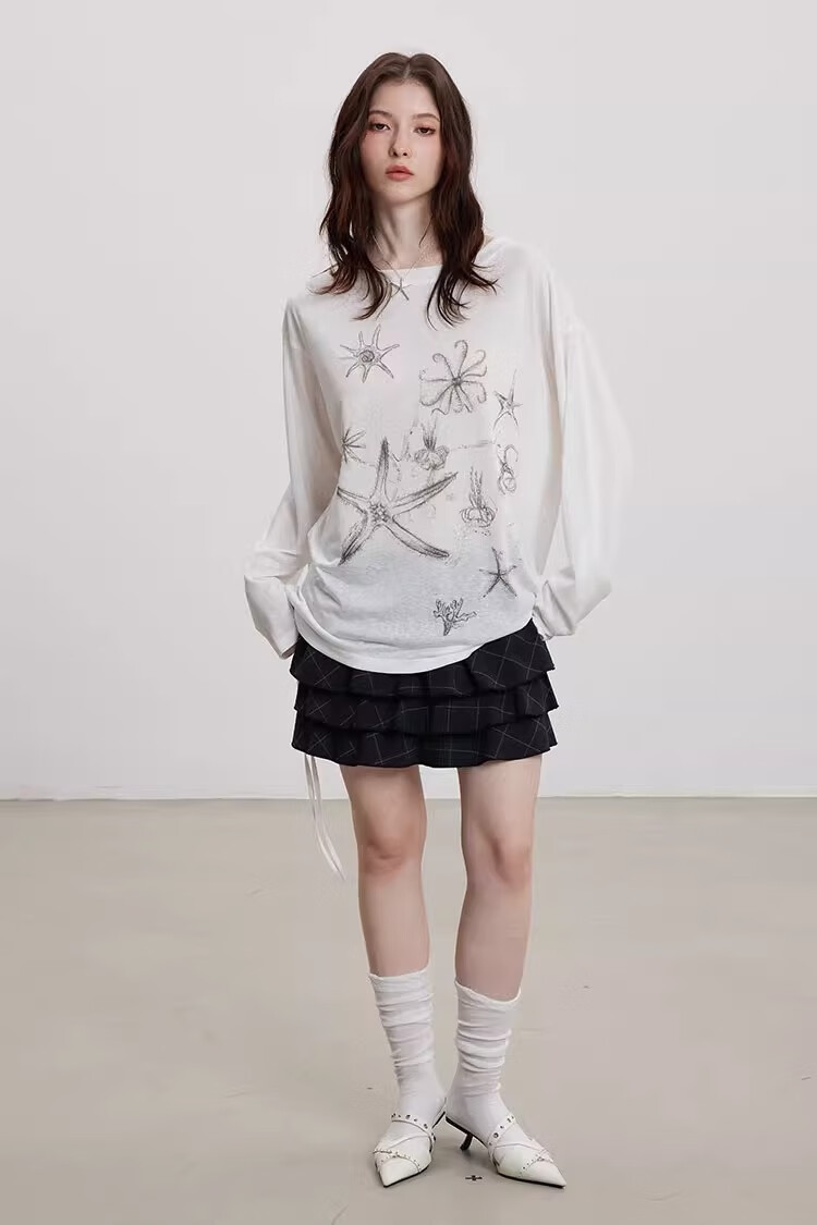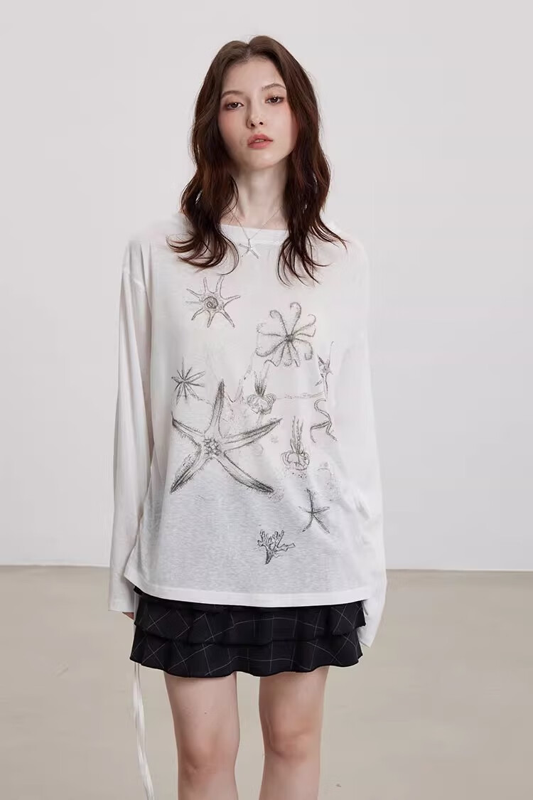 微透防晒罩衫长袖t恤女夏季薄款印花宽松显瘦上衣insGXXX96-60030 白色 L
