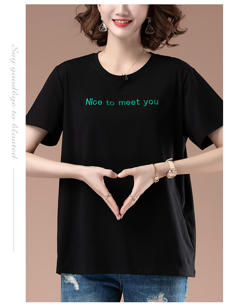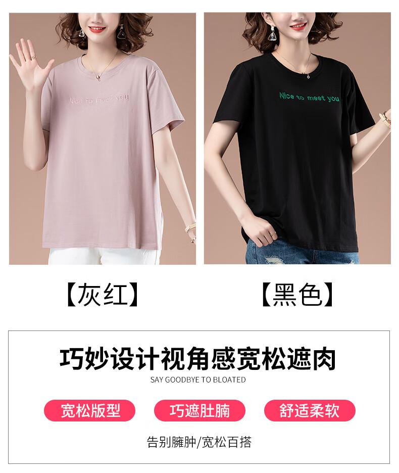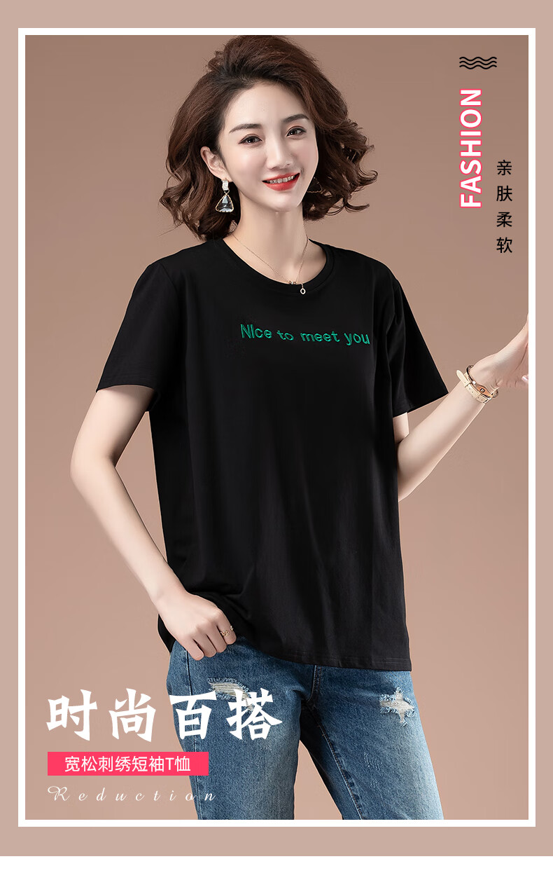 恒源祥夏天短袖t恤女加大码宽松刺绣女装纯棉体恤上衣中年妈妈打底衫女 黑色【9896款】 5XL 180-200斤