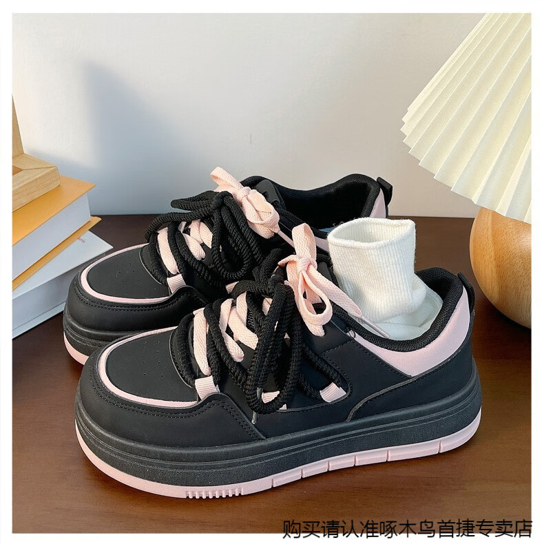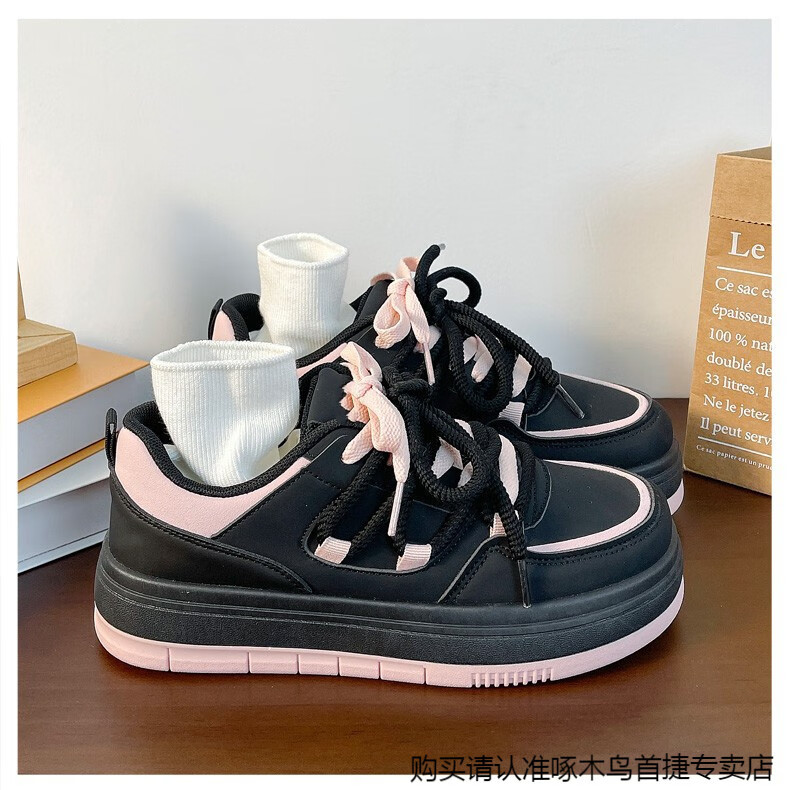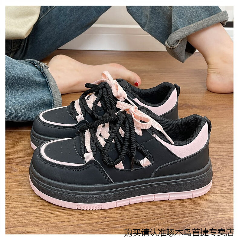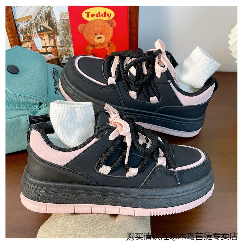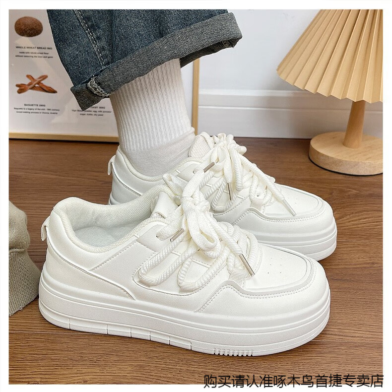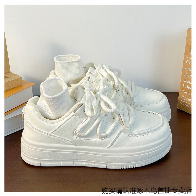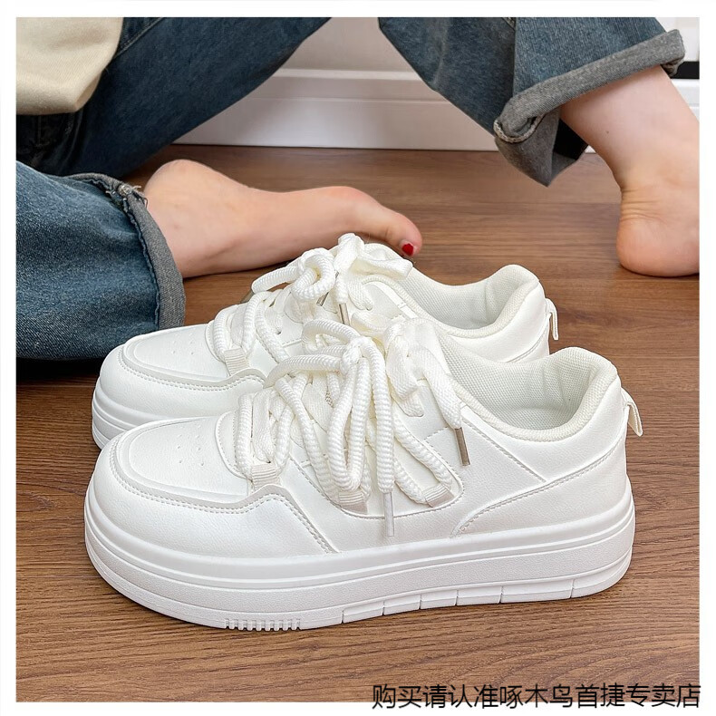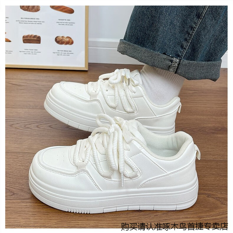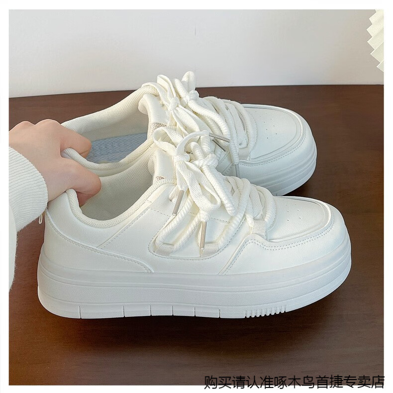 啄木鸟百搭松糕小白鞋女春夏季小众厚底板鞋2025新款增高休闲运动鞋 米白色 35
