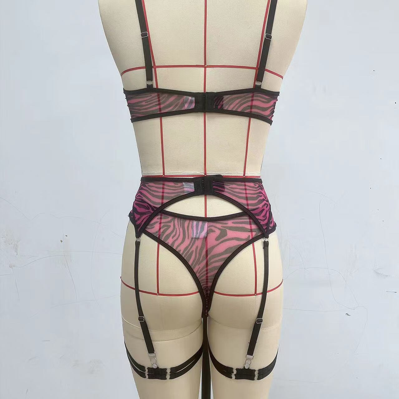 2023跨境欧美性感薄款豹纹文胸套装网布印花内衣女吊袜带ALX2089 红色 S