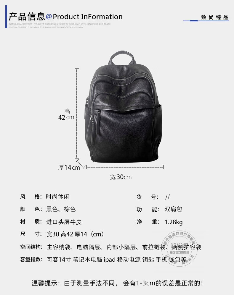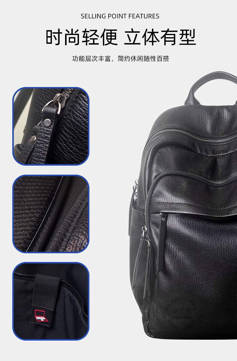 欧伦驰(OULUNCHI)轻奢高端真皮双肩包商务出差旅行男士电脑背包头层牛皮书包 黑色 30*14*42CM