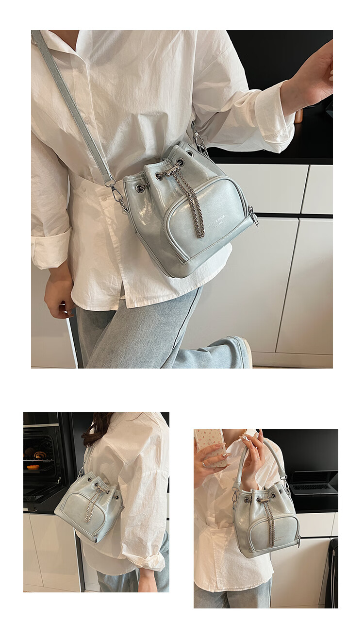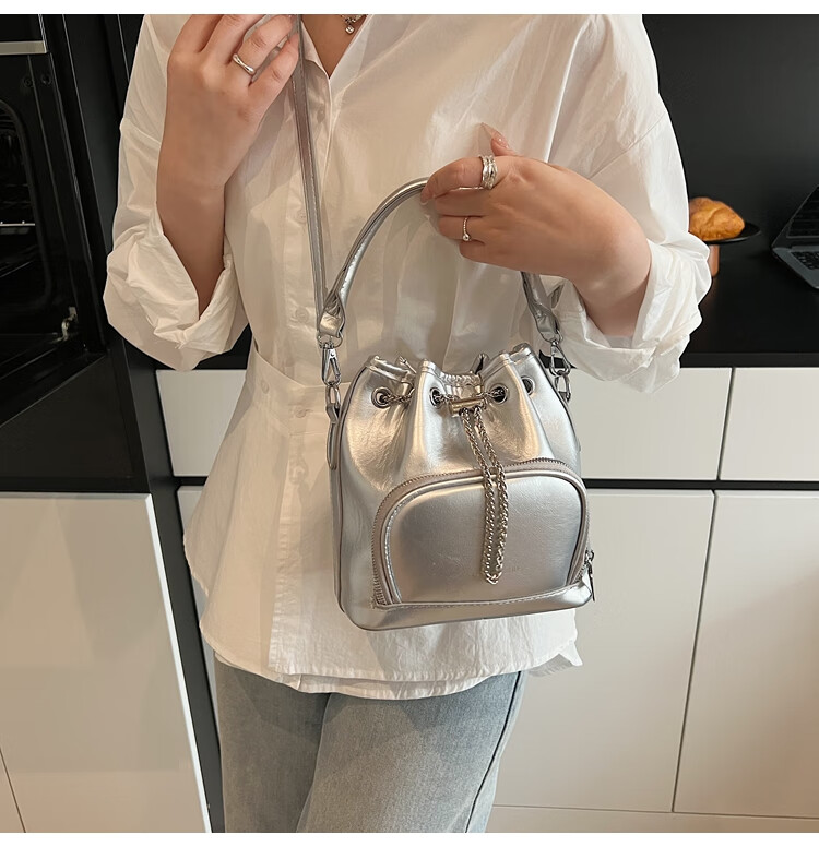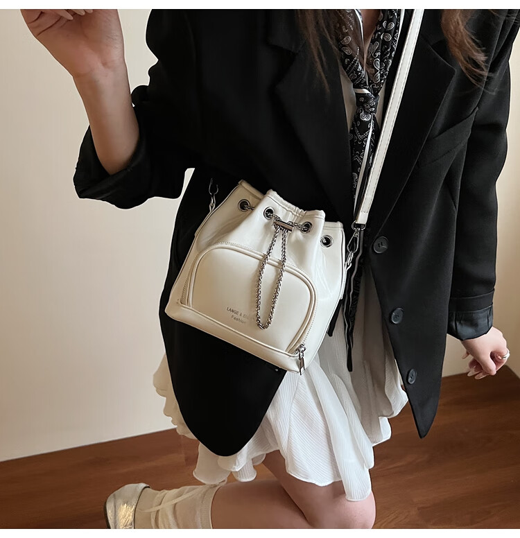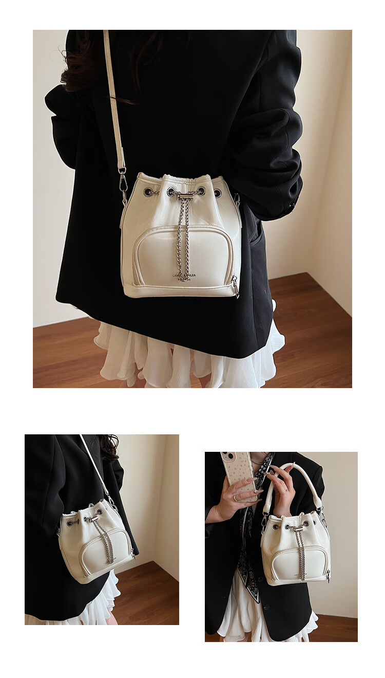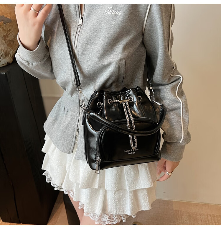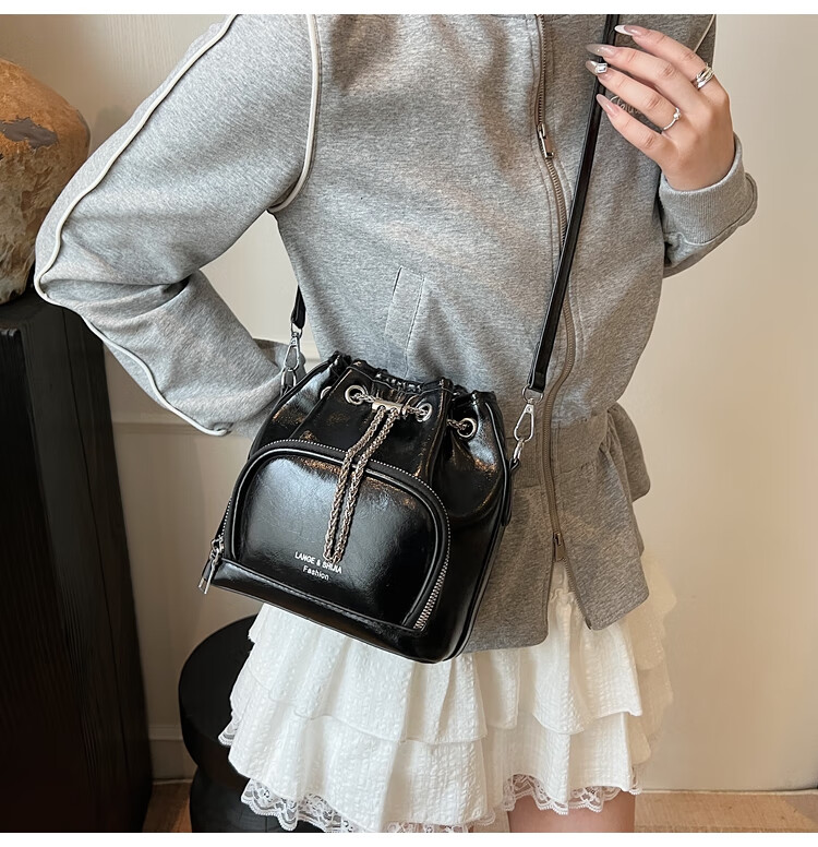 啄木鸟简约洋气抽绳手拎包包女式2025超火新款感流行单肩斜挎水桶包 黑色
